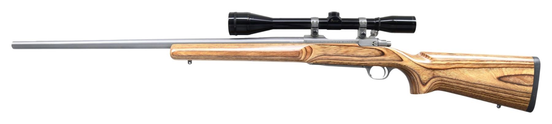 RIFLE WITH BENCHREST BURRIS SCOPE. Cal. 223 (223 Rem.). S# 782-43711. Shipped 1994 as M77VBZ MKII; Model 07890. Matte low glare stainless finish. Bbl. 26". Burris Fullfield, 12x, AO, target dot reticle scope on Ruger rings. Control feed action w/ claw extractor & matching numbered bolt; magazine has replacement alloy benchrest follower. Smooth brown laminate stock w/ sling studs & black pad. CONDITION: all aspects near excellent showing light wear. Scope has very good finish with serviceable optics. (25-2516/MD). MODERN. $500-800.