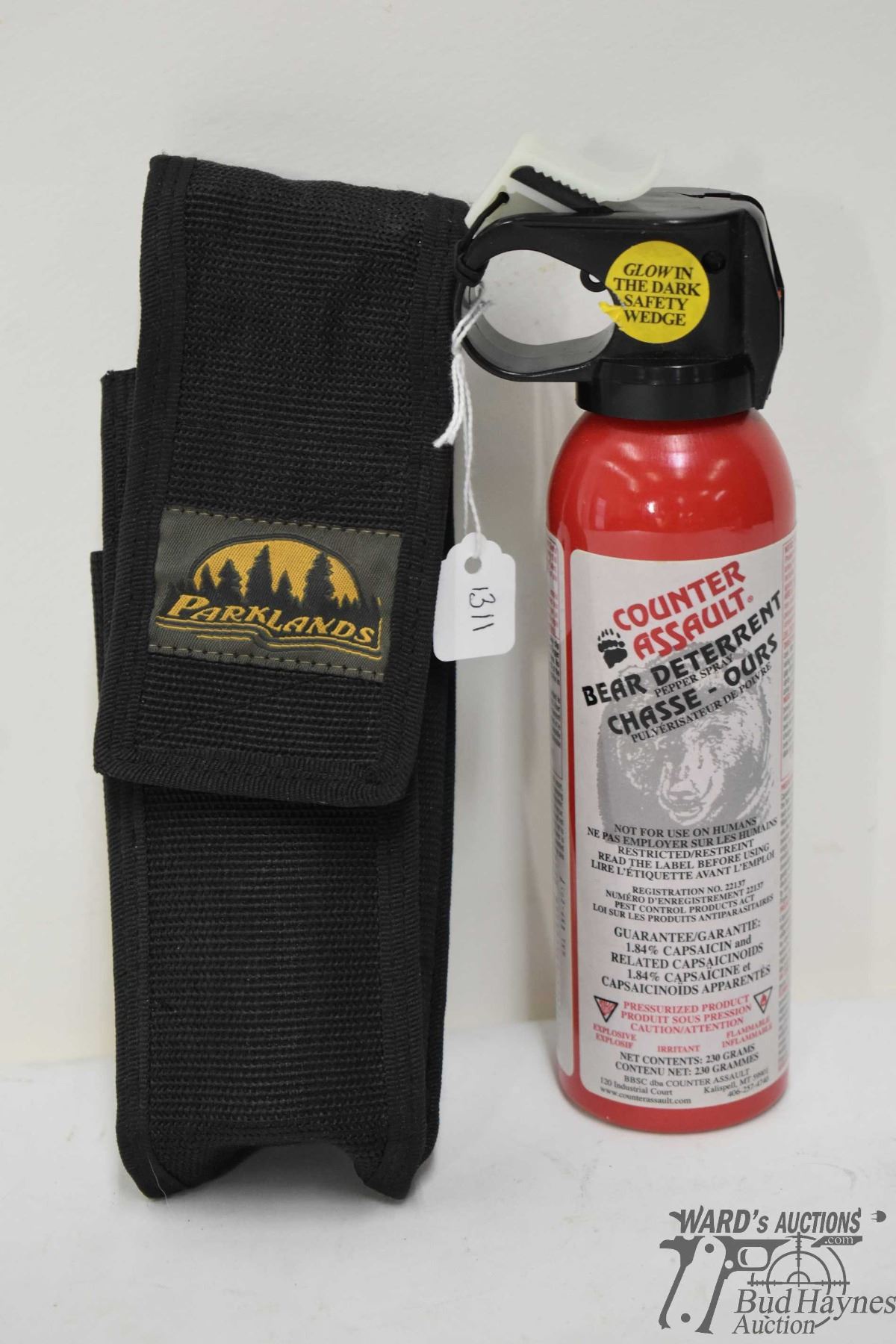 230 gr tin of Counter Assault Bear Deterrent and webbed case
