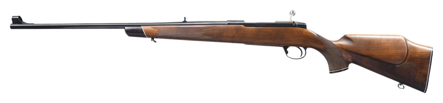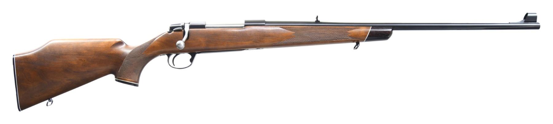 RIFLE. Cal. 270 Win. S# 645015. Mfg. 1970-1977; appears to be based on the Husqvarna 1900 rifle. Bbl. 24". Hooded bead front sight & folding leaf rear sight. Push feed action drilled for scope bases. Monte Carlo, checkered, walnut stock w/ rosewood forend tip, sling swivels, Carl Gustaf black plastic grip cap & buttplate. CONDITION: all aspects appear near excellent. (25-2444/MD). MODERN. $500-800.