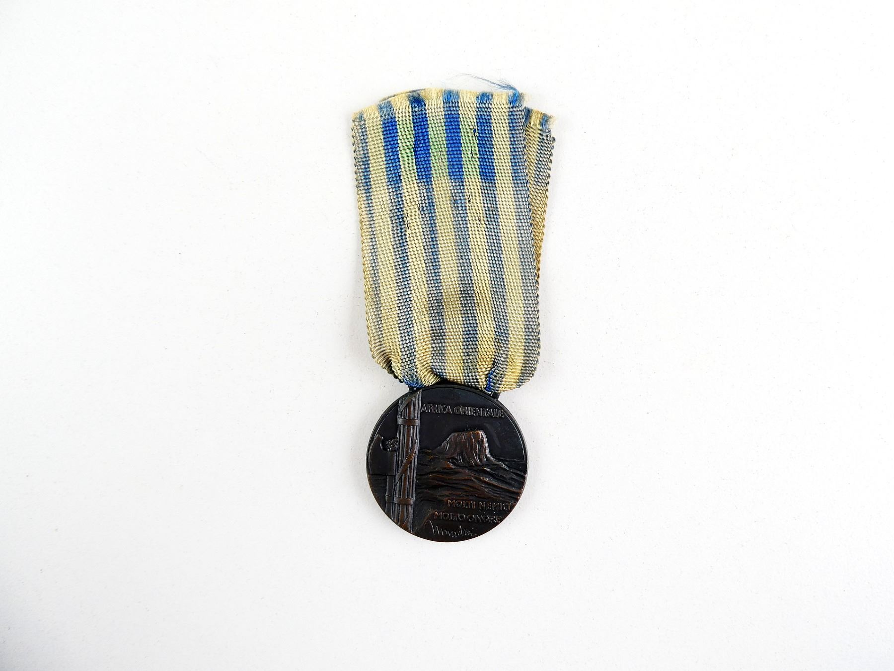 (1) FULL-SIZE BRONZE MEDAL WITH FADED RIBBON, MEDAL MARKED: "VITT EM III RE D'ITALIA IMP DI ETIOPIA", OTHER-SIDE MARKED: "AFRICA ORIENTALE", "MOLTI NEMICI, MOLTO ONORE" WITH MUSSOLINI'S SIGNATURE, ENGRAVER'S MARK: "V.PERRONE". SEE PHOTOS.