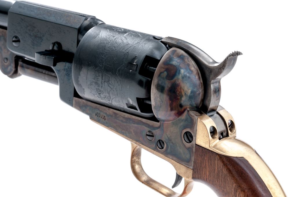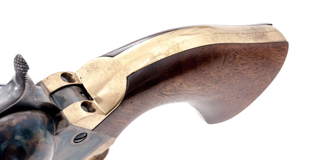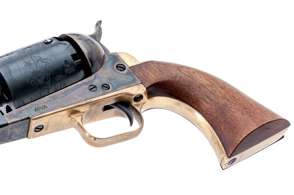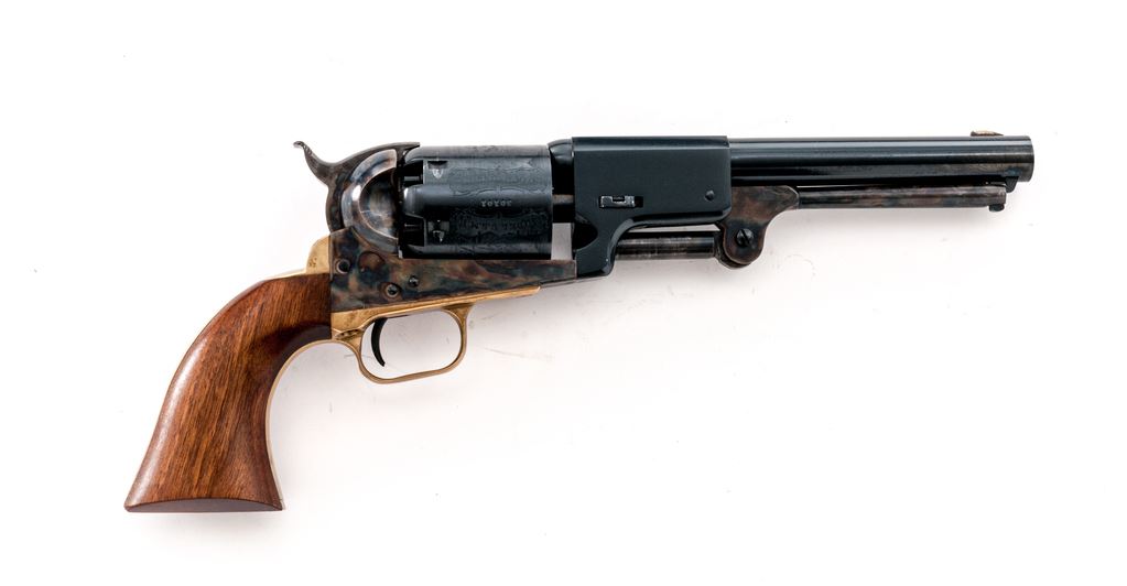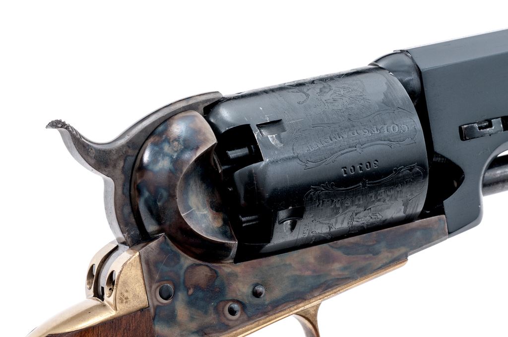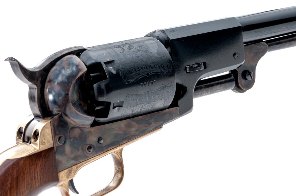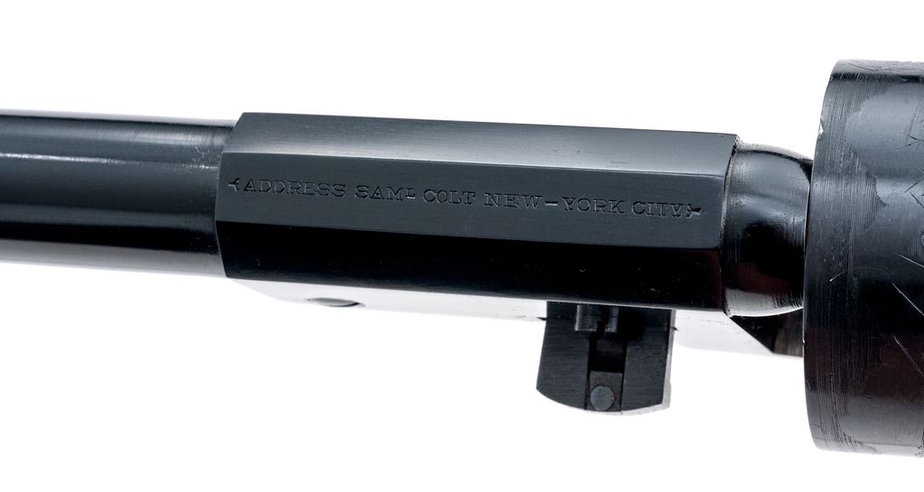 Second Gen. Colt Model 1848 3rd Model Dragoon Percussion Army Revolver, #30101, .44 cal., 7.5'' round-to-octagonal barrel with low-blade front sight, marked ''Address. Saml Colt New-York City'' on top flat; 6-shot round cylinder has the rolled ''Rangers and Indians'' fight scene, and ''Model U.S.M.R.'' and ''Colt's Patent'' in fancy scrolled panels with ''30101'' between; case hardened hammer, lever and frame with ''Colts/Patent'' in tiny letters on left side; brass backstrap and rounded trigger guard; oil-finished one-piece smooth walnut grips. Condition is new and unfired. Barrel and cylinder (with pristine safety pins on back) retain 100% deep blue (cylinder with light drag line); frame, lever and hammer have subtle but fiery case colors; brass with light toning; grips are smooth and unmarked. Action is very strong and crisp; bore is brilliant with sharp rifling, and retains all its original blue, as do the cylinder bores. Est.: $500-$700. (No FFL Required)