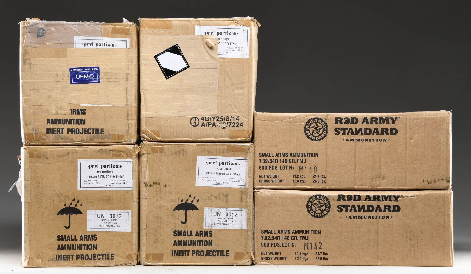 Six 500 rd. sealed cardboard cases. Cases contain 20 rd. boxes. No.1: Red Army Standard. Two 500 rd. cases. 148 grain full metal jacket. Steel cased ammunition. Lead core bullets. Berdan primed. Non-corrosive. No.2: Prvi Partizan PPU. Two 500 rd. cases. 150 grain soft point boat tail. Boxer primed. Brass cases. Non-corrosive. No.3: Prvi Partizan PPU. Two 500 rd. cases. 182 grain full metal jacket. Boat tail. Brass cases. Boxer primed. Non-corrosive. CONDITION: three cases were unsealed, three remain sealed. Cases have normal handling wear w/ legible markings. Ammunition appears clean & serviceable. (02-24270-13/RW). AMMO. $900-1,200.
