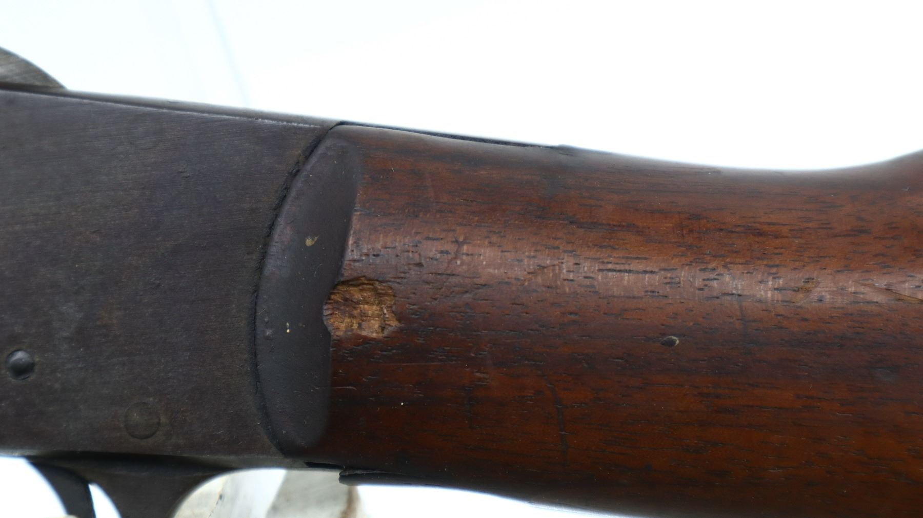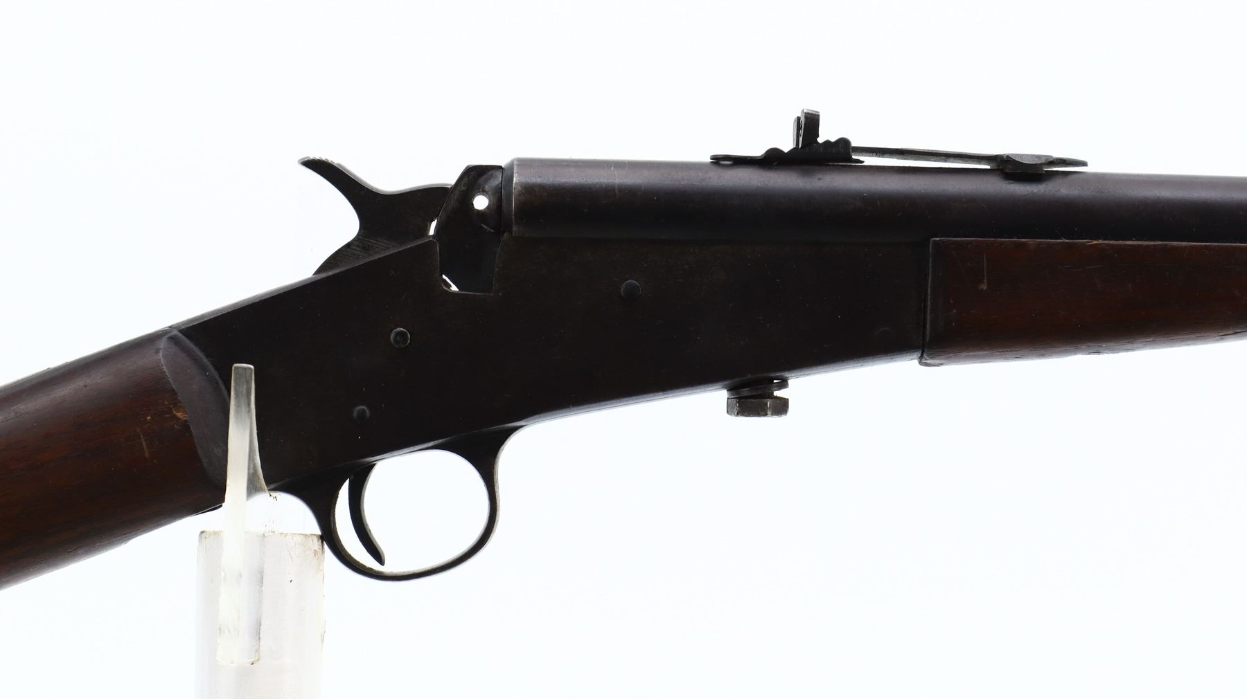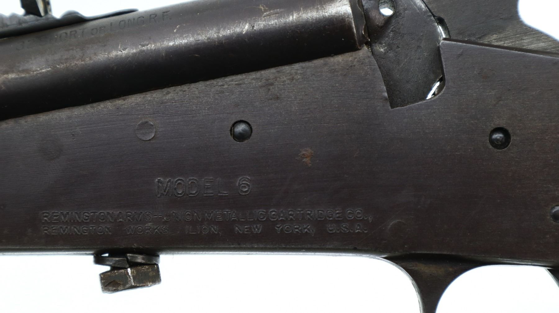 3/10, REMINGTON , MODEL: 6, CALIBER: 32 LONG RF , BORE IS GOOD WITH LIGHT PITTING, SOME SHINE. BLADE FRONT SIGHT. REPLACED U NOTCH REAR SIGHT. MISSING BREACH BLOCK OPENING LEVER. GROOVED HAMMER. TWO PIECE SMOOTH WOOD STOCKS. STRAIGHT GRIP. CRACKED AND CHIPPED BEHIND THE RECEIVER. SMOOTH STEEL BUTT PLATE. METAL FINISH HAS LIGHT RUST SPECKLES, SCRATCHES, HANDLING MARKS AND WEAR. STOCK SHOWS DINGS, SCRATCHES AND WEAR. ACTION: SINGLE SHOT DROP BLOCK RIFLE , BARREL LENGTH:20", SERIAL # N/A, CONDITION: 3/10, CLASS: CANADIAN NON RESTRICTED CLASS