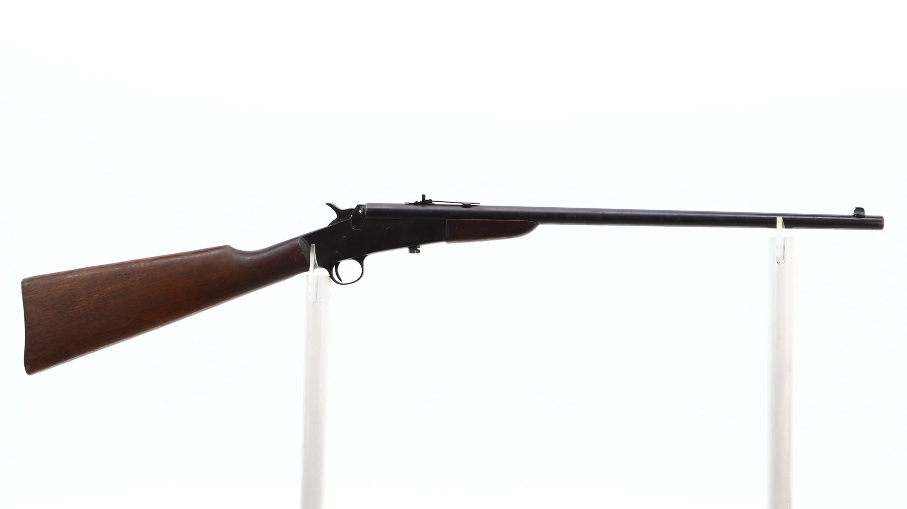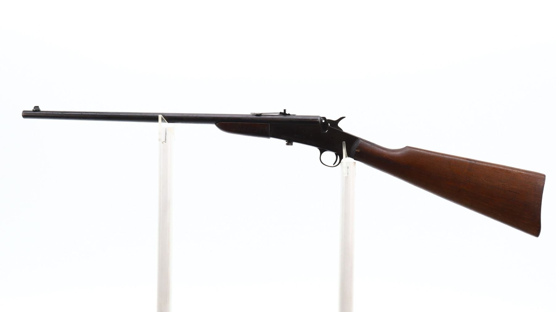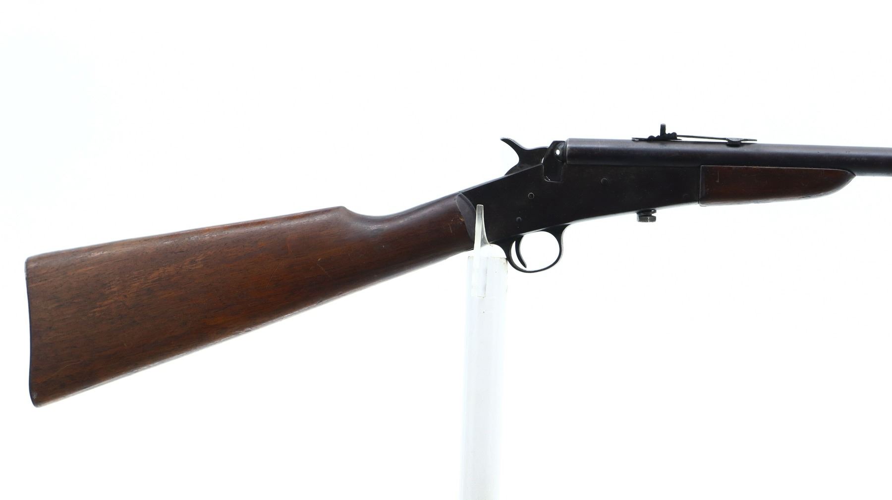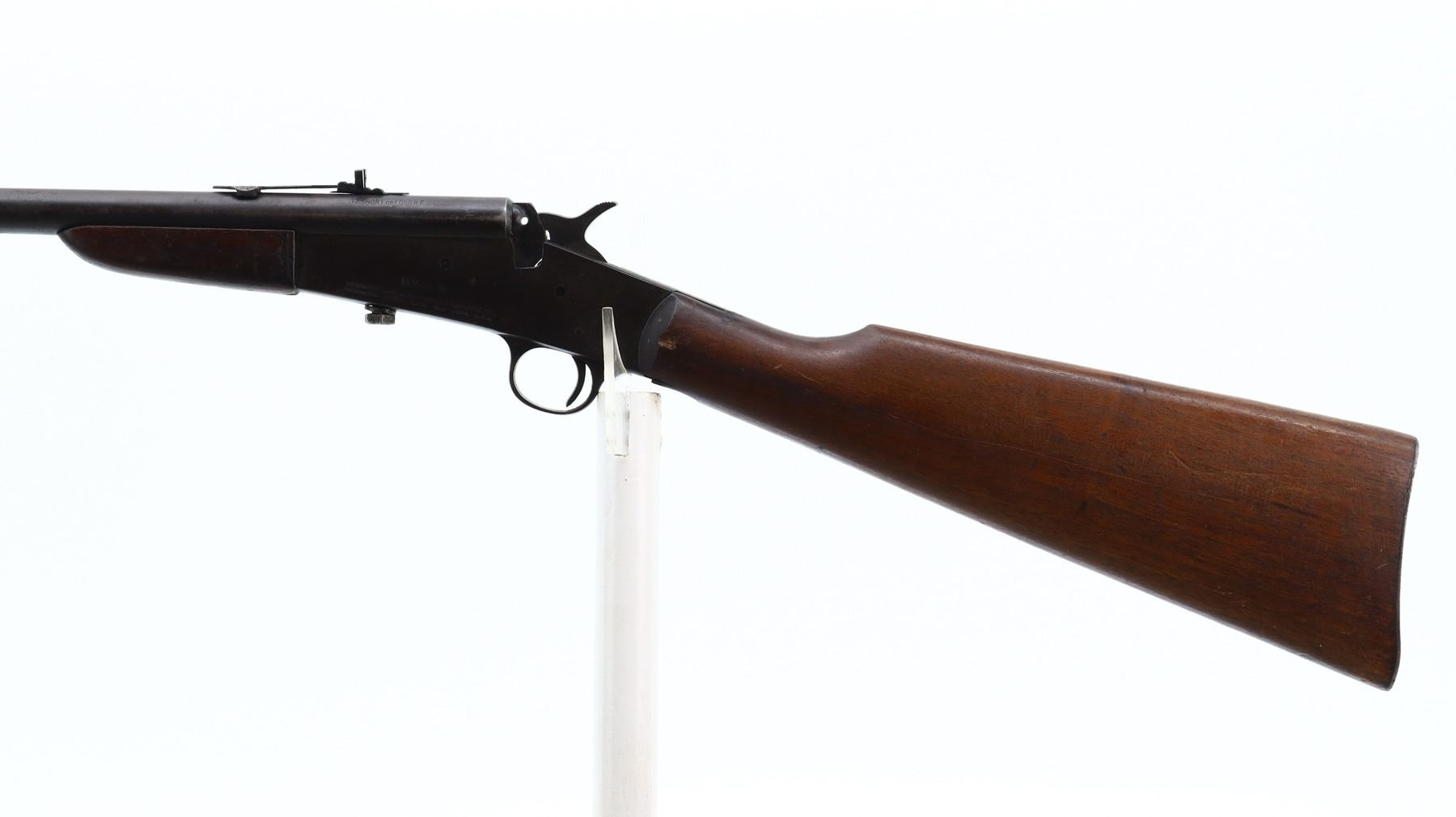 3/10, REMINGTON , MODEL: 6, CALIBER: 32 LONG RF , BORE IS GOOD WITH LIGHT PITTING, SOME SHINE. BLADE FRONT SIGHT. REPLACED U NOTCH REAR SIGHT. MISSING BREACH BLOCK OPENING LEVER. GROOVED HAMMER. TWO PIECE SMOOTH WOOD STOCKS. STRAIGHT GRIP. CRACKED AND CHIPPED BEHIND THE RECEIVER. SMOOTH STEEL BUTT PLATE. METAL FINISH HAS LIGHT RUST SPECKLES, SCRATCHES, HANDLING MARKS AND WEAR. STOCK SHOWS DINGS, SCRATCHES AND WEAR. ACTION: SINGLE SHOT DROP BLOCK RIFLE , BARREL LENGTH:20", SERIAL # N/A, CONDITION: 3/10, CLASS: CANADIAN NON RESTRICTED CLASS