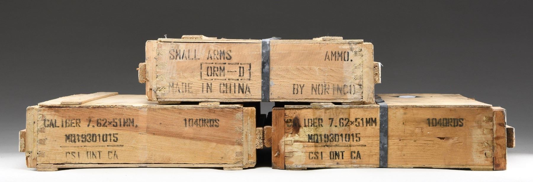 Ammunition is contained in three wooden crates of 1,040 rds. each. Each crate contains two sealed "spam cans" holding 520 rds. The galvanized cans are marked "7.62X51 / BALL / 520 ROUNDS / 76-92-61". CONDITION: ammunition not inspected due to sealed nature of the cans. Crates are in good condition w/ legible markings, but have handling wear, cracking & splintering. One crate has been opened to inspect the sealed cans. (02-24270-8/RW). AMMO. $800-1,200.