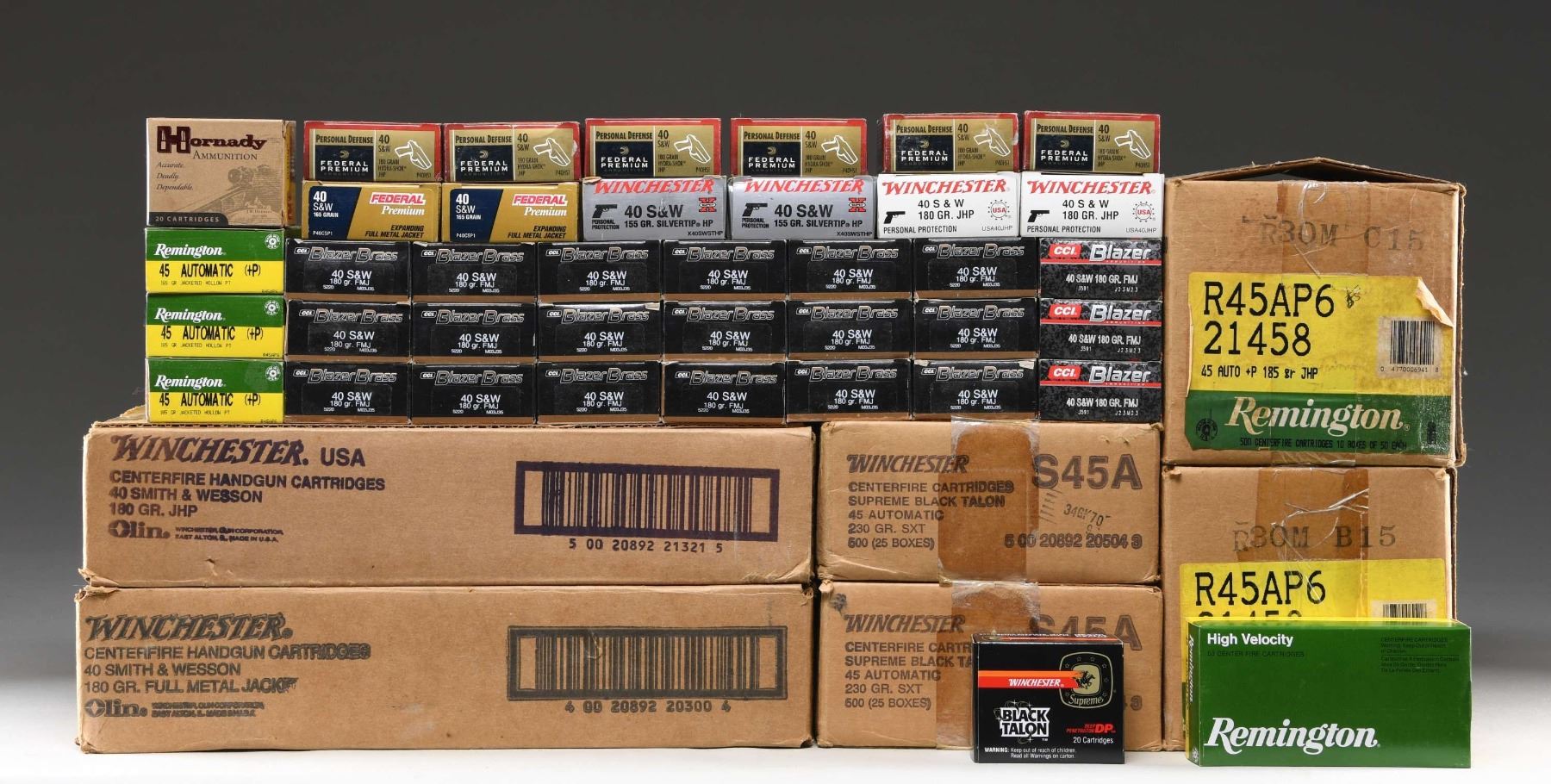 Lot contains hollow points. Cal. 45 ACP. No.1: Winchester Black Talon. 50 boxes of 20 rds. Black boxes are marked "230 GRAIN SXT DEEP PENETRATOR HOLLOW POINT". No.2: Remington (+P). 23 boxes of 50 rds. 185 grain jacketed hollow point. Cal. 40 S&W. No.1: CCI Blazer Brass. 18 boxes of 50 rds. 180 grain full metal jacket. No.2: CCI Blazer. Three boxes of 50 rds. 180 grain full metal jacket. No.3: Federal Premium Personal Defense. Six boxes of 20 rds. 180 grain hydrashok jacketed hollow point. No.4: Federal Premium. Two boxes of 50 rds. 165 grain expanding full metal jacket. No.5: Winchester. Two boxes of 50 rds. 155 grain silver tip hollow point. No.6: Winchester. Two boxes of 50 rds. 180 grain jacketed hollow point. No.7: Hornady Custom. One box of 20 rds. 180 grain JHP-XTP. CONDITION: boxes have light handling wear. Ammunition appears clean & serviceable. (02-24270-24/RW). AMMO. $900-1,200.