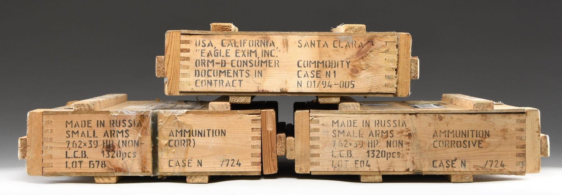 Lot contains hollow points. Ammunition is packed in three wooden crates, each of which contain two sealed green "spam cans" of 660 rds. each & include one can opener. Wooden crate markings include "7.62X39 HP / L.C.B.(indicating lead core bullets) / NON-CORROSIVE AMMUNITION". CONDITION: ammunition not examined due to sealed nature of the containers. Containers in crates are in good condition w/ the expected handling wear, small splinters & cracks. (02-24270-5/RW). AMMO. $1,200-1,500.