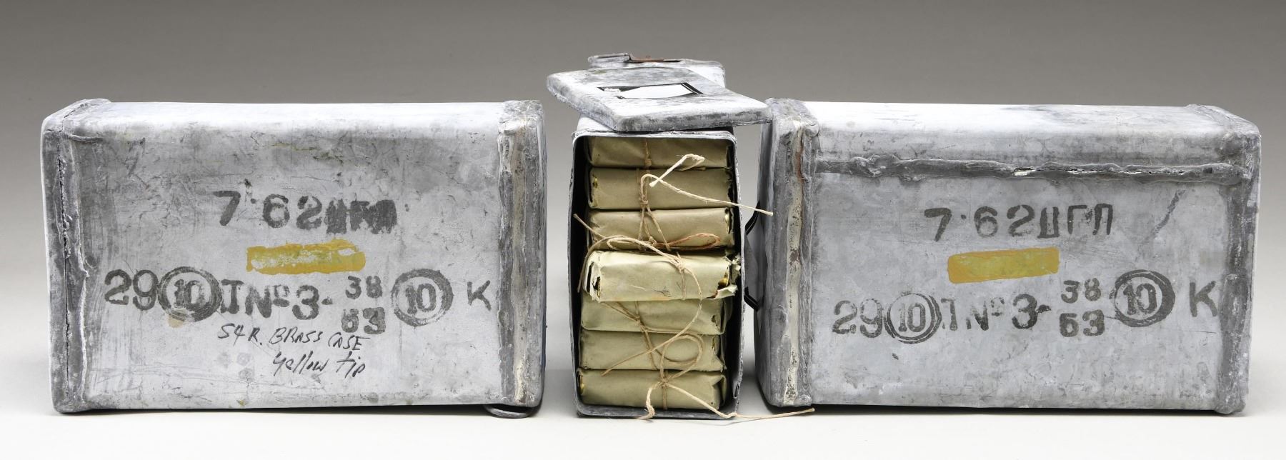 Approx. 900 rds. of brass case, yellow tip ammo. 1 Can is open showing that the ammo is paper wrapped with headstamp "10 / 55". CONDITION: 2 sealed cans as is showing wear & black marker writing. Ammo from opened can appears serviceable. (02-23902-2/MD). AMMO. $400-600.
