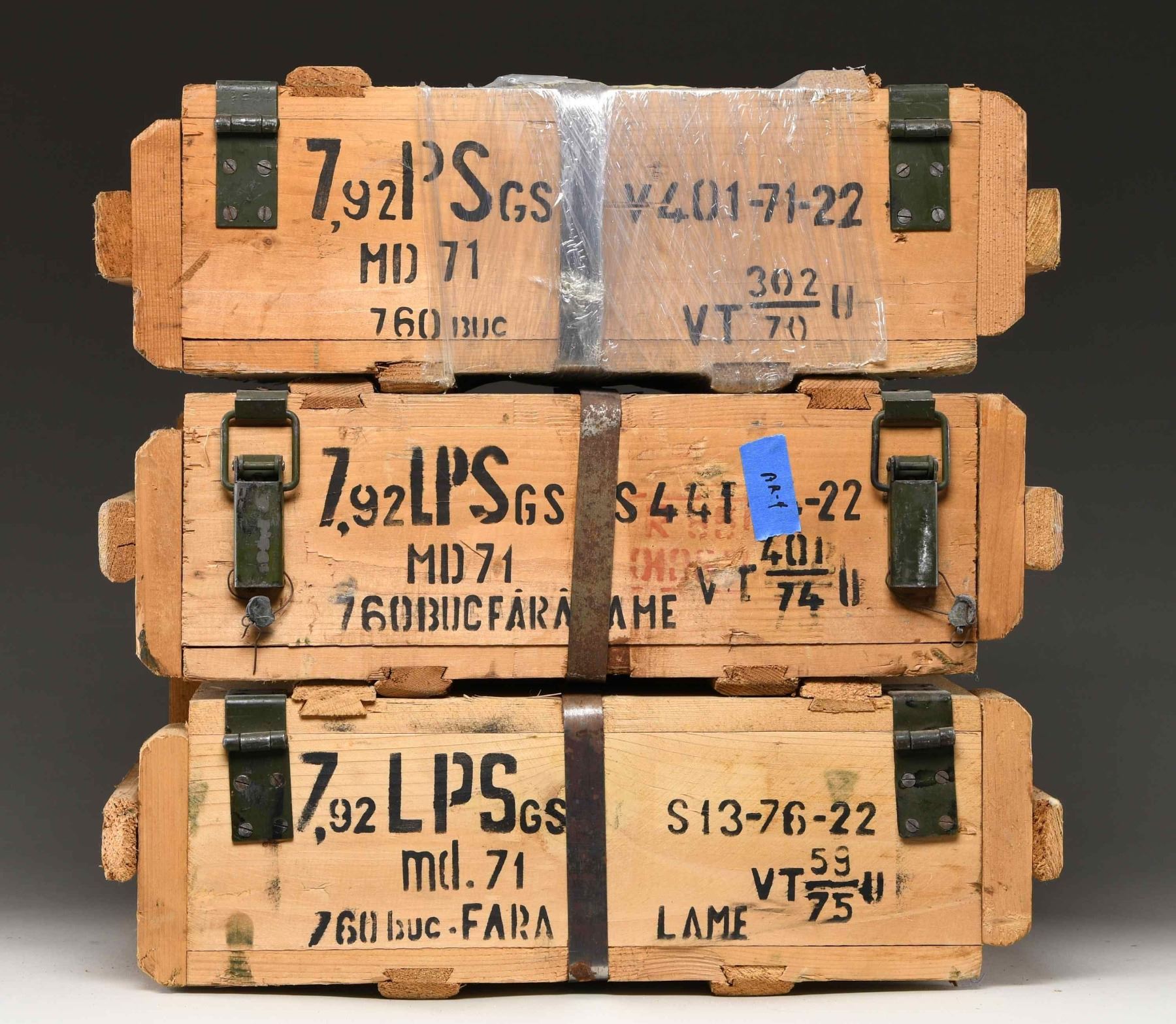 AMMO. 2,280 rds. of 150 gr., lacquered steel cased, Berdan primed, FMJ ammo. CONDITION: crates are sealed with ORMD stickers, blue tape & handling marks. (02-24857-1/MD). AMMO. $500-750.