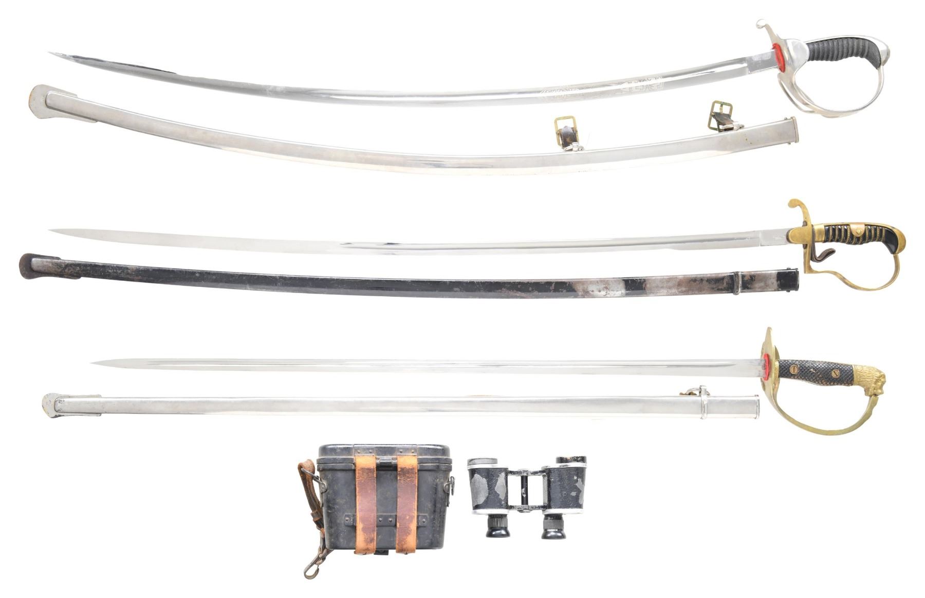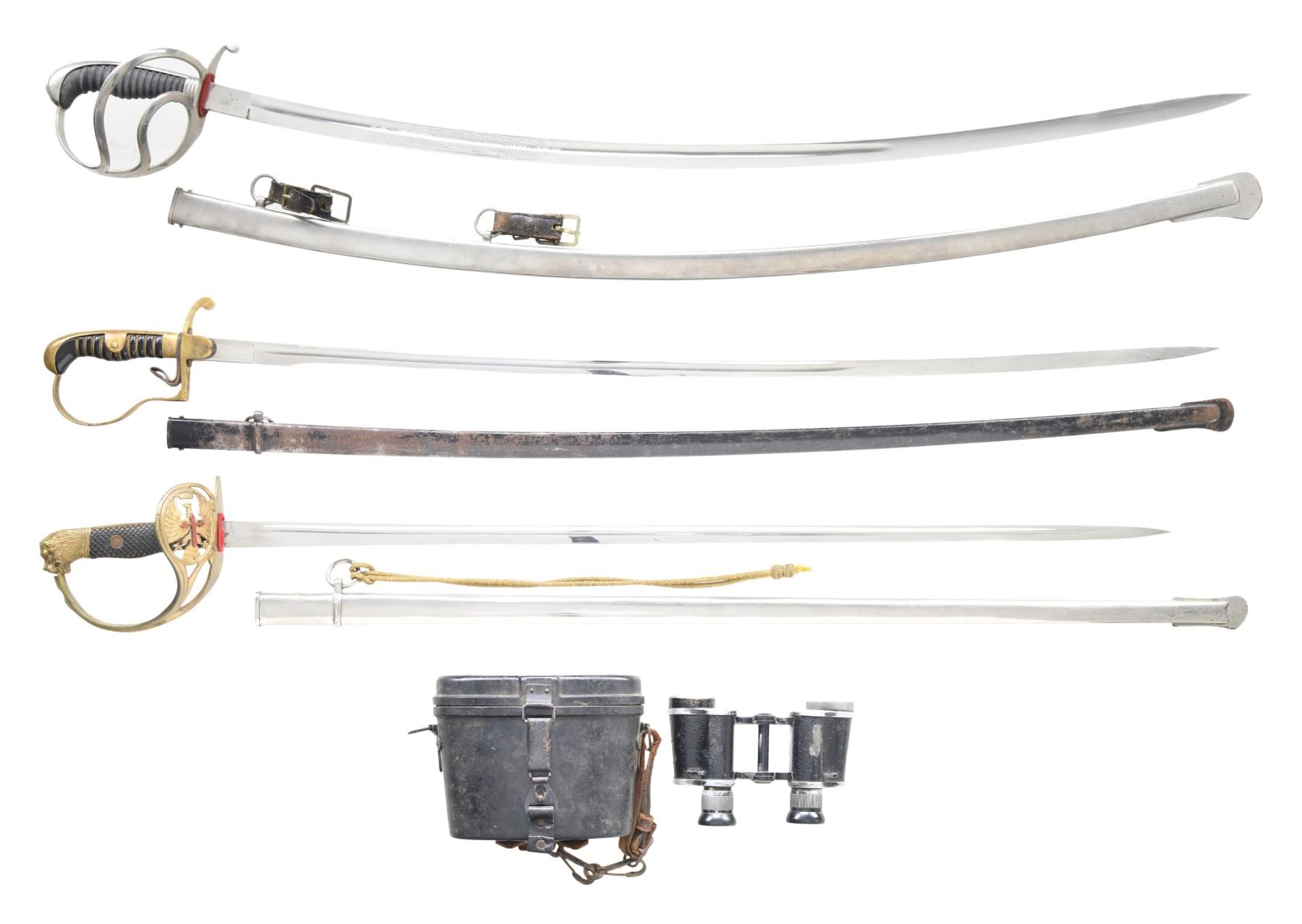 This lot includes 1 / Imperial German officer's sword measuring 41 1/4' over all with a plain 35 1/2' blade marked "ADOLF BRAUN BERLIN". Plain gilded brass hilt with wire wrapped black composite grip and black enameled iron scabbard. 1 / Post WWII Spanish officer's sword with a plain single fullered blade marked "FABCA DE TOLEDO" on the spine. Semi-basket guard with the Spanish eagle & cross topped by a lion head pommel. Two piece wood grip and plated scabberd. 1 / Bavarian officer's sword measuring 39 1/2" overall with a 33 1/4" blade etched "IN TREUE FEST" and marked " (logo) C K Co" for Carl Kaiser & Co. Plated semi-basket guard, bird head pommel and shark skin grip. Plated scabbard. 1 / A pair of binoculars in a hard plastic case. Binoculars are marked with a script name over "BRAUNSCHWEIG" & "Dienstglas 6 x 30 16225 H/6400". Case has a partial leather strap. CONDITION: All swords generally show light wear, but the Imperial German sword has moderate wear to the scabbard finish, Binoculars are servicable. (02-24494-4/BF). $500-700.