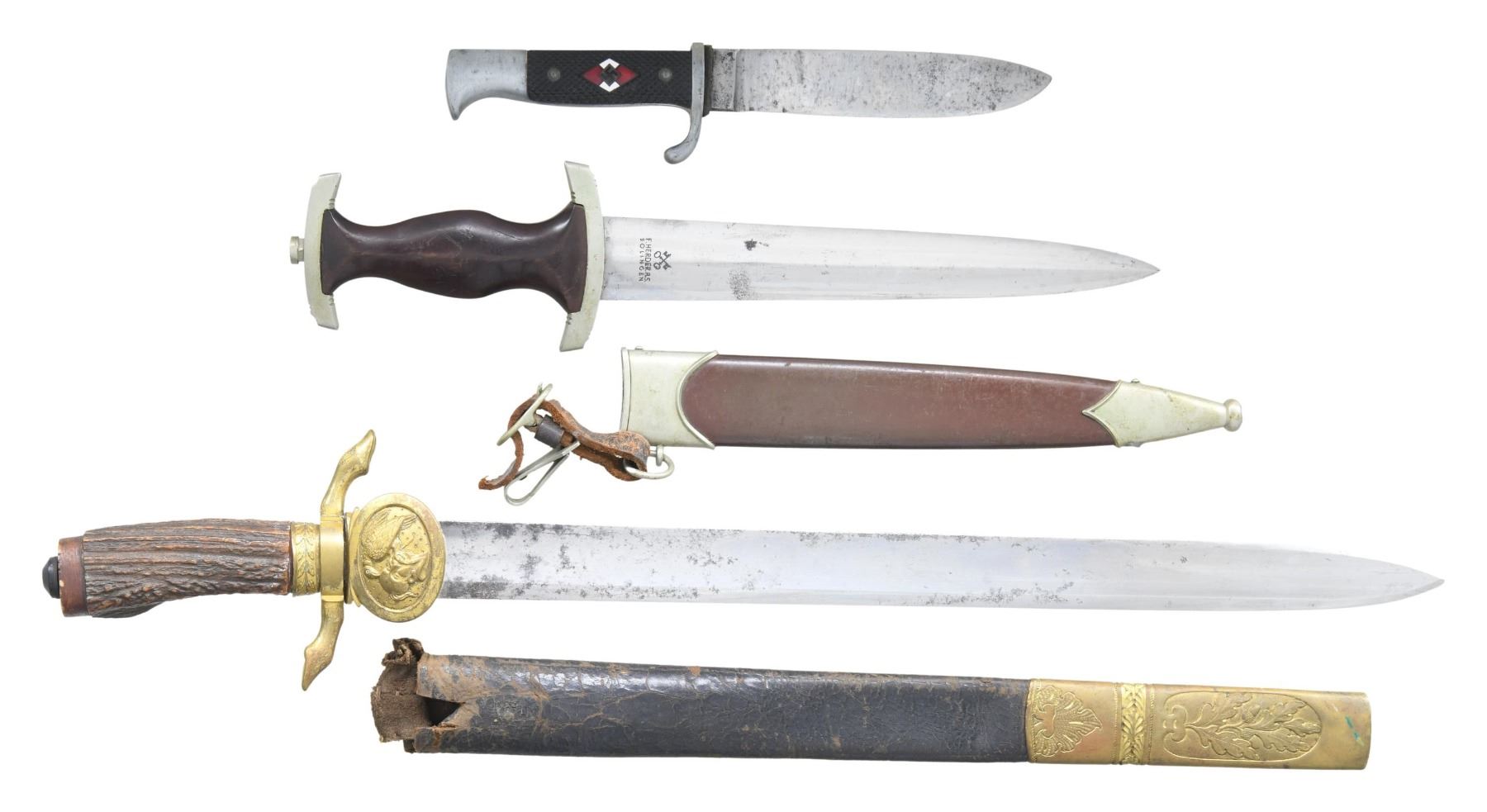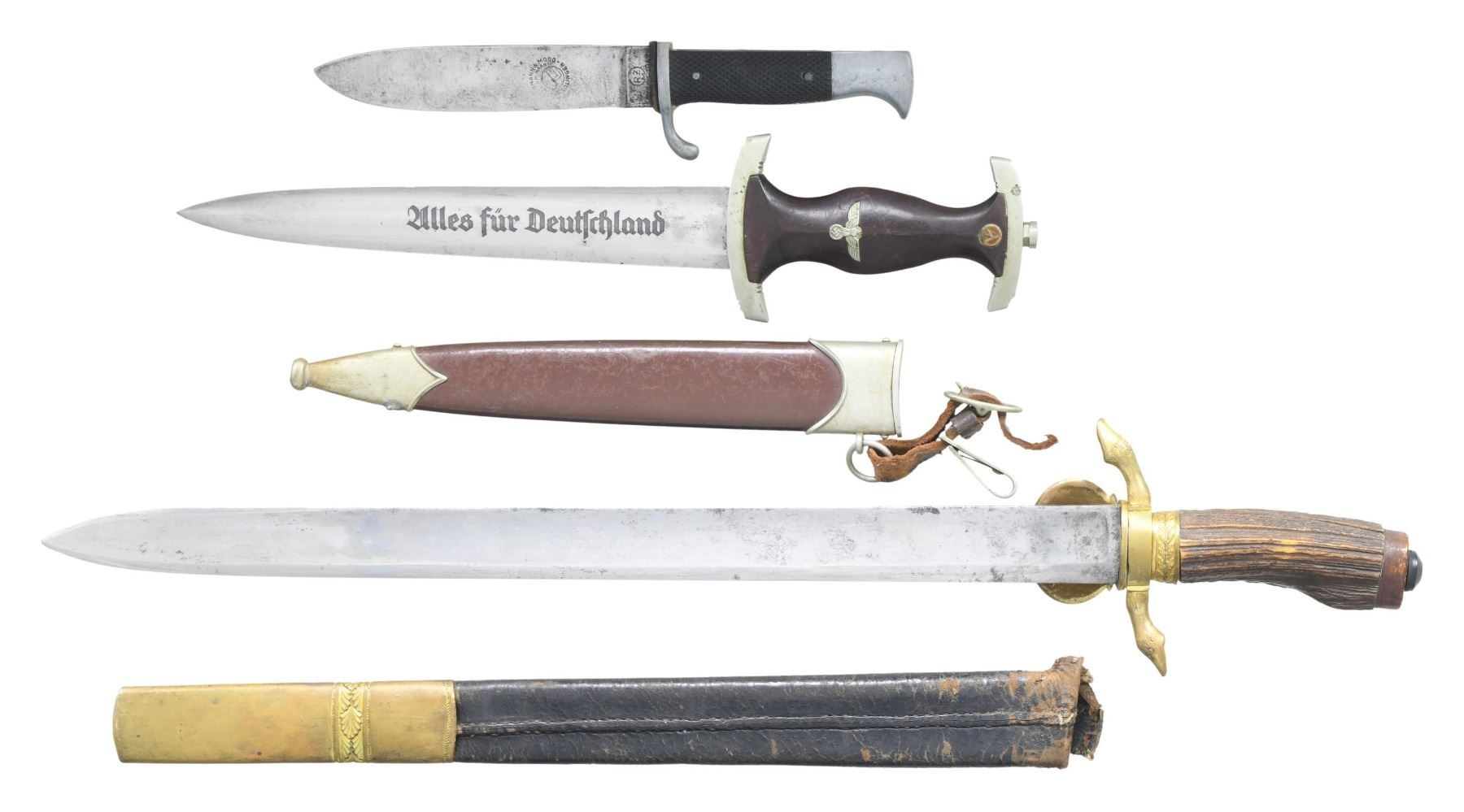 1) HJ. A good example of a HJ belt knife with a plain blade marked on the reverse " RZM M 7/29 1942" & " KLITTERMANN & MOOG G.m.b.H. HAAN (logo) SOLINGEN". Plated crossguard and pommel with 2 piece black checkered grips featuring an enameled HJ diamond in the front grip. No sheath. CONDITION: light to moderate wear throughout. 2) SA. A fine example of an SA dagger with a blade etched " Alles fur Deutschland " on the front and marked " (logo) F. HERDER A.S, SOLINGEN". Nickel silver crossguard stamped on the back "Wm" and a similar pommel guard. Brown wooden grip with eagle and enameled SA button. Brown anodized scabbard with leather hanger. CONDITION: blade shows primarily scabbard wear with a few tiny stains. Hilt shows generally light wear. Scabbard shows light wear with a dented button at the tip. Hanger is dry. 3) HUNTING SWORD. Nice exmple of an imperial hunting sword measuring 21 7/8" overall with a 17" blade. The gilded down turned guard features a crow with a severed head and the crossguard terminates with horse's hooves. Antler grip with a missing pommel cap. Gilded brass mounted leather covered scabbard is missing its throat. CONDITION: good blade with a touch of staining.Hilt shows light wear. Scabbard is a bit rough. (02-24086/BF). $500-800.