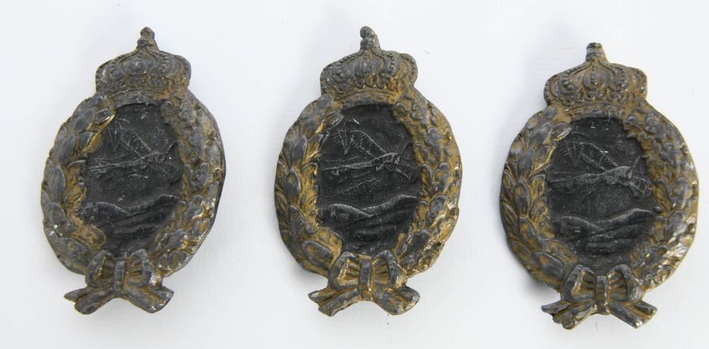Bavaria. Lot contains three Germany WWI Wings Pilot Badge / Pin appear to be from the Kingdom of Bavaria. Constructed of silvered bronze type material, the obverse consisting of an oval laurel and oak leaf wreath, joined together at the bottom ribbon, topped by a Bavarian royal crown, around a central depiction of a monoplane flying over a rural landscape, the reverse with a vertical pinback, unmarked, please refer to pictures to determine authenticity, these may be a replica of the original badge?????. they measure approx 2.5" x 1.5"
