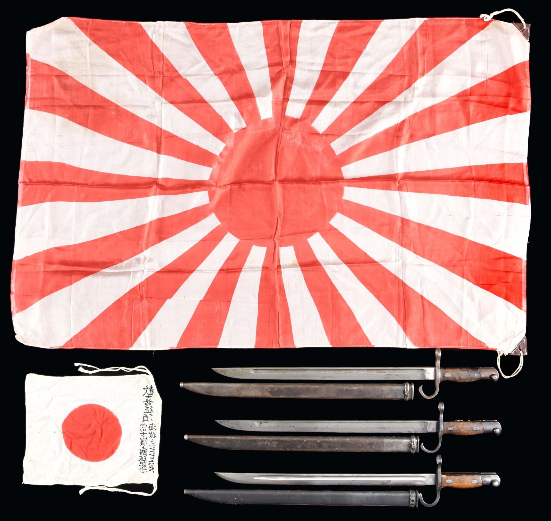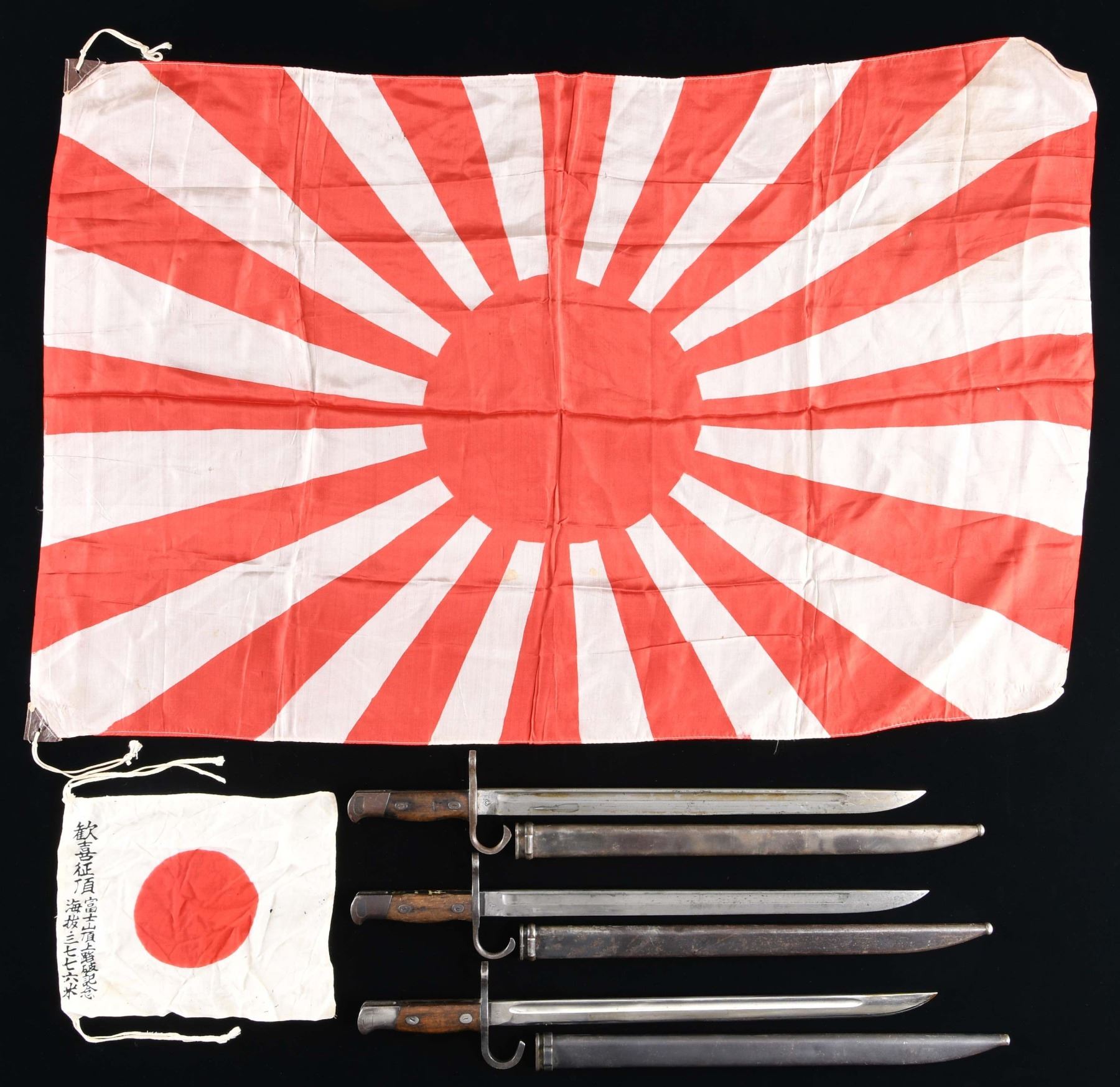 This lot consists of 2 / Japanese Arisaka bayonets with scabbards fron the Kokura Arsenal. 1 / Japanese bayonet and scabbard from the Mukden Arsenal. 1 / Small cotton hinomaru type flag measuring approx 9 1/2' x 8" with Japanese writing on the edge. 1 / Rising sun style silk flag measuring approx 36" x 22 1/2". CONDITION: bayonets show light overall wear and the flags show very light overall wear. (02-24499-5/BF). $400-600.
