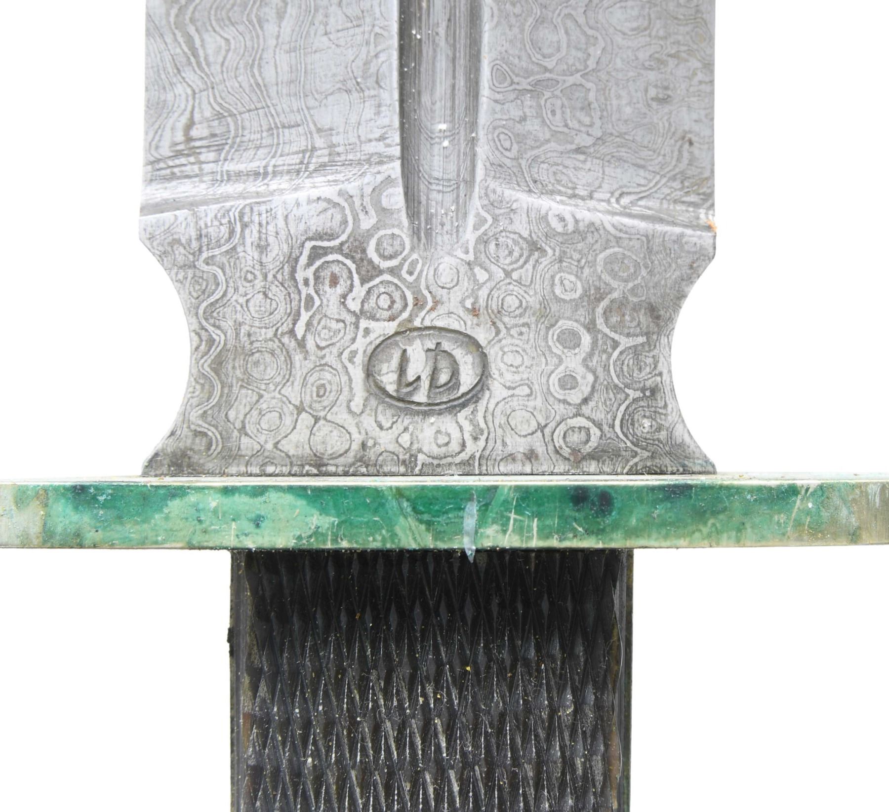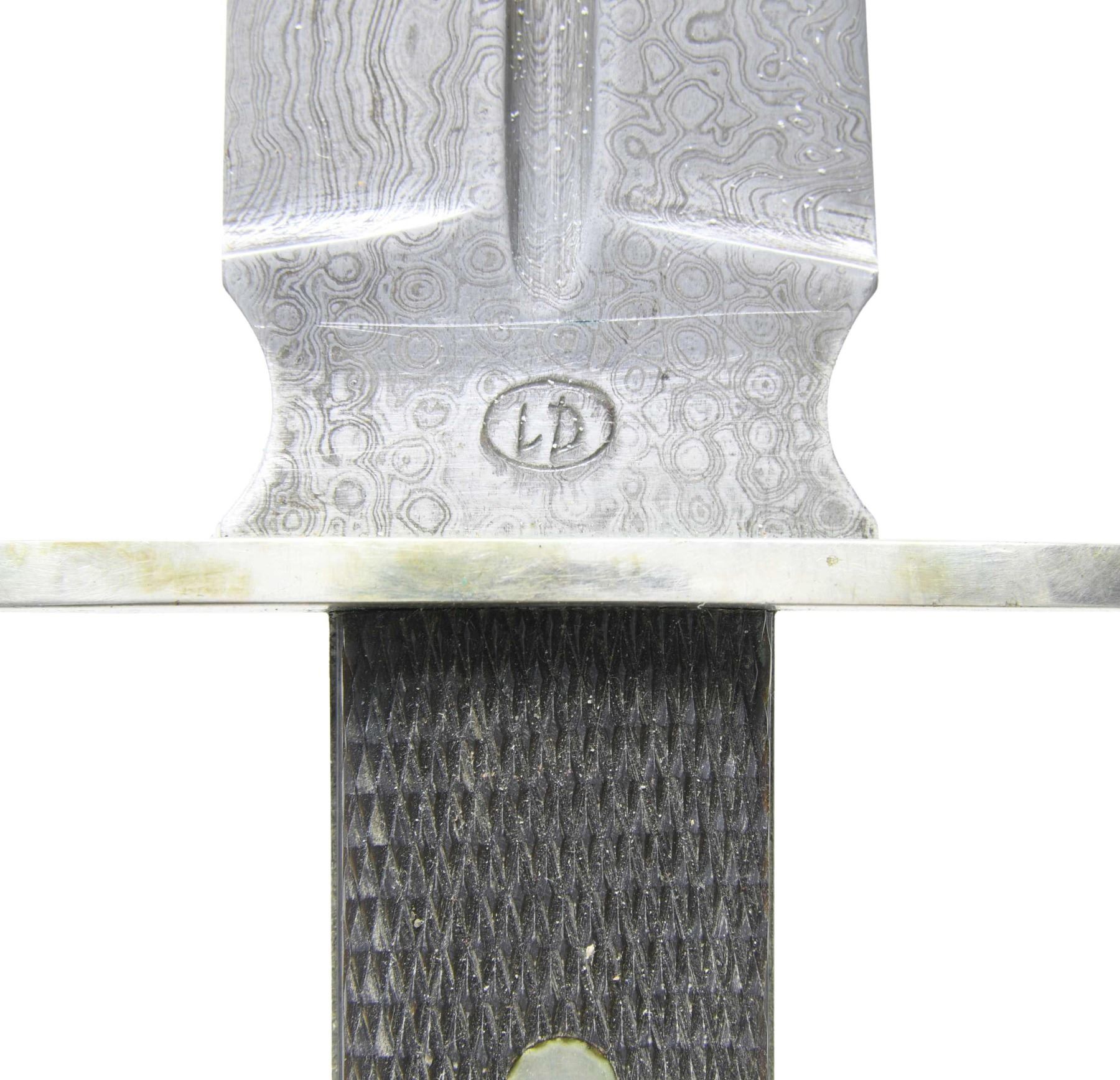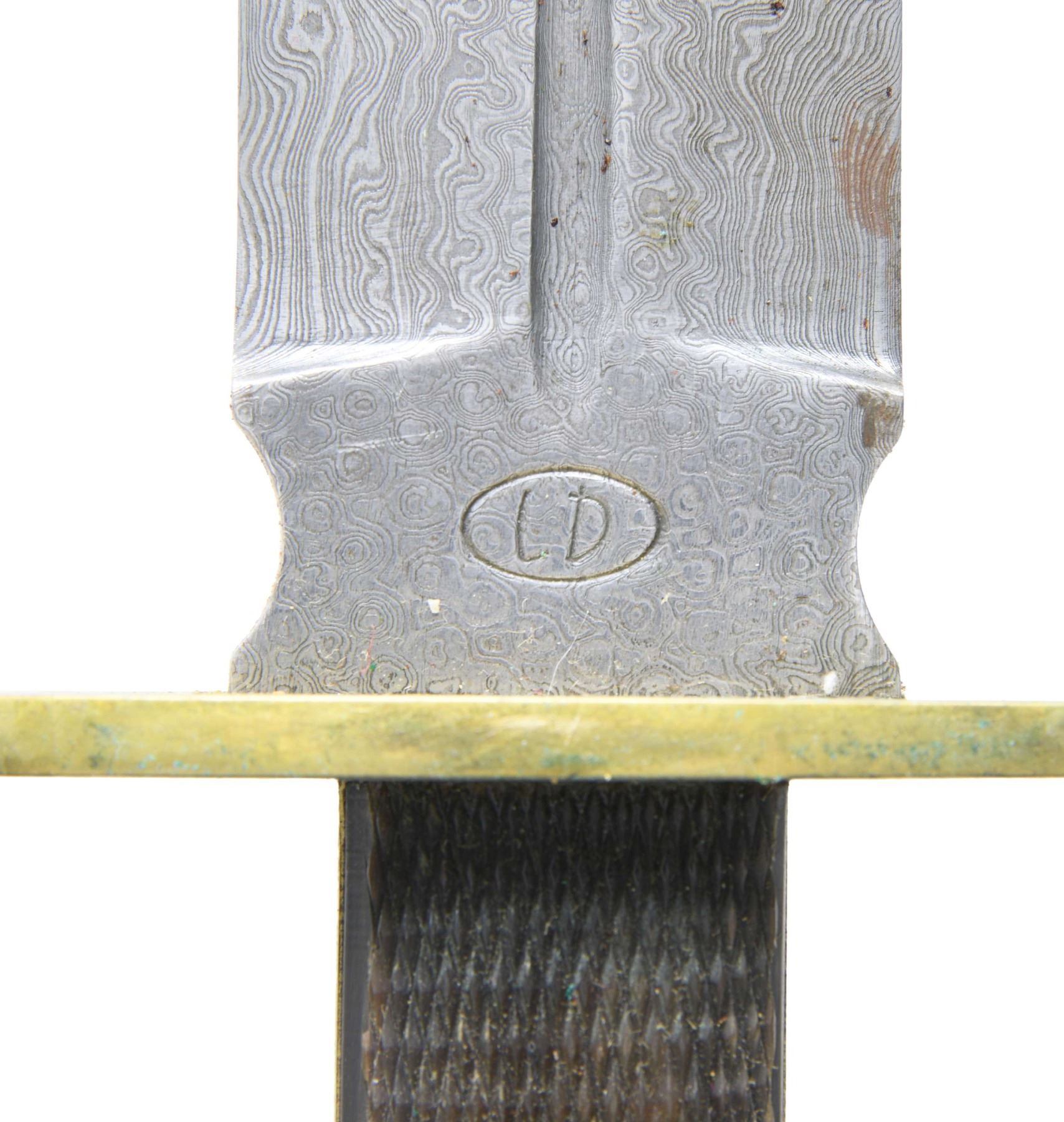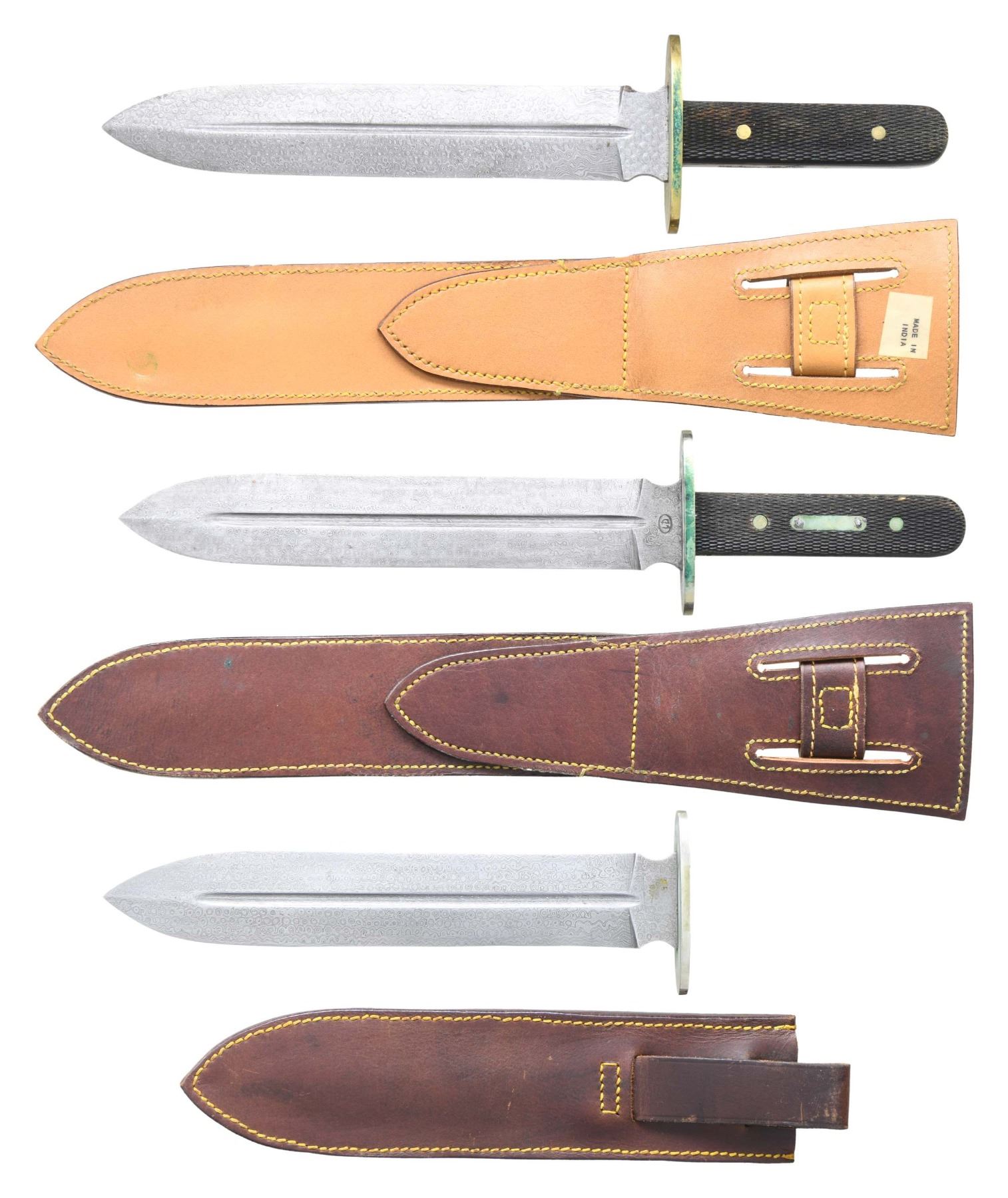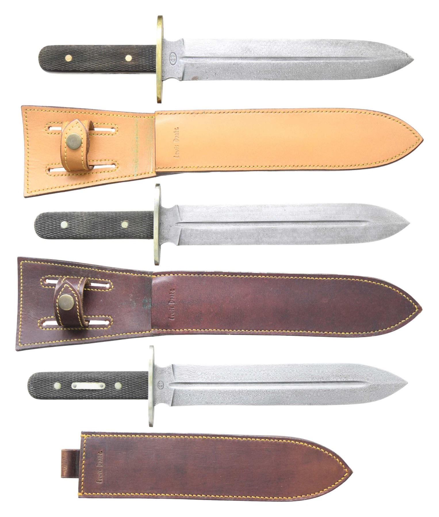 This lot contains 3 stunning Damascus steel, double-edged, spear point camp knives reproduced by Lewis Drake from a pattern out of the 1925 Manton "Centenary" Catalogue. The knives were forged entirely by hand by their own old world craftsmen and should not to be confused with cheap "Damascus" looking knives on the market. The knives measure 15 1/4" in the sheath. The blades are 9 1/4" in length and a sturdy 1 1/2" in width with the ricassos stamped "LD" in an oval. The hilts are 4 5/8" in length with 2-piece checkered buffalo horn grips. The heavy oval shaped guards are made of brass, as are the rivets securing the grip and the escutcheon plates on the front grip. This style knife is an ideal companion to carry in the bush for general camp use, light wood chopping, and, of course, for defense. These fine bladed weapons are equipped with their own custom leather sheaths, boldly marked "Lewis Drake". CONDITION: like new with only storage wear. PROVENANCE: from the renowned collection of quality sporting arms from Lewis Drake together with inventory of Lewis Drake Associates. (02-23573-17/BF). $600-1,000.