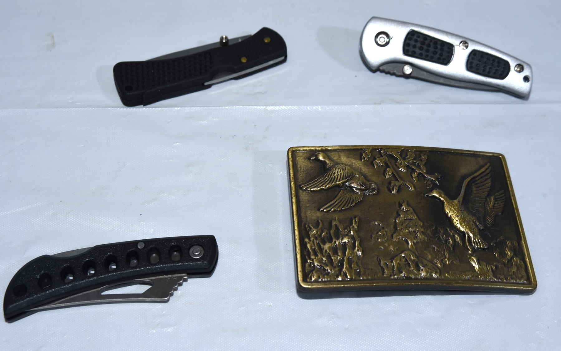 3- Lock Blade knives & 1- Duck Belt Buckle