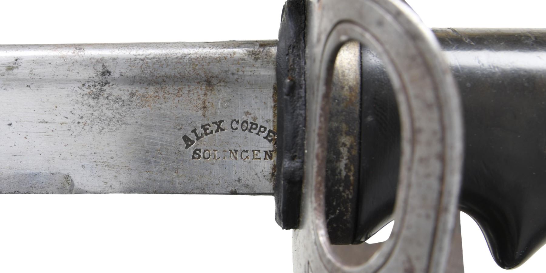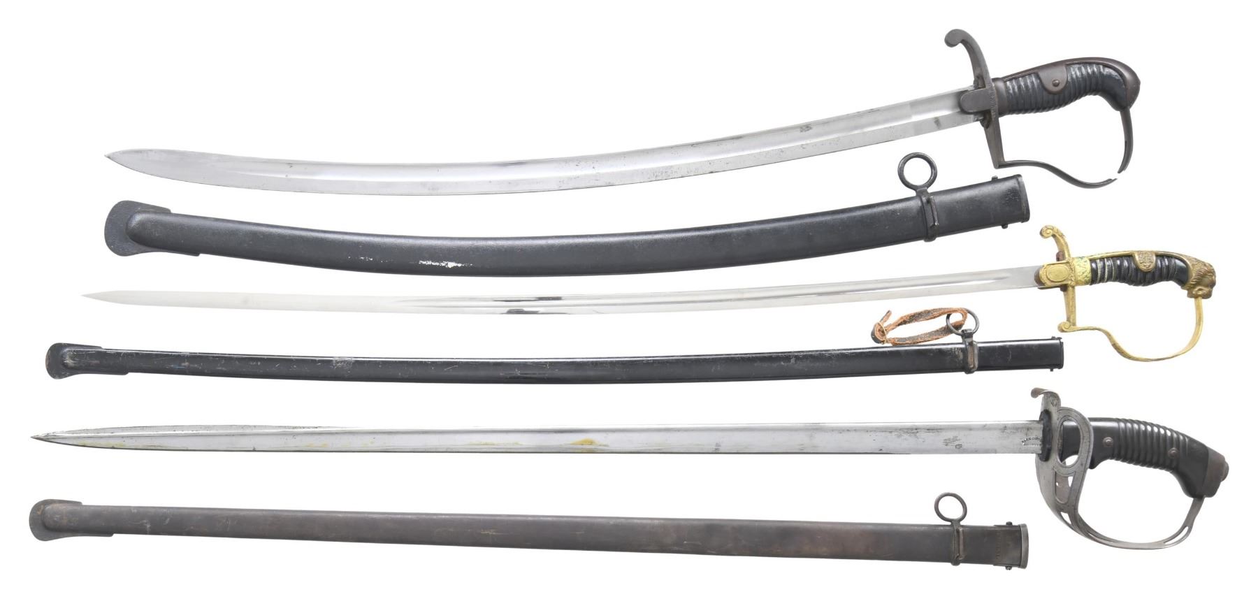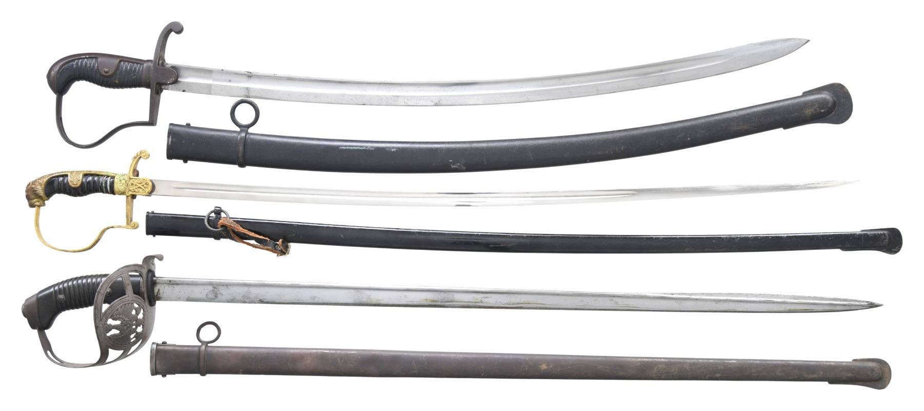 1) GERMAN. An Imperial German officer's sword measuring 39 1/4" overall with a 33" plain unmarked blade. Gilded brass hilt with crossed swords on the front langet and a lion head pommel featuring "ruby" eyes. Wire wrapped black composite grip with a black enameled iron scabbard. CONDITION: light wear overall with minor finish loss to the scabbard. 2) PRUSSIAN. A fine Prussian M1889 Hussar Cavalry saber measuring 39 1/2" overall with a plain 32 1/2" pipe back blade. The blade is marked "ALEX COPPEL SOLINGEN" near the hilt. Iron basket type guard with a Prussian eagle medallion in the center. Composite formed grip and darkened iron scabbard. CONDITION. light wear overall with light oxidation on the scabbard. 3) PRUSSIAN. A fine example of an M1848-73-96 Prussian Artillery saber measuring 36 1/2" overall with a 29 3/4" plain single fullered blade. The spine of the blade has proofs and dates the sword to 1905. Iron hilt with black leather wrapped grip. Iron scabbard. CONDITION: light wear overall. (02-24495-1). $700-1000