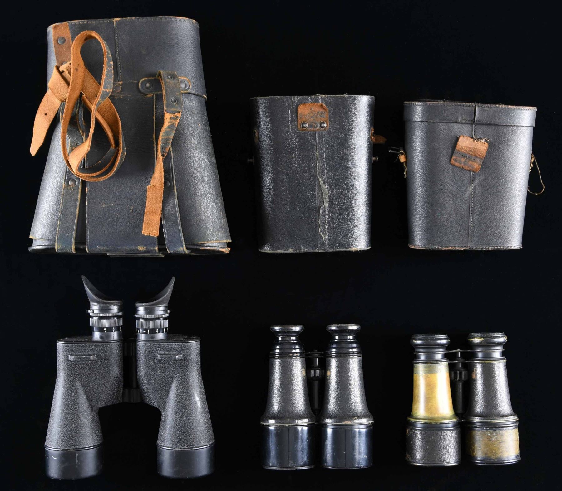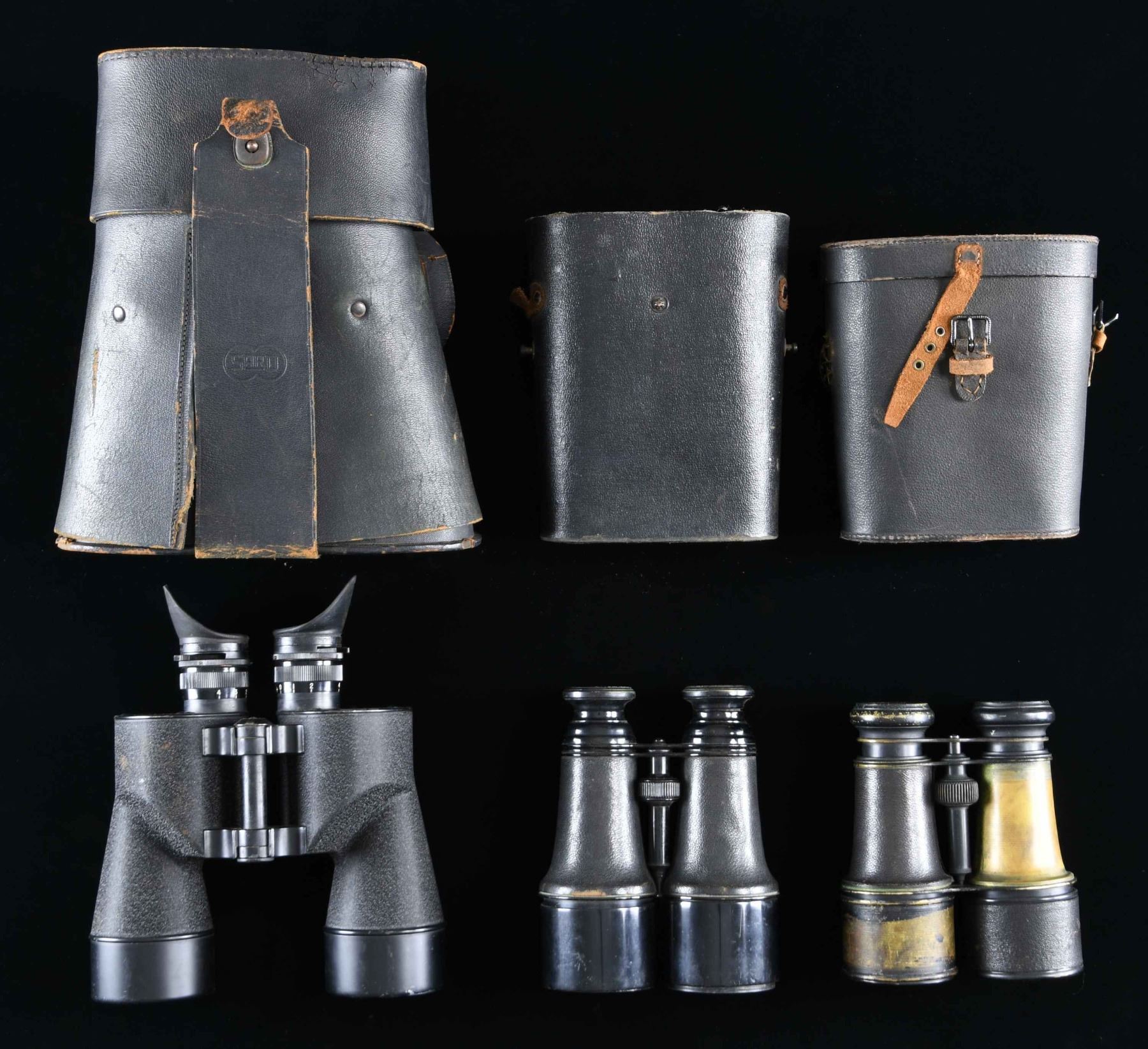 1) This pair measures approx. 6 1/2" x 5" and has a black finish with leather-wrapped barrels and plastic glare shields. The eyepieces are marked "IRIS PARIS" and "PILOT PARIS". The optics remain exceptionally clear and function perfectly. This pair is housed in its original black leather case. 2) This pair measures approx. 6" x 5" and has a black finish with leather-covered brass barrels and glare shields. The eyepieces are marked "LA DAUPHINE  PARIS" on each one. The optics function well, and the original case is present. 3) This pair measures approx. 9" x 7 1/2" and has a black finish with leather-covered barrels and rubber eye cups. The rear of the barrels is marked "SARD PRODUCT OF SQUARE D COMPANY  FLUSHING NEW YORK" and "7X50". The optics function well, but the image is a bit yellow. CONDITION: The first pair shows light overall wear, and the case shows moderate wear. The second pair is missing the leather covering on one barrel and one glare shield. The case's hinge is broken, and one buckle on the side is detached. The third pair shows light overall wear. (02-23637/BF). $450-700.
