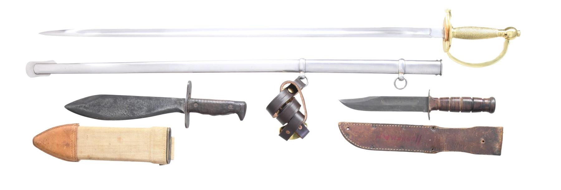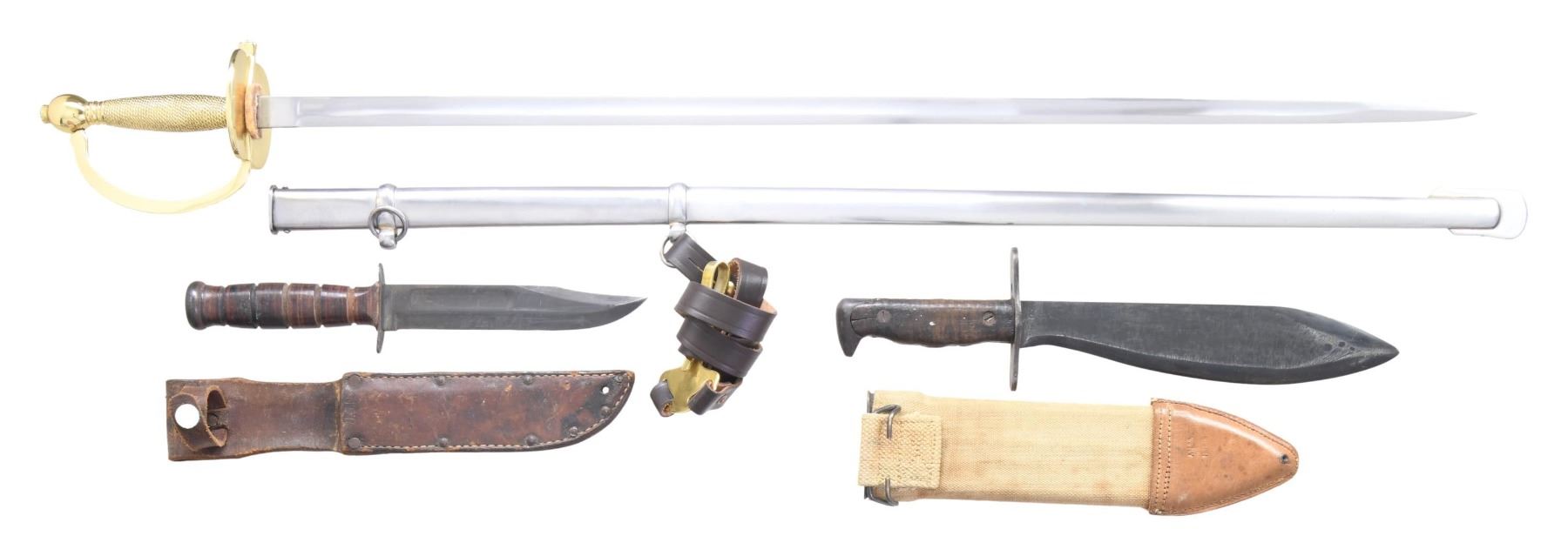 This group contains 1 / Reproduction US M1840 NCO sword with scabbard and cavalry hanging straps. The sword is 39 1/8" long and is marked "WINDLASS MADE IN INDIA" on the ricasso. 1 / US M1910 Bolo knife with scabbard. The knife measures 16 1/2" overall with a 10" blade that is marked "U S MOD 1917" & "PLUMB PHILA 191?". The scabbard is marked "A-K CO. 1918 R.H.S.". 1 / USN MK2 knife measuring 13" overall with a darkened blade. The guard is marked "KA-BAR USN MK2". The leather scabbard is also marked "USN". CONDITION: the sword is like new. The 2 other knives show light to moderate wear. (02-24432-2/BF). $300-400.