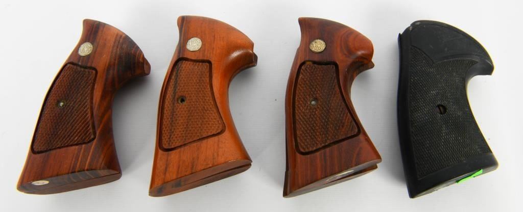 Smith & Wesson Elegance: Trio of Stamped Checkered Wood Grips ? Square Butt, Pre-Owned with Screws Indulge in the classic allure of Smith & Wesson with this exquisite trio of Stamped Checkered Wood Grips, each set crafted for the square butt, bearing the iconic Smith & Wesson stamp on the interior panel. These pre-owned grips, accompanied by their respective screws, are not just accessories; they're a nod to the timeless craftsmanship of one of the most esteemed firearms brands. Smith & Wesson Stamped Checkered Wood Grips ? Set One: The first set invites you to experience the charm of finely checkered wood grips, tailored for the square butt. The Smith & Wesson stamp on the interior panel is a mark of authenticity and quality. Embrace the character that comes with pre-owned grips, each wear and mark telling a story of use and appreciation. Smith & Wesson Stamped Checkered Wood Grips ? Set Two: Immerse yourself in the elegance of the second set of Stamped Checkered Wood Grips, designed with precision for the square butt. The Smith & Wesson stamp adorns the interior panel, creating a seamless integration of brand legacy and craftsmanship. These pre-owned grips have aged gracefully, adding character to your firearm. Smith & Wesson Stamped Checkered Wood Grips ? Set Three: The third set completes the trio, offering another opportunity to enhance your square butt firearm with the timeless appeal of Smith & Wesson Stamped Checkered Wood Grips. The pre-owned condition adds a touch of authenticity, while the included screw ensures easy installation on your cherished revolver. In addition to the wood grips, there's an extra offering: Checkered Rubber Pachmayr Presentation Grips: As a bonus, explore the tactile comfort and modern presentation style with the Checkered Rubber Pachmayr grips. Designed for a distinctive feel and enhanced control, these rubber grips offer a different aesthetic while maintaining the renowned quality associated with Pachmayr. As you consider your options, envision the transformation these grips can bring to your Smith & Wesson square butt firearms. Whether you prefer the classic charm of checkered wood or the modern feel of rubber presentation grips, each set is a testament to the enduring legacy of Smith & Wesson craftsmanship. Place your bids wisely and elevate your firearms collection with these distinctive accessories.