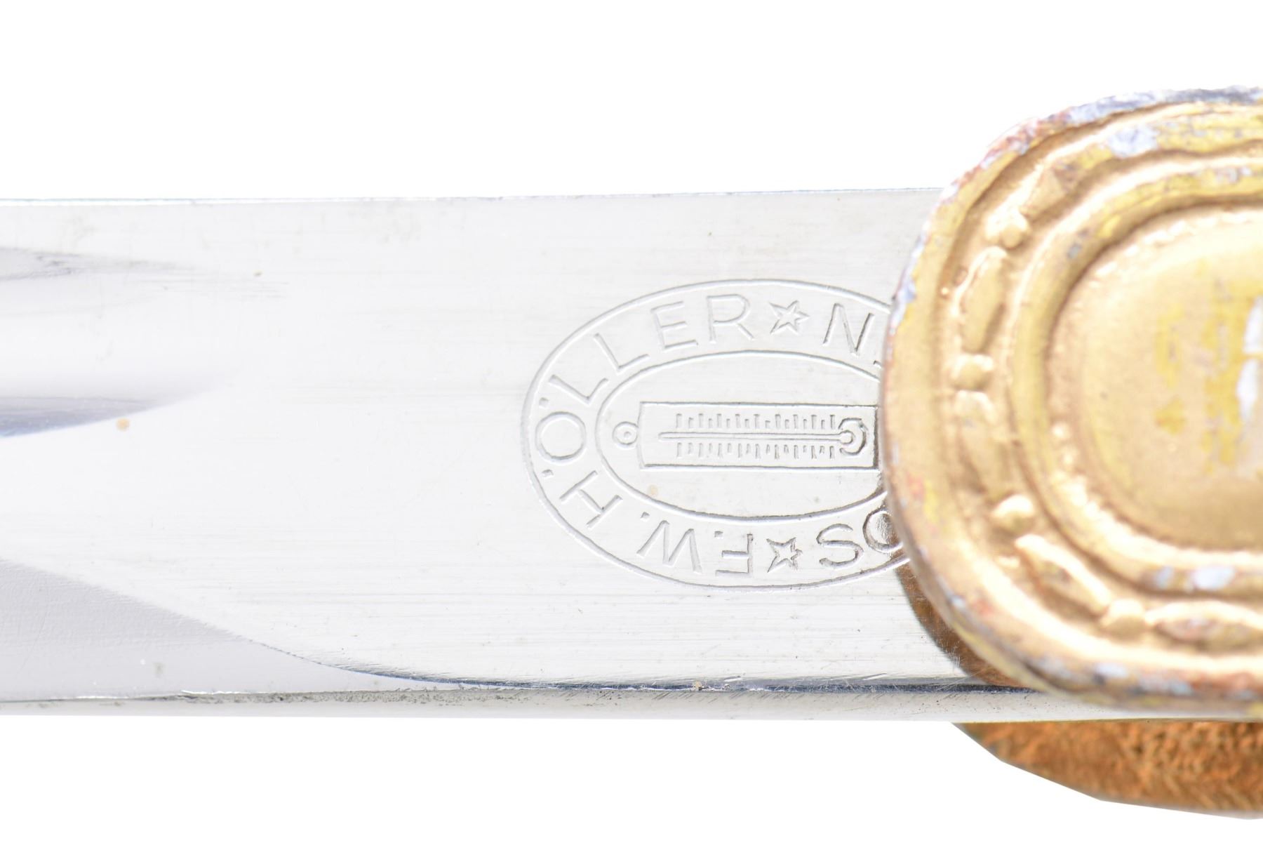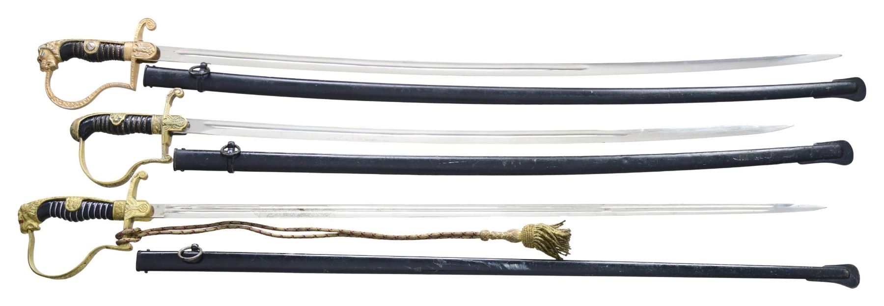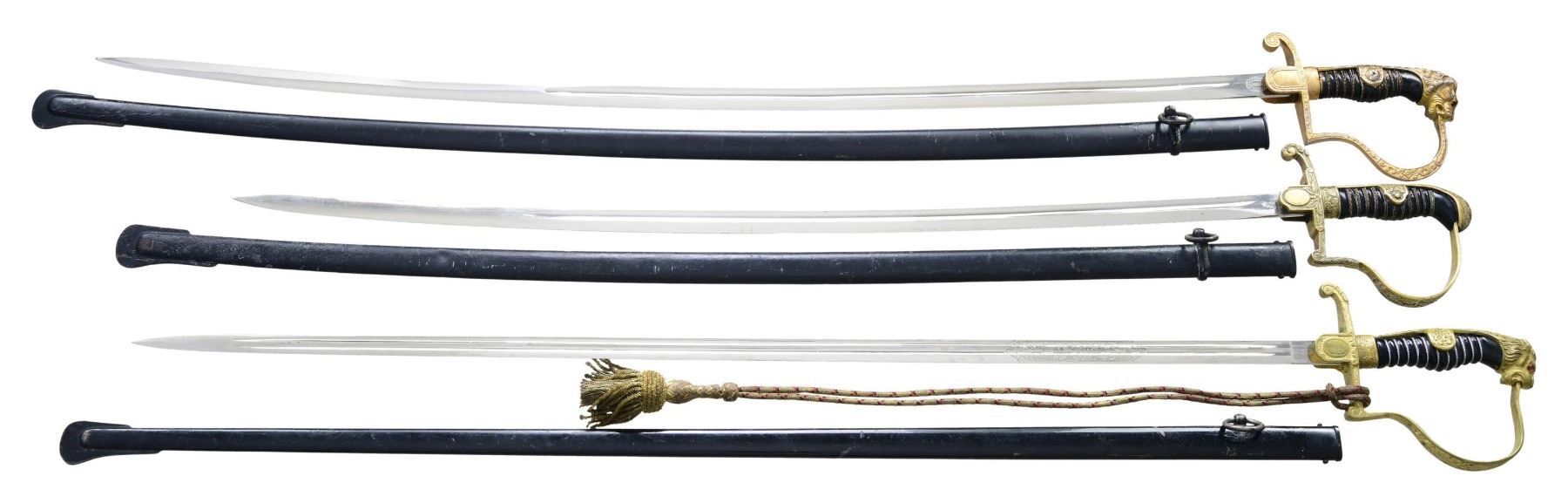 1) Overall length: 37 3/4". Blade length: 30 1/2". Plain blade with a single medium fuller marked at the ricasso "(logo) E.PACK & SOHNE SOLINGEN". Gilded brass hilt with a Wehrmacht eagle on the front languet. Oak leaf decorated knuckle bow, back strap and ferrule. The birdshead pommel has an oak leaf and acorn motif. Black enameled scabbard. CONDITION: blade shows primarily scabbard wear with one noticeable nick. Hilt shows light overall wear. Scabbard has a single small dent, appears to be repainted. 2) Overall length: 41". Blade length: 35 1/2". Plain blade with a single medium fuller marked at the ricasso "F.W.HOLLER SOLINGEN (logo)". Gilded pot metal hilt with a Wehrmacht eagle on the front languet. Geometrically decorated knuckle bow, back strap and ferrule. The lion head pommel has "ruby" eyes and the ears on the grip have a screw-down fastener. Black enameled scabbard. CONDITION: blade shows primarily scabbard wear. Hilt shows light to moderate wear with some loss to plating. Scabbard is lightly worn. 3) Overall length: 39". Blade length: 32 3/4". The blade has a 4" etched foliate panel on both sides that reads "In Treue Fest" indicating ownership by Bavarian officer. The blade has two narrow fullers and is unmarked at the ricasso. Gilded brass hilt with a Wehrmacht eagle on the front languet. Oak leaf decorated knuckle bow, back strap and ferrule. The lion head pommel has "ruby" eyes. There is a gold bullion with red and black highlights tied to the knuckle bow. Black enameled scabbard. CONDITION: blade shows primarily scabbard wear only. Hilt shows light wear overall and is a tiny bit loose. Scabbard has the usual light scratches but no major damage. (02-23848/BF). $700-900.