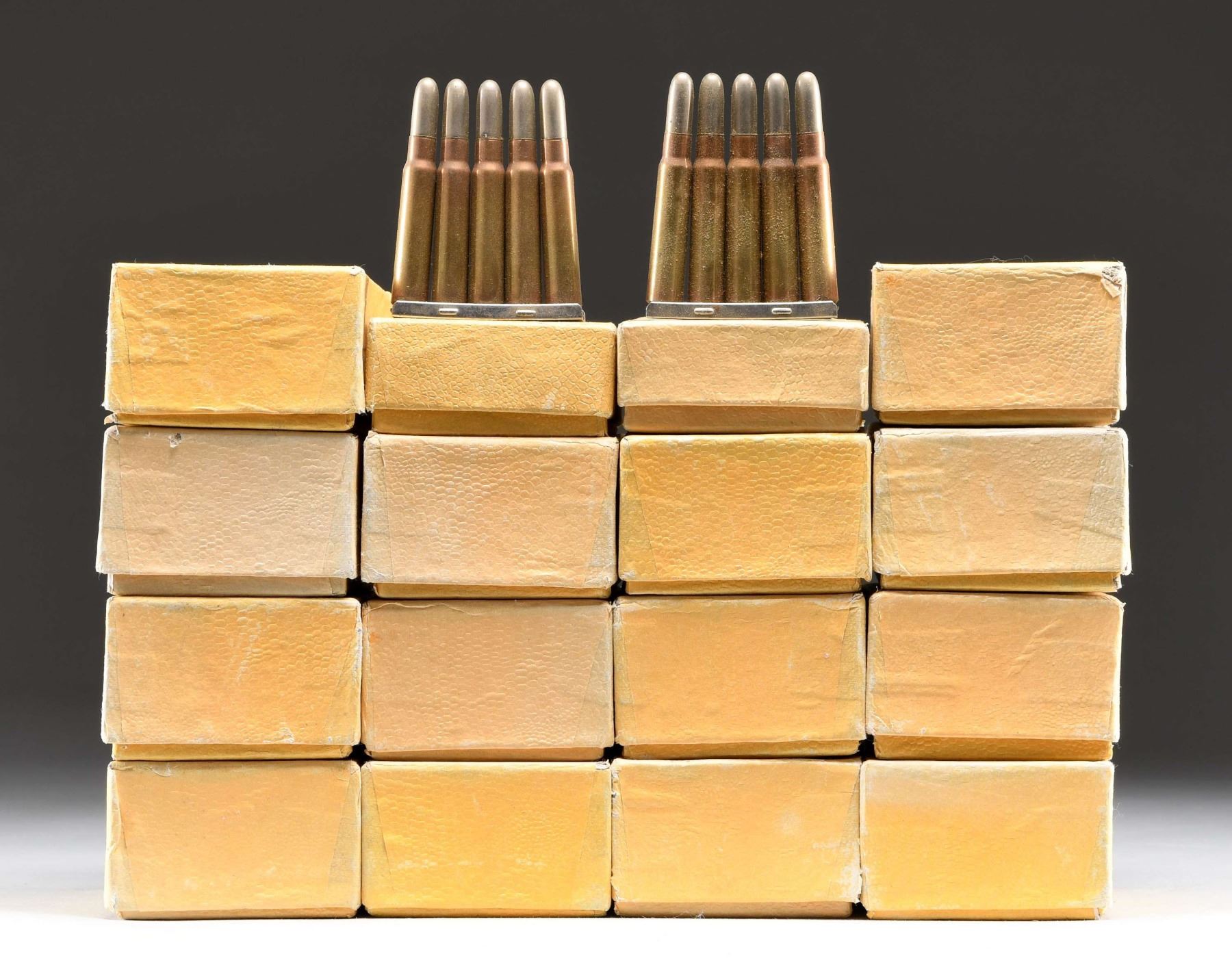 RIFLE AMMUNITION. The ammunition is all loaded by DWM in Germany with .323 diameter bullets. All are loaded with soft nosed bullets.20 rounds are solids. All ammunition is carried on steel stripper clips. The ammunition retains a good amount of the original paper packaging but has been repacked in 20 round two piece pasteboard boxes to facilitate handling. CONDITION: the ammunition has scattered light oxidation and patina. The steel clips show some light oxidation. The original packaging Has staining, tears and missing flaps. PROVENANCE: from the renowned collection of quality sporting arms from Lewis Drake together with inventory of Lewis Drake Associates. (02-23571-4/RW). AMMO. $400-600.
