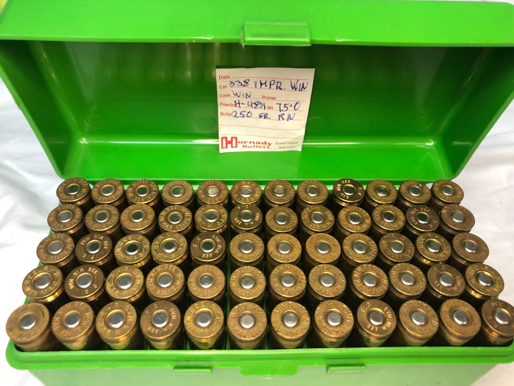 338 Win Mag lot of 60 rounds with green ammo box shown
