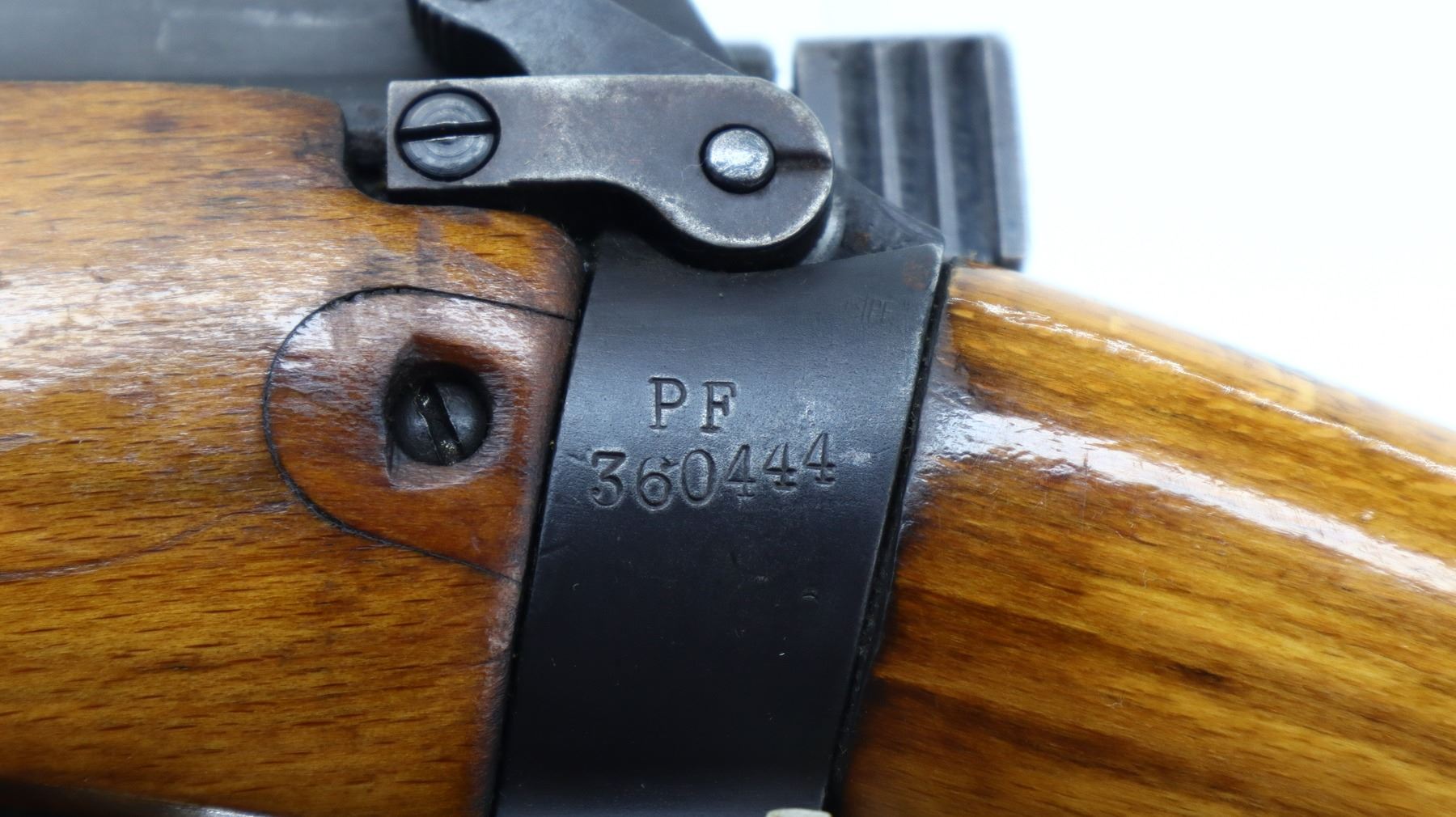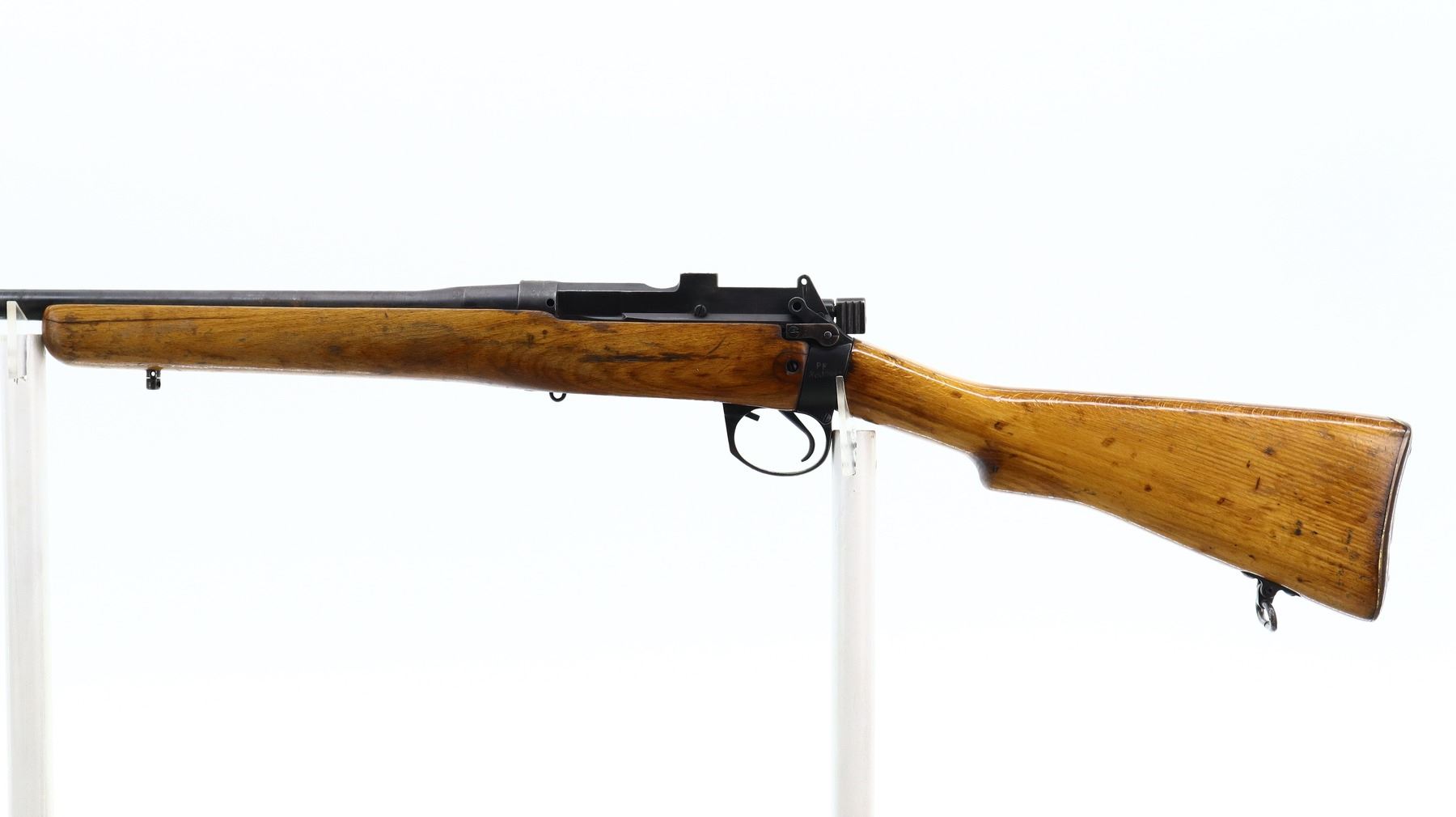 4/10, LEE ENFIELD , MODEL: NO 4 MKI SPORTER, CALIBER: 303 BR , DOES NOT COME WITH MAGAZINE, BORE IS FAIR, WORN LIGHT PITTING. MANUFACTURED BY FAZAKERLY 5/54, BOLT DOES NOT MATCH BY SERIAL #. BLADE FRONT SIGHT WITH RAMP. REAR SIGHT MISSING. RECEIVER INCORRECTLY DRILLED AND TAPPED. HOLES ARE CROOKED/OVERSIZE. TWO PIECE SMOOTH SPORTERIZED WOOD STOCK. PISTOL GRIP. SMOOTH BRASS BUTT PLATE WITH TRAP. REAR SWIVEL, FRONT IS BROKEN. METAL FINISH SHOWS LIGHT RUST SPOTS, SCRATCHES, HANDLING MARKS AND WEAR. FOREARM IS CRACKED. STOCKS SHOW DINGS, SCRATCHES AND WEAR. ACTION: BOLT ACTION RIFLE , BARREL LENGTH:25.25", SERIAL # PF360444, CONDITION: 4/10, CLASS: CANADIAN NON RESTRICTED CLASS