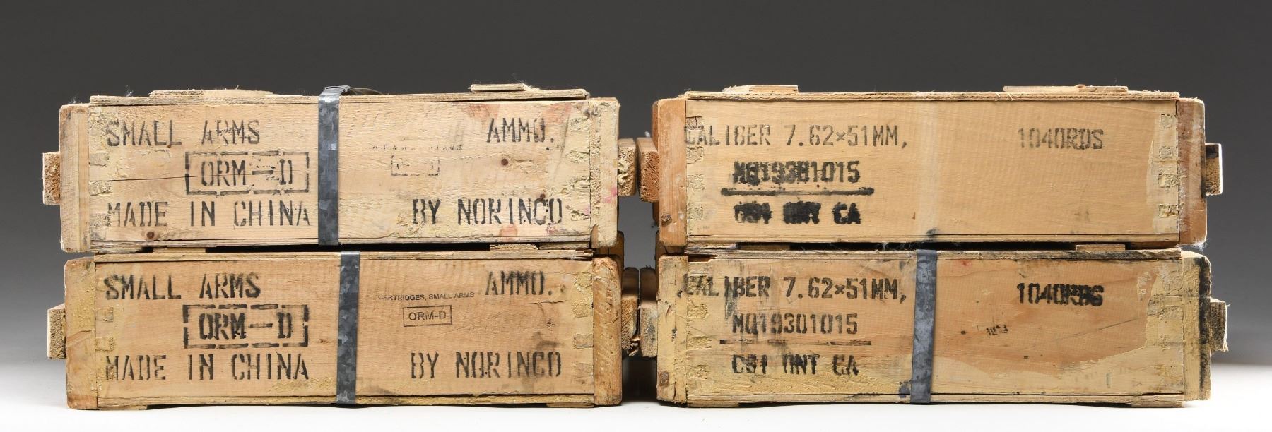 This ammunition is made in China by Norinco. It is packed into four wooden crates of 1,040 rds. each. The crates contain two sealed "spam cans" of 520 rds. each. The cans are marked "7.62X51 / 71-92-61 / BALL / 520 ROUNDS". CONDITION: ammunition not examined due to sealed nature of the "spam cans". Cans & crates are in good condition w/ legible markings. Crates will have normal handling wear, cracks & splintering. Three boxes are sealed, one was opened. (02-24270-4/RW). AMMO. $1,200-1,500.