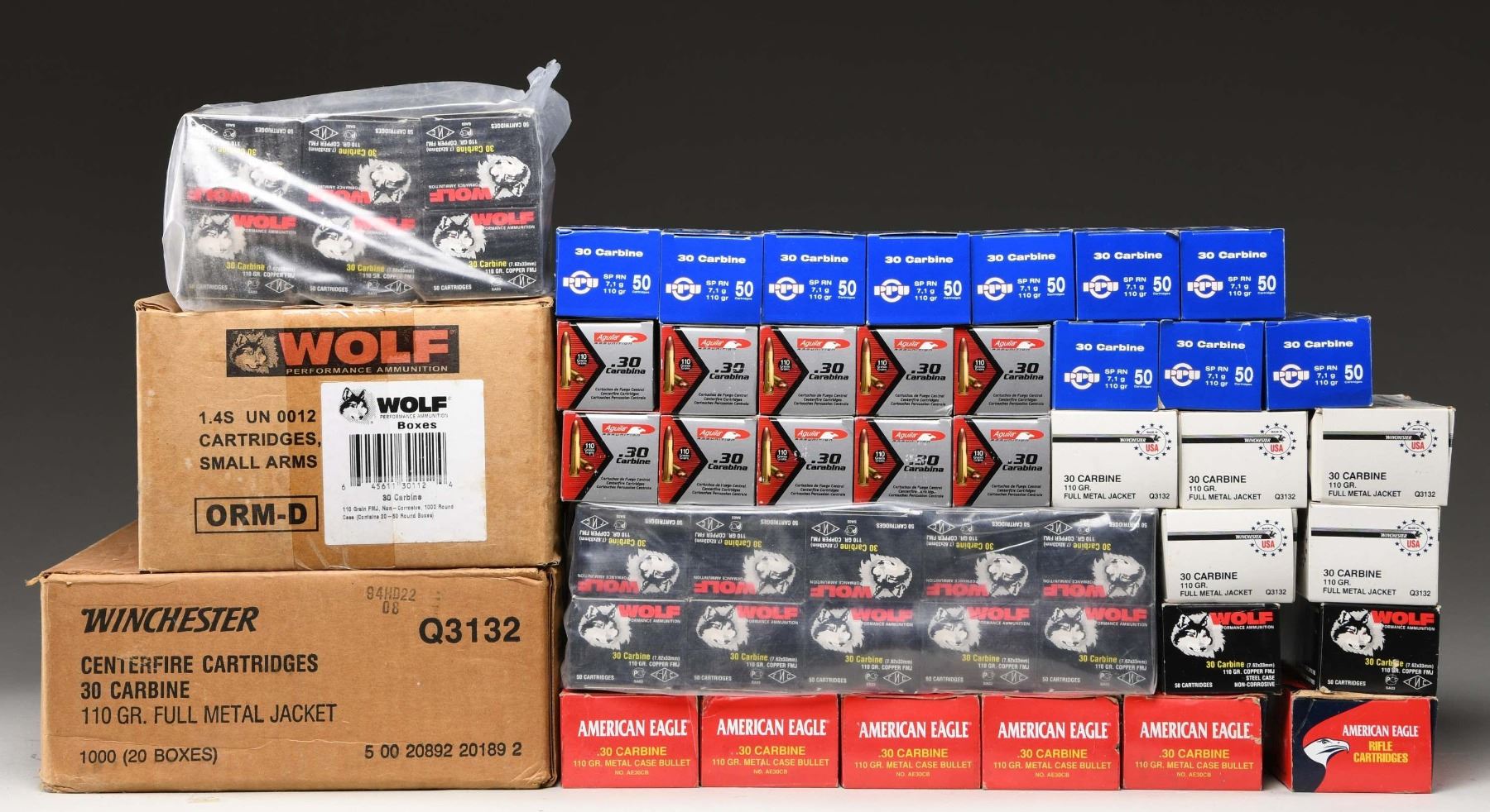 All ammunition is non-corrosive. No.1: Winchester. Full cardboard case containing 50 boxes of 20 rds. 110 grain full metal jacket. No.2: Wolf. Full cardboard case containing 20 boxes of 50 rds. 110 grain copper tip full metal jacket. Steel cased. No.3: Aguila. Full cardboard case containing 10 boxes of 50 rds. 110 grain full metal jacket. Brass cased. No.4: Wolf. One cardboard case containing 18 boxes of 50 rds. 110 grain copper full metal jacket. Steel cased. No.5: PPU. One cardboard case containing 10 boxes of 50 rds. 110 grain round nose soft point. Brass cased. No.6: Federal American Eagle. Six boxes of 50 rds. 110 grain full metal jacket. No.7: Winchester USA. Five boxes of 50 rds. 110 grain full metal jacket. Brass cased. CONDITION: boxes may have light handling wear & small ears at corners. Ammunition appears clean & serviceable. (02-24270-26/RW). AMMO. $900-1,200.