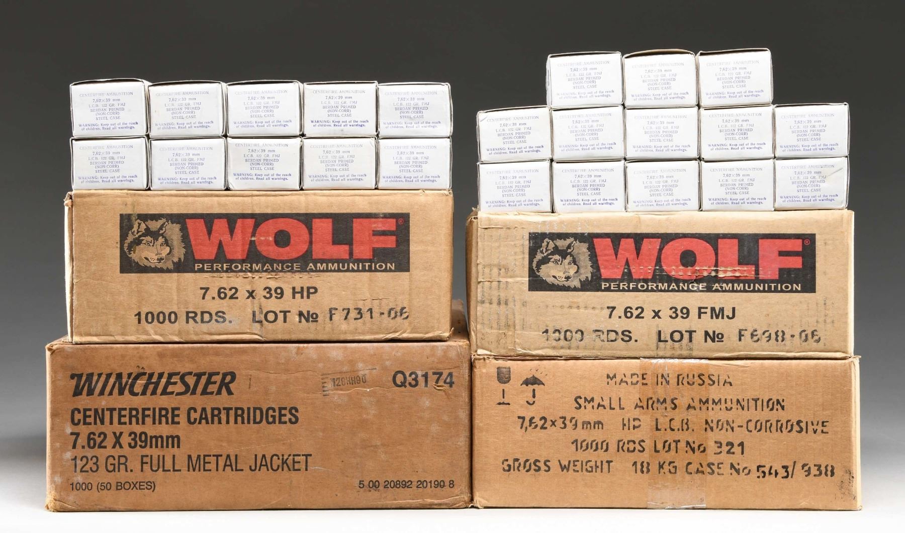 Lot contains hollow points. No.1: Winchester 1,000 rds. sealed cardboard case. 123 grain full metal jacket. 20 rd. boxes. No.2: Wolf 1,000 rds. sealed cardboard case. 122 grain full metal jacket. Steel cased. Non-corrosive. 20 rd. boxes. No.3: Wolf 1,000 rds. sealed cardboard case. 122 grain hollow point. Steel cased. Berdan primed. Non-corrosive. 20 rd. boxes. No.4: Wolf 1,000 rds. sealed cardboard case. 122 grain hollow point. Lead core bullet. Berdan primed. Non-corrosive. 20 rd. boxes. No.5: RNC 460 rds. 122 grain full metal jacket. Non-corrosive. Berdan primed. Steel cased. 23 boxes containing 20 rds. each. CONDITION: cases are in good condition w/ normal handling wear. Ammunition not inspected due to sealed nature of cases. (02-24270-10/RW). AMMO. $1,000-1,500.