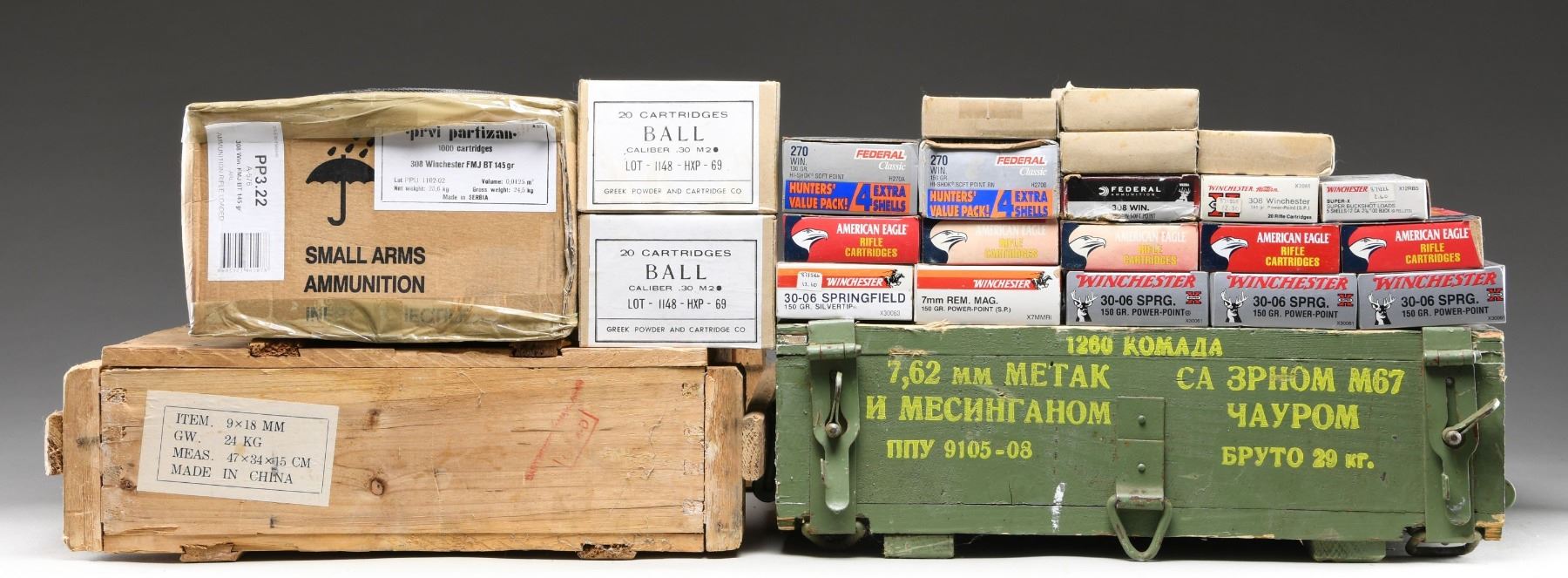 Lot may contain hollow points. Pistol Ammunition: No.1: Norinco. 9x18 Makarov. One wooden crate containing 42 boxes of 50 rds. 95 grain full metal jacket. Non-corrosive. Steel cased. Rifle Ammunition: No.1: Yugoslavian. 7.62x39mm. Wooden case containing 1,260 rds. Also contained is a sealed can of military ball ammunition. Green wooden case marked in cyrillic. Also marked "M67". No.2: Prvi Partizan. 308 Win. One sealed case containing 1,000 rds. 145 grain full metal jacket. Boat tail. No.3: Federal. 308 Win. One box of 20 rds. 150 grain soft point. No.4: Winchester Western. 308 Win. One box of 20 rds. 180 grain power-point (S.P.). No.5: Winchester. 30-06 Springfield. One box of 20 rds. 150 grain silver tip. No.6: Winchester. 30-06 Springfield. Three boxes of 20 rds. 150 grain power-point. No.7: Federal American Eagle. 30-06 Springfield. Five boxes of 20 rds. 150 grain metal cased. Boat tail. No.8: Greek Powder And Cartridge Co. 30-06 Springfield. Six boxes of 20 rds. Box markings include "BALL / CALIBER 30 / M2". No.9: Winchester. 7mm Rem Mag. One box of 20 rds. 150 grain power-point. (sp). No.10: Federal Classic. 270 Win. One box of 24 rds. 150 grain high shock soft point and RN. No.11: Federal Classic. 270 Win. One box of 24 rds. 130 grain high shock soft point. CONDITION: boxes & cases have normal handling wear, scuffing & small tears. Ammunition examined appears clean & serviceable. (02-24270-27/RW). AMMO. $1,200-1,400.