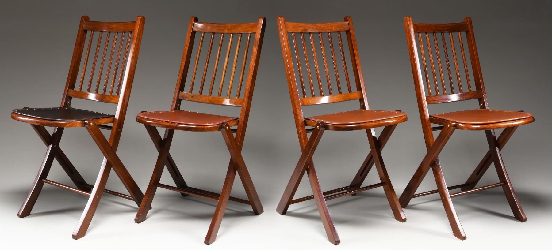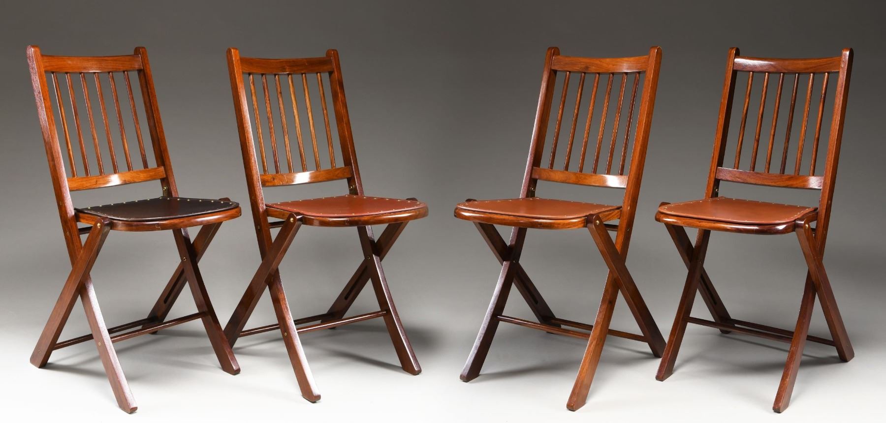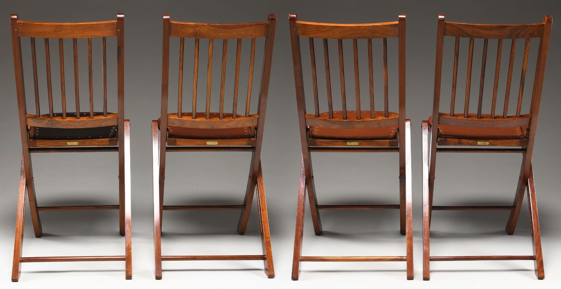 This lightweight, yet, very sturdy and comfortable chair was inspired by safari furniture observed by Lewis Drake in Bombay, India. Drake was so impressed he had them reproduced in rosewood with genuine buffalo hide seats. This finely crafted chair is nearly impervious to weather and is easy to pack for your next picnic in the park, sporting event, or afternoon at the coast. The chairs measure 18" deep, 15 1/2" wide, 33" in overall height with a 17 1/2" seat height. Collapsed the chairs measure 36" x 4". CONDITION: chairs show light storage wear with a few scattered scratches. PROVENANCE: from the renowned collection of quality sporting arms from Lewis Drake together with inventory of Lewis Drake Associates. (02-23565-9/BF). $500-800.