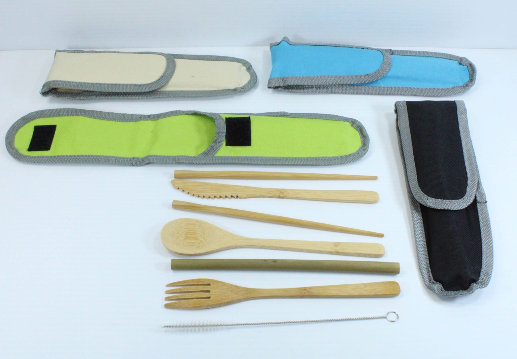 4 PK BAMBOO UTENSIL KIT IN CASE - INCLUDES FORK, KNIFE, SPOON, CHOPSTICKS, STRAW AND CLEANING BRUSH