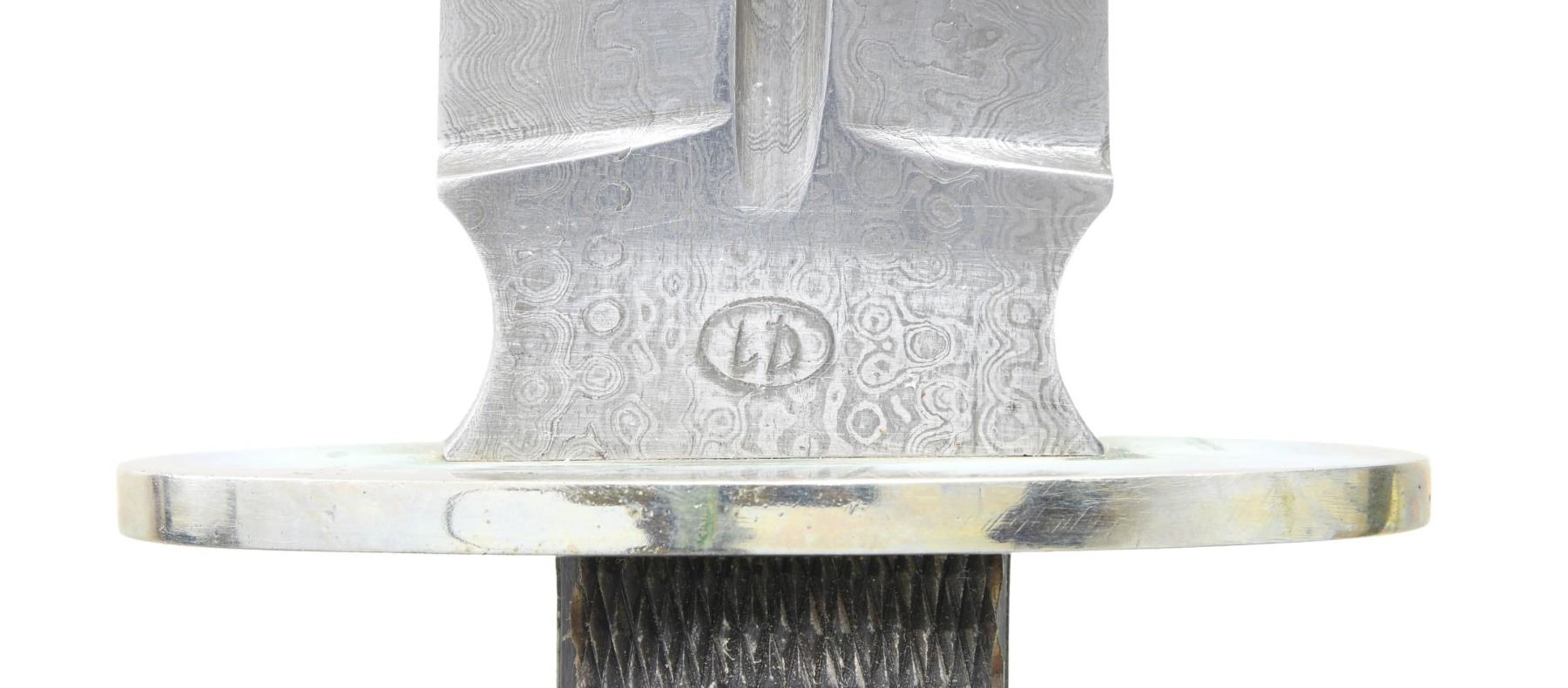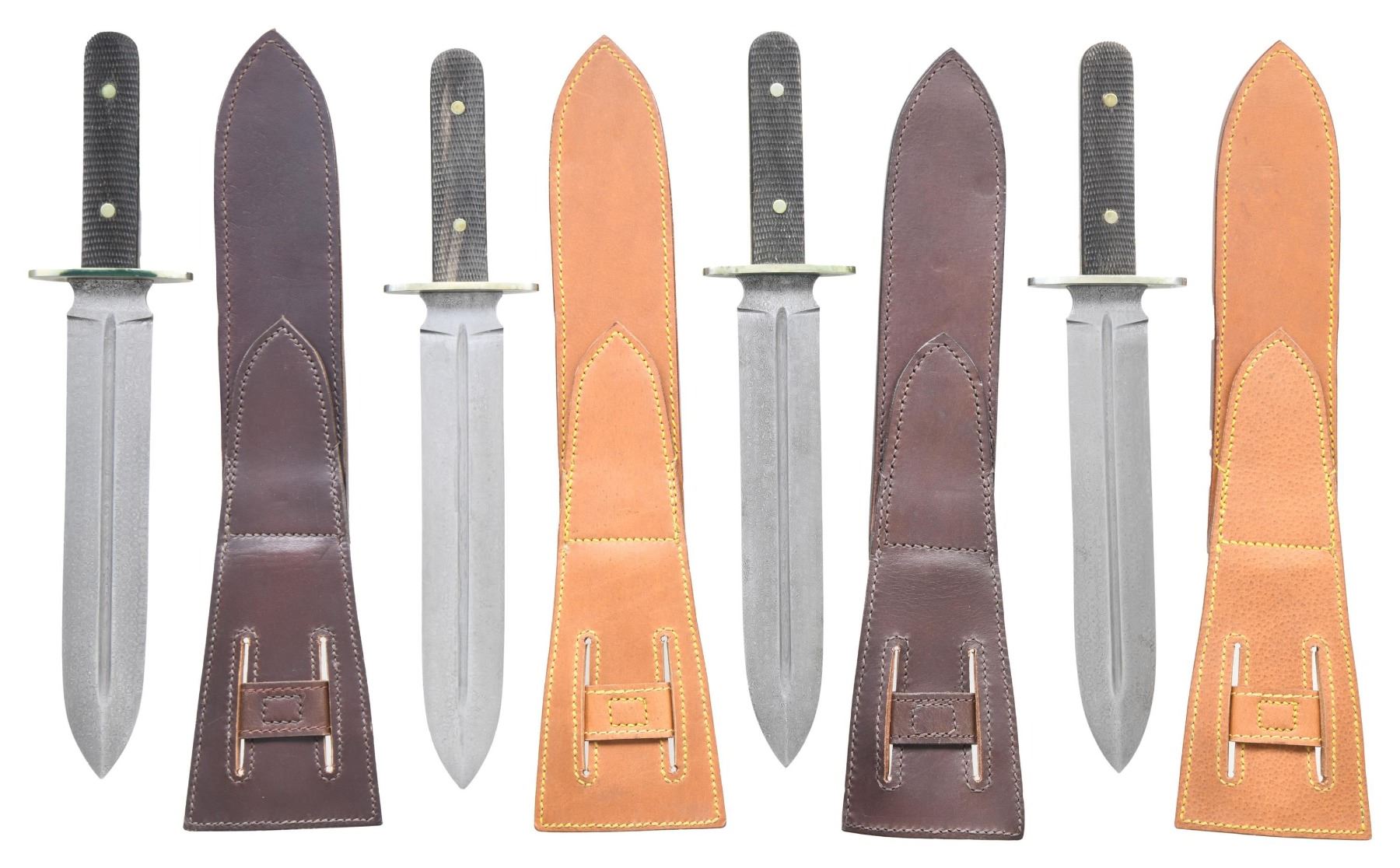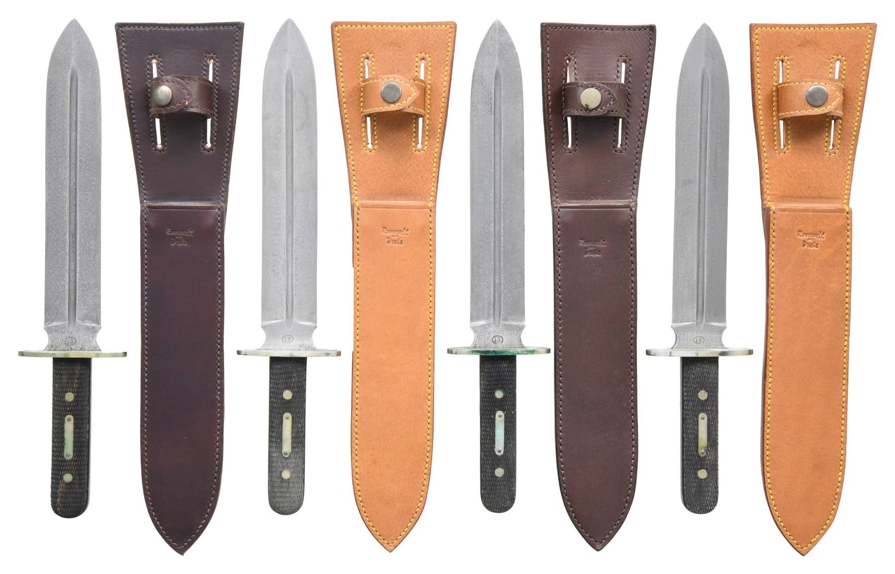 This lot contains 4 stunning Damascus steel, double-edged, spear point camp knives reproduced by Roosevelt and Drake from a pattern out of the 1925 Manton "Centenary" Catalogue. The knives were forged entirely by hand by their own old world craftsmen and should not to be confused with cheap "Damascus" looking knives on the market. The knives measure 15 1/4" in the sheath. The blades are 9 1/4" in length and a sturdy 1 1/2" in width with the ricassos stamped "LD" in an oval. The hilts are 4 5/8" in length with 2-piece checkered buffalo horn grips. The heavy oval shaped guards are made of brass, as are the rivets securing the grip and the escutcheon plates on the front grip. This style knife is an ideal companion to carry in the bush for general camp use, light wood chopping, and, of course, for defense. These fine bladed weapons are equipped with their own custom leather sheaths, boldly marked "Roosevelt & Drake". CONDITION: like new with only storage wear. PROVENANCE: from the renowned collection of quality sporting arms from Lewis Drake together with inventory of Lewis Drake Associates. (02-23573-14/BF). $800-1,200.