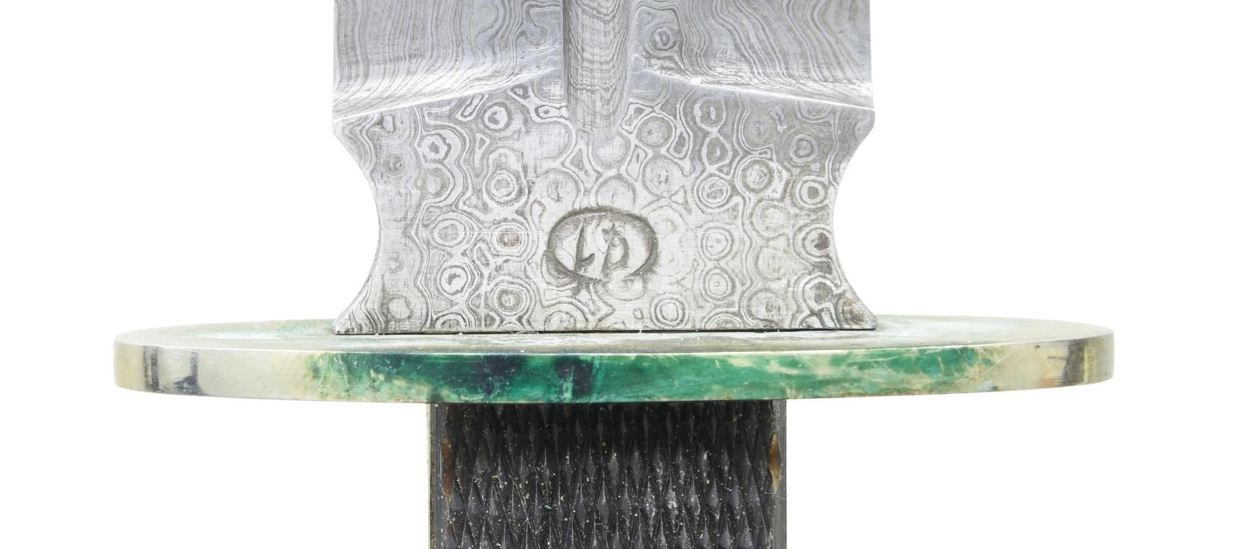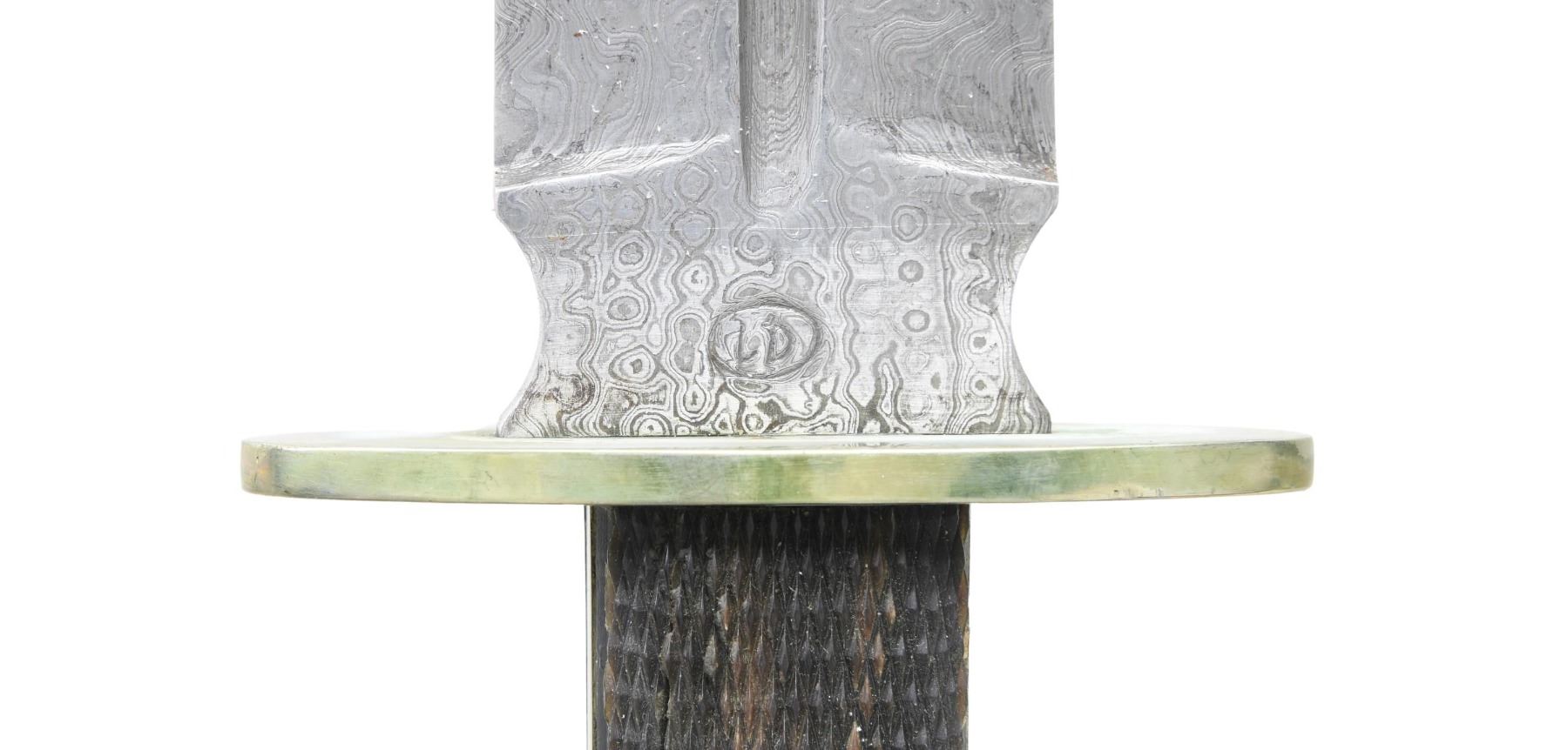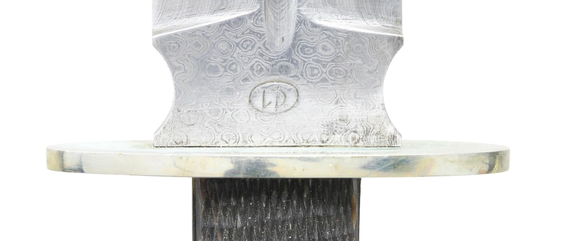 This lot contains 4 stunning Damascus steel, double-edged, spear point camp knives reproduced by Roosevelt and Drake from a pattern out of the 1925 Manton "Centenary" Catalogue. The knives were forged entirely by hand by their own old world craftsmen and should not to be confused with cheap "Damascus" looking knives on the market. The knives measure 15 1/4" in the sheath. The blades are 9 1/4" in length and a sturdy 1 1/2" in width with the ricassos stamped "LD" in an oval. The hilts are 4 5/8" in length with 2-piece checkered buffalo horn grips. The heavy oval shaped guards are made of brass, as are the rivets securing the grip and the escutcheon plates on the front grip. This style knife is an ideal companion to carry in the bush for general camp use, light wood chopping, and, of course, for defense. These fine bladed weapons are equipped with their own custom leather sheaths, boldly marked "Roosevelt & Drake". CONDITION: like new with only storage wear. PROVENANCE: from the renowned collection of quality sporting arms from Lewis Drake together with inventory of Lewis Drake Associates. (02-23573-14/BF). $800-1,200.