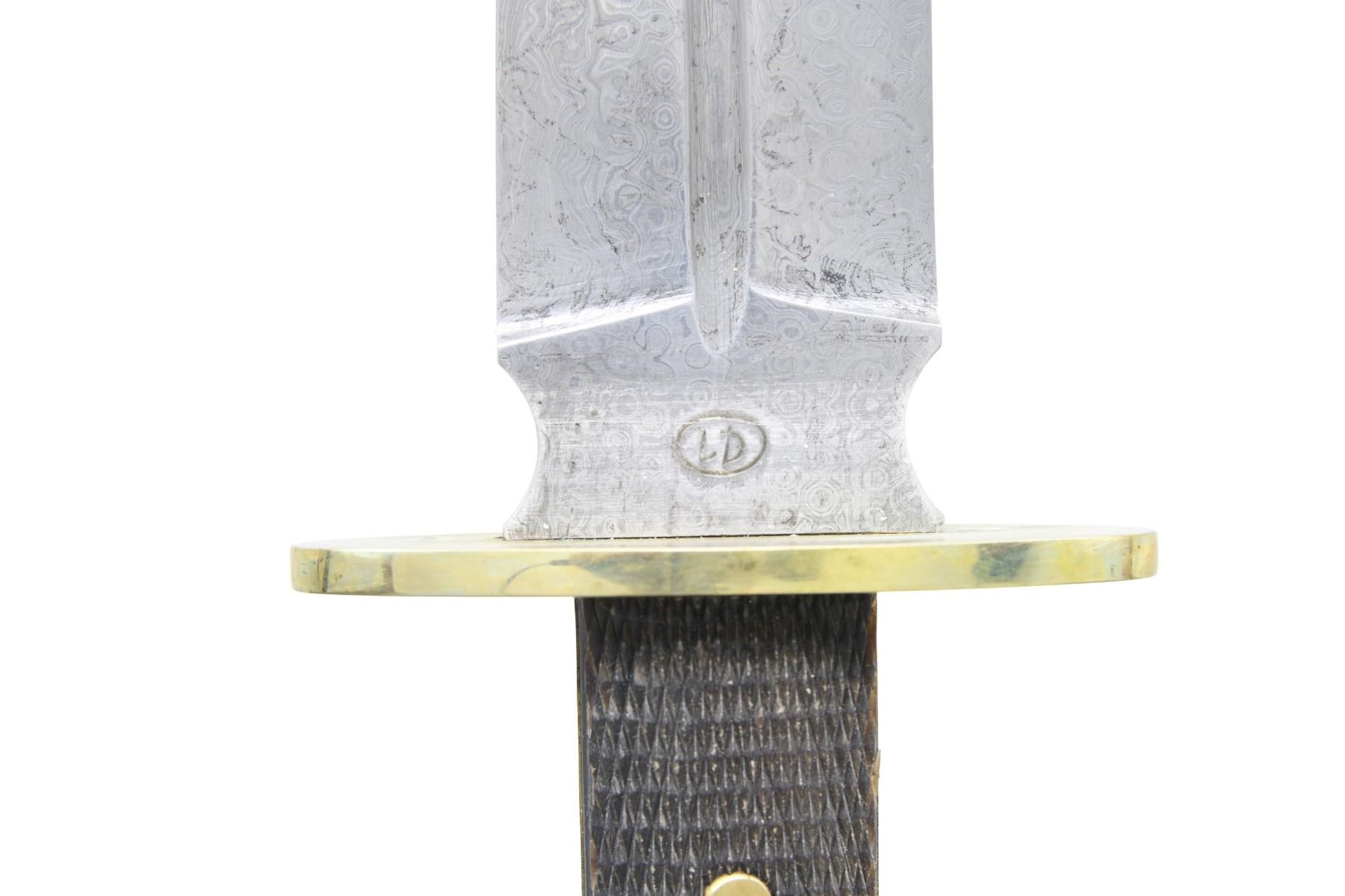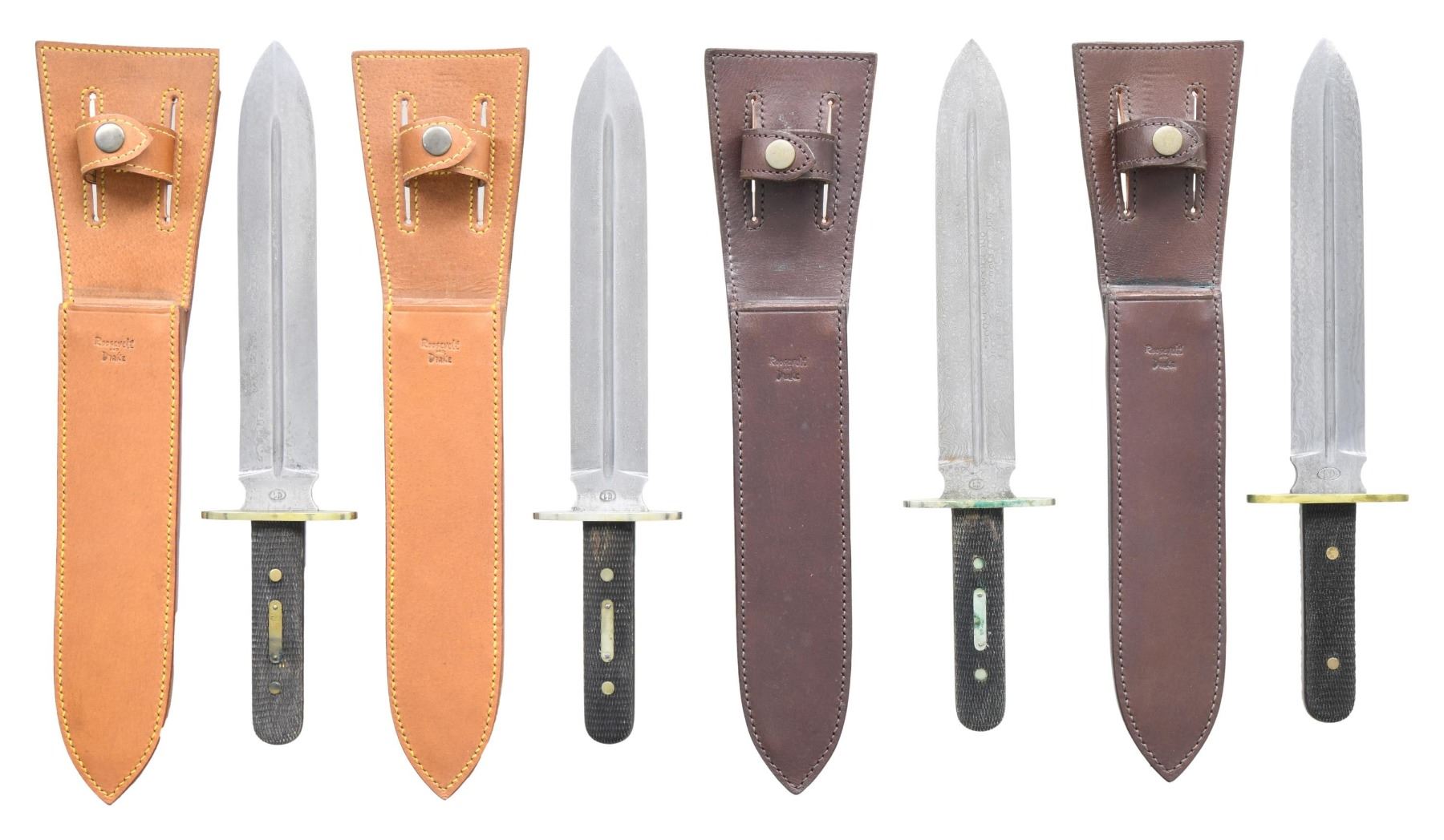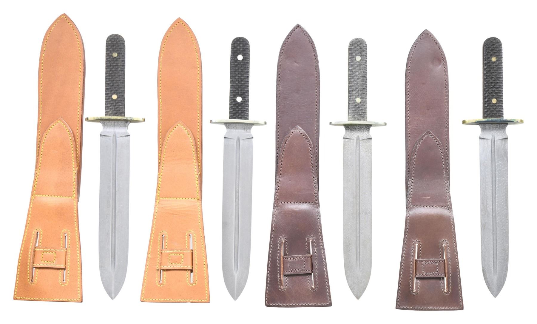 This lot contains 4 stunning Damascus steel, double-edged, spear point camp knives reproduced by Roosevelt and Drake from a pattern out of the 1925 Manton "Centenary" Catalogue. The knives were forged entirely by hand by their own old world craftsmen and should not to be confused with cheap "Damascus" looking knives on the market. The knives measure 15 1/4" in the sheath. The blades are 9 1/4" in length and a sturdy 1 1/2" in width with the ricassos stamped "LD" in an oval. The hilts are 4 5/8" in length with 2-piece checkered buffalo horn grips. The heavy oval shaped guards are made of brass, as are the rivets securing the grip and the escutcheon plates on the front grip. This style knife is an ideal companion to carry in the bush for general camp use, light wood chopping, and, of course, for defense. These fine bladed weapons are equipped with their own custom leather sheaths, boldly marked "Roosevelt & Drake". CONDITION: like new with only storage wear. PROVENANCE: from the renowned collection of quality sporting arms from Lewis Drake together with inventory of Lewis Drake Associates. (02-23573-15/BF). $800-1,200.