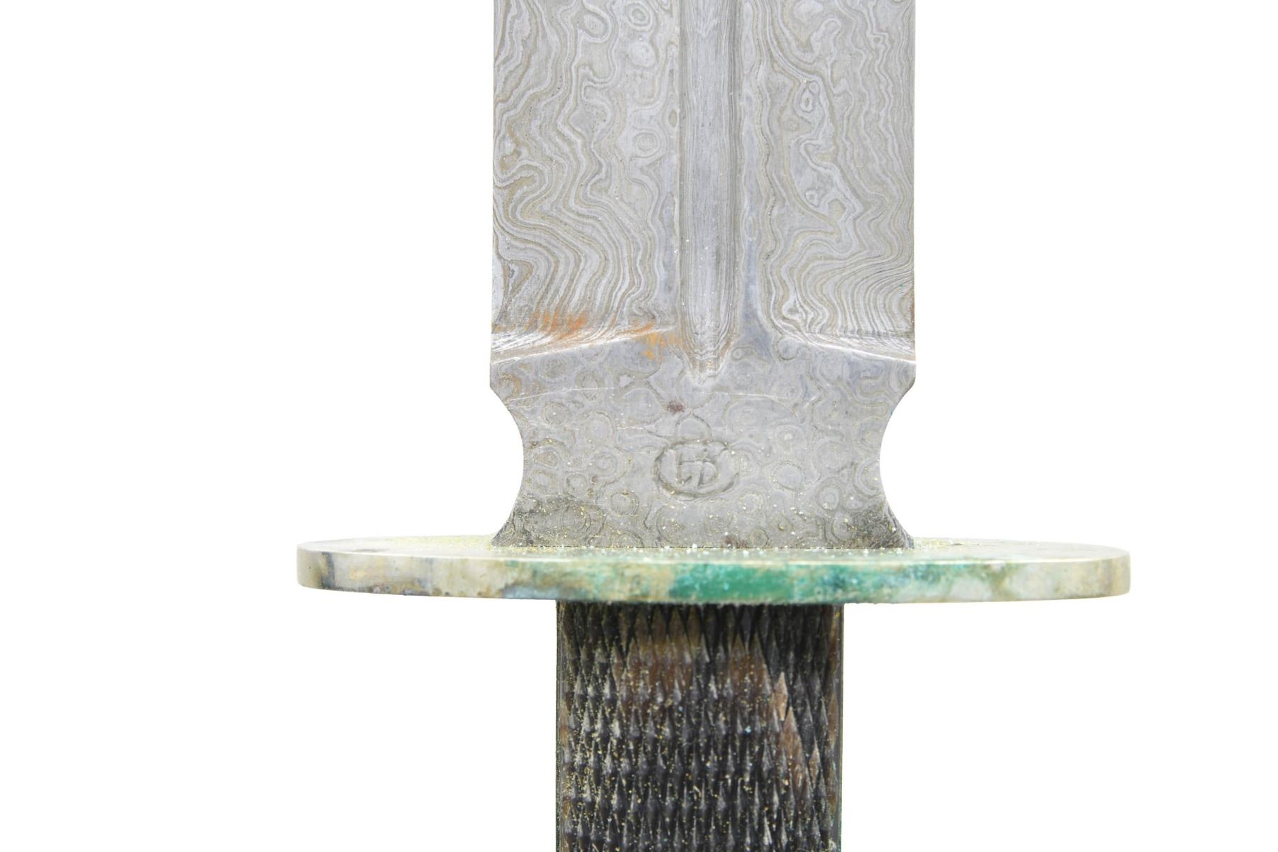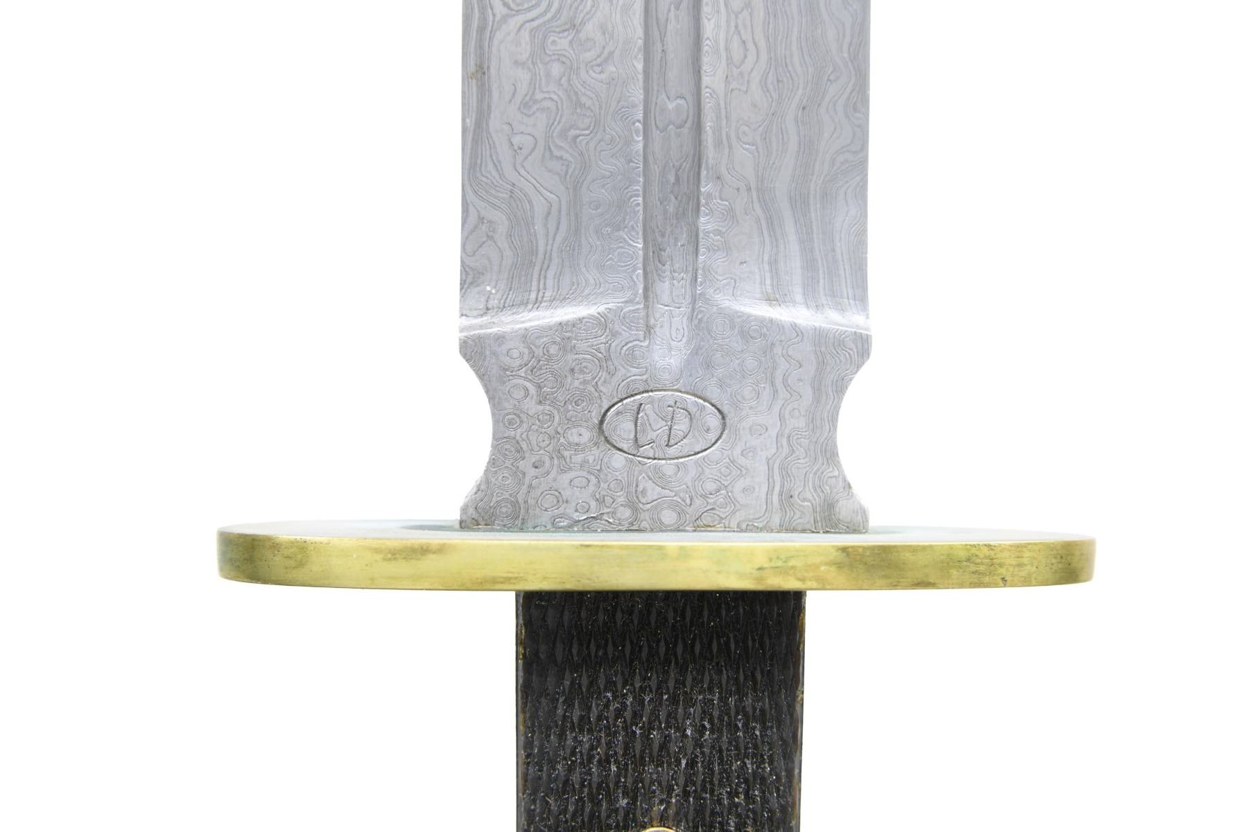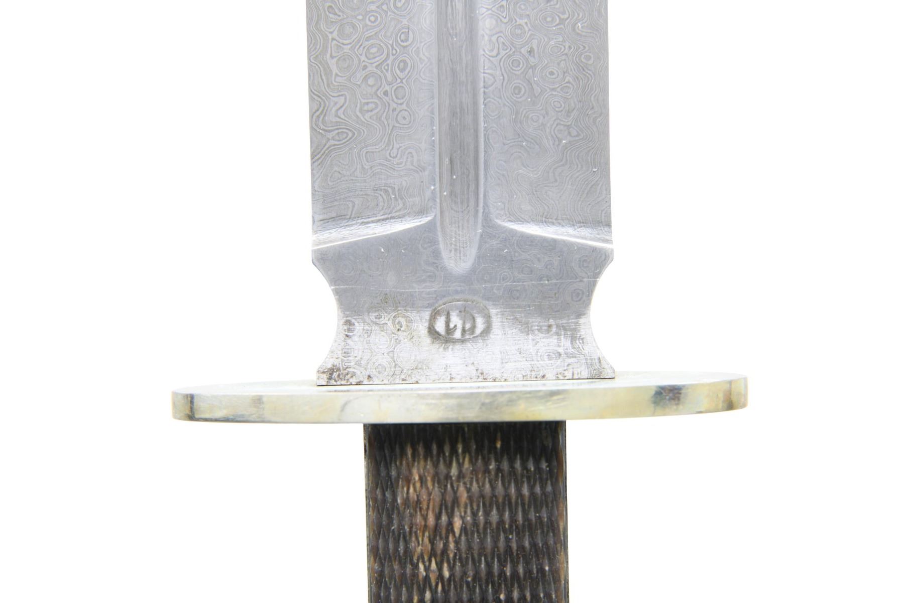 This lot contains 4 stunning Damascus steel, double-edged, spear point camp knives reproduced by Roosevelt and Drake from a pattern out of the 1925 Manton "Centenary" Catalogue. The knives were forged entirely by hand by their own old world craftsmen and should not to be confused with cheap "Damascus" looking knives on the market. The knives measure 15 1/4" in the sheath. The blades are 9 1/4" in length and a sturdy 1 1/2" in width with the ricassos stamped "LD" in an oval. The hilts are 4 5/8" in length with 2-piece checkered buffalo horn grips. The heavy oval shaped guards are made of brass, as are the rivets securing the grip and the escutcheon plates on the front grip. This style knife is an ideal companion to carry in the bush for general camp use, light wood chopping, and, of course, for defense. These fine bladed weapons are equipped with their own custom leather sheaths, boldly marked "Roosevelt & Drake". CONDITION: like new with only storage wear. PROVENANCE: from the renowned collection of quality sporting arms from Lewis Drake together with inventory of Lewis Drake Associates. (02-23573-15/BF). $800-1,200.