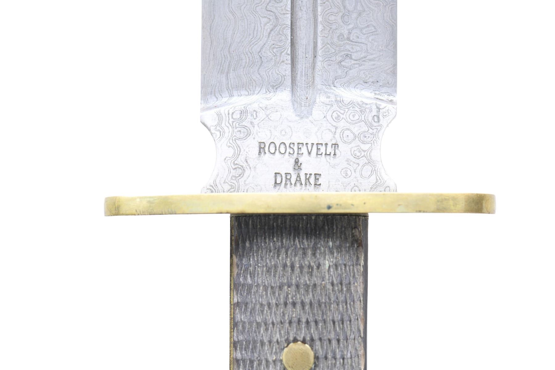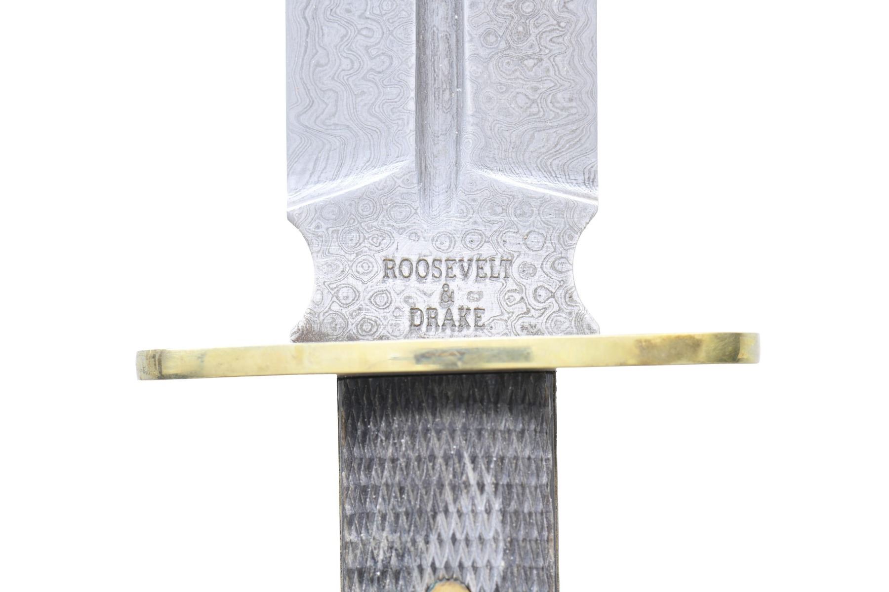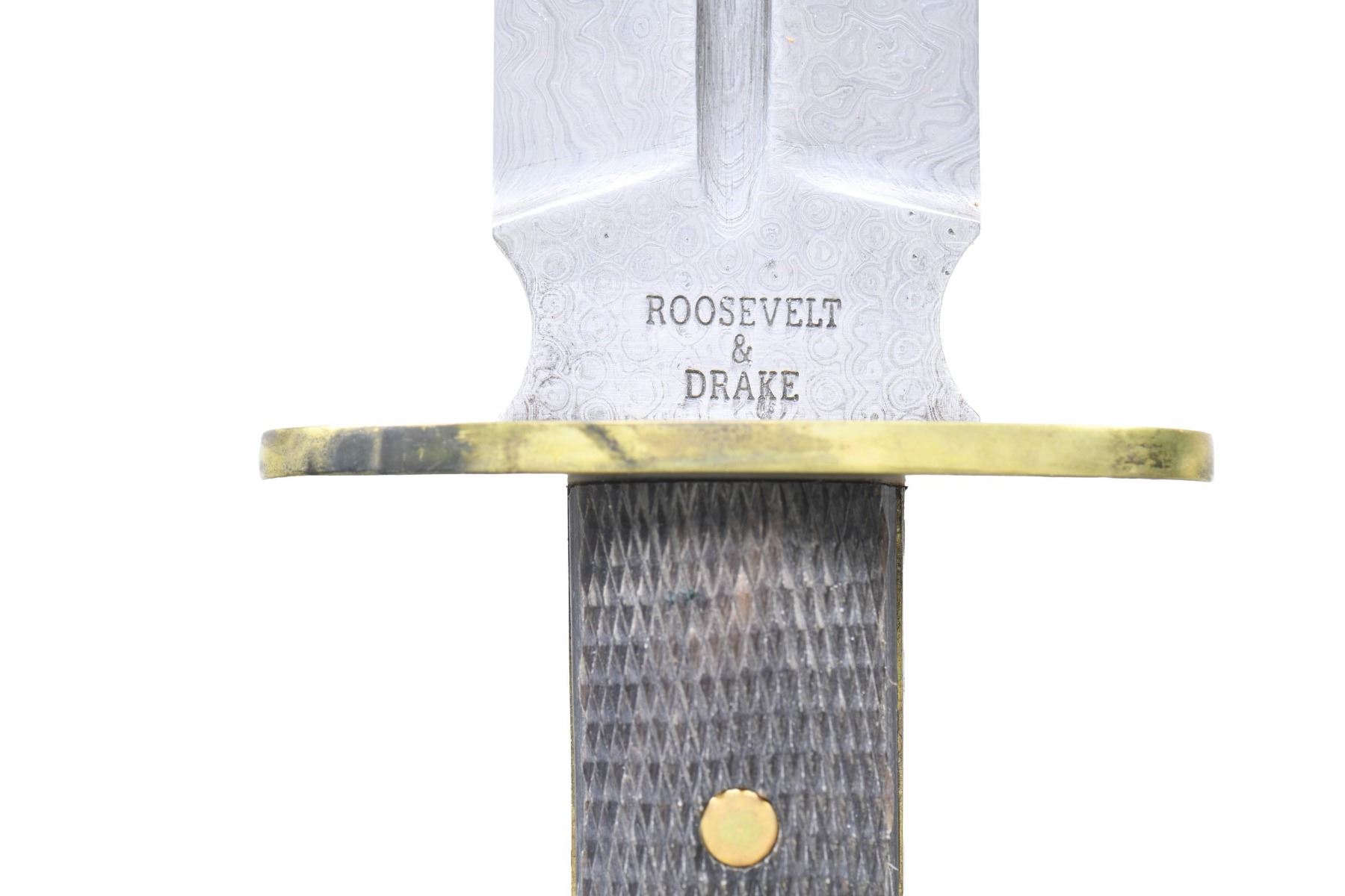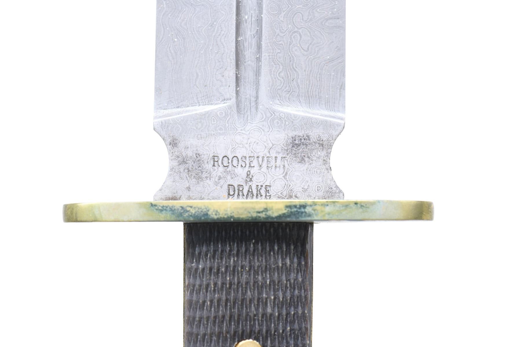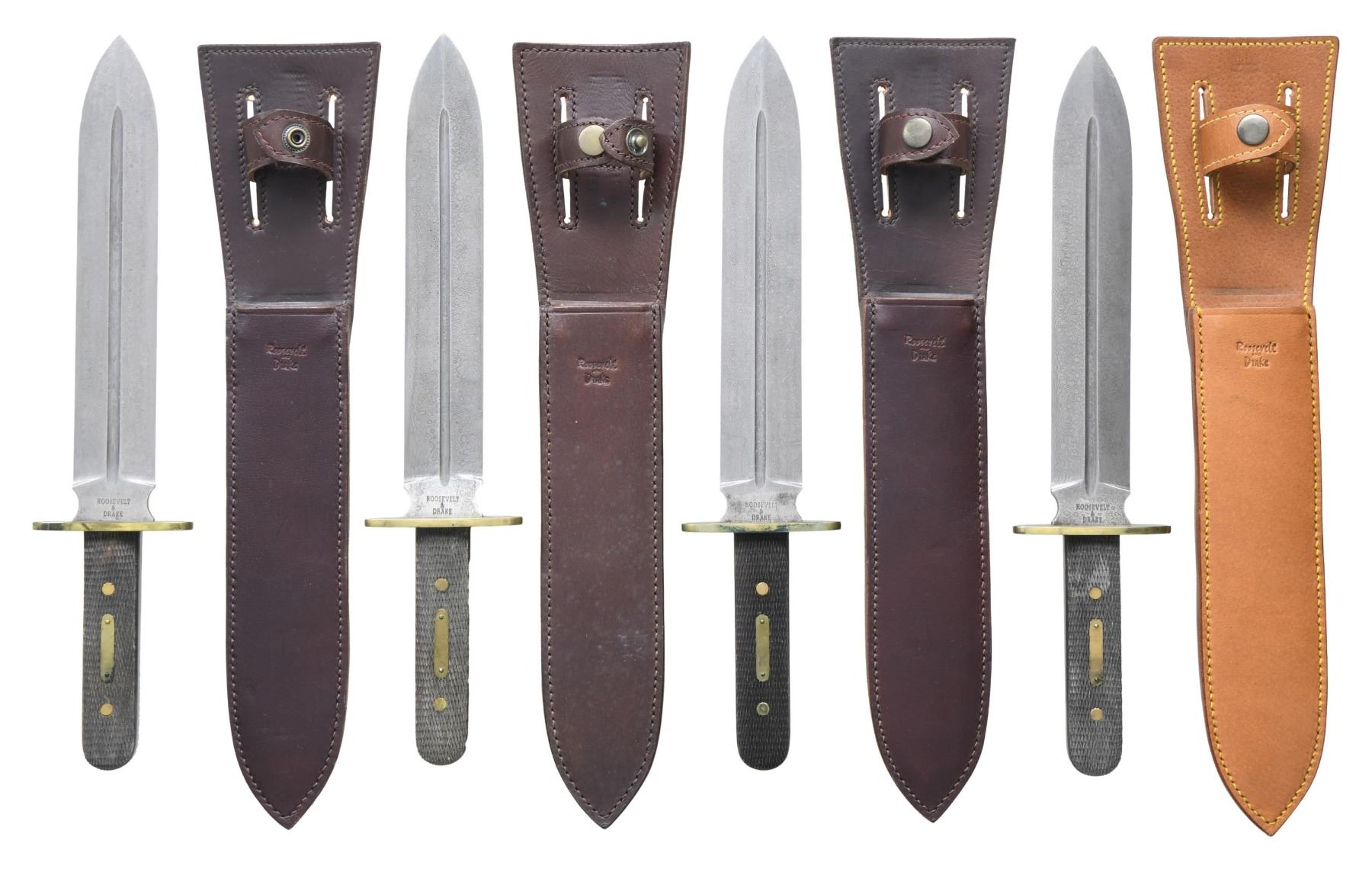 This lot contains 4 stunning Damascus steel, double-edged, spear point camp knives reproduced by Roosevelt and Drake from a pattern out of the 1925 Manton "Centenary" Catalogue. The knives were forged entirely by hand by their own old world craftsmen and should not to be confused with cheap "Damascus" looking knives on the market. The knives measure 15 1/4" in the sheath. The blades are 9 1/4" in length and a sturdy 1 1/2" in width with the ricassos stamped "ROOSEVELT & DRAKE". The hilts are 4 5/8" in length with 2-piece checkered buffalo horn grips. The heavy oval shaped guards are made of brass, as are the rivets securing the grip and the escutcheon plates on the front grip. This style knife is an ideal companion to carry in the bush for general camp use, light wood chopping, and, of course, for defense. These fine bladed weapons are equipped with their own custom leather sheaths, also boldly marked "Roosevelt & Drake". CONDITION: like new with only storage wear. PROVENANCE: from the renowned collection of quality sporting arms from Lewis Drake together with inventory of Lewis Drake Associates. (02-23573-9/BF). $800-1,200.