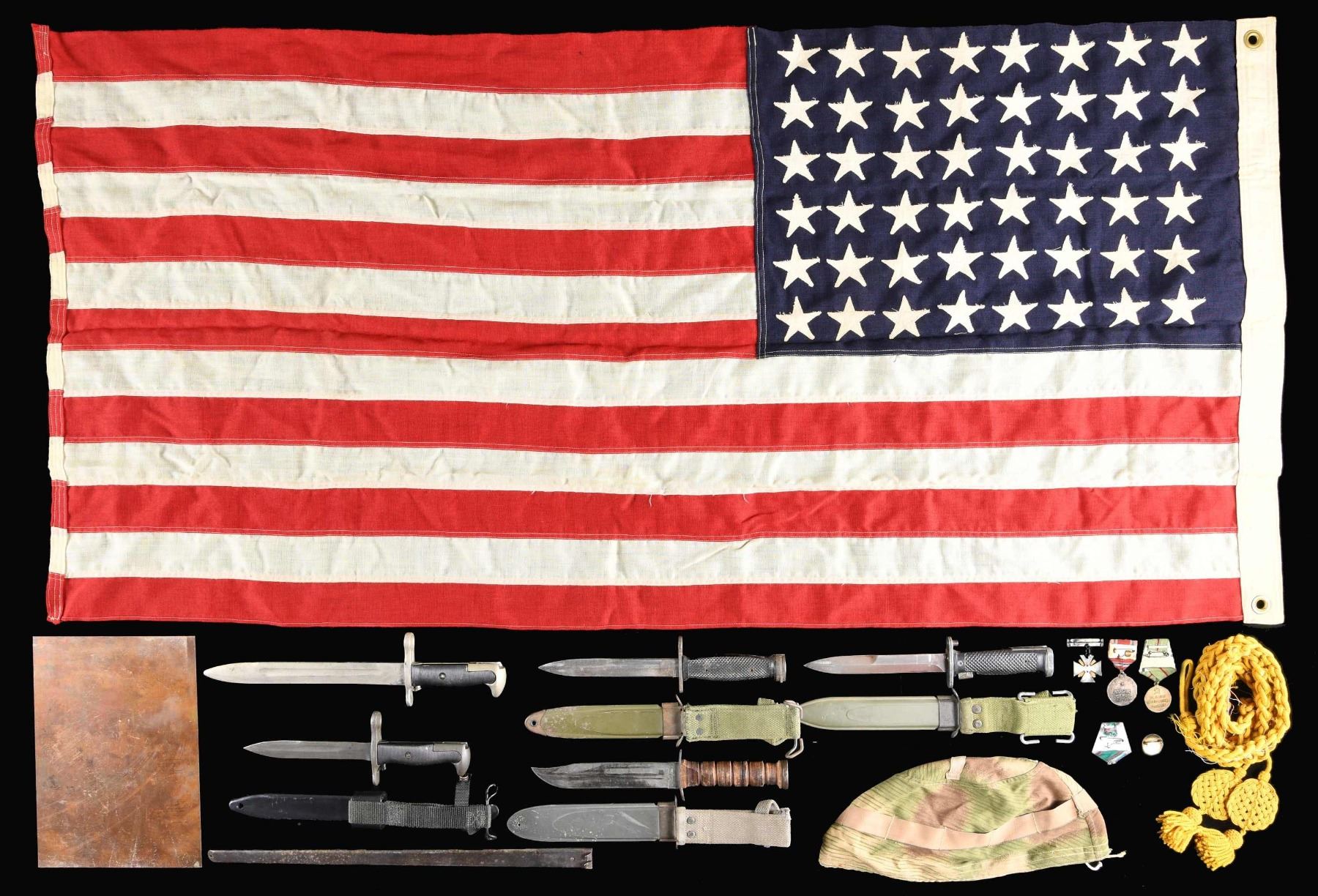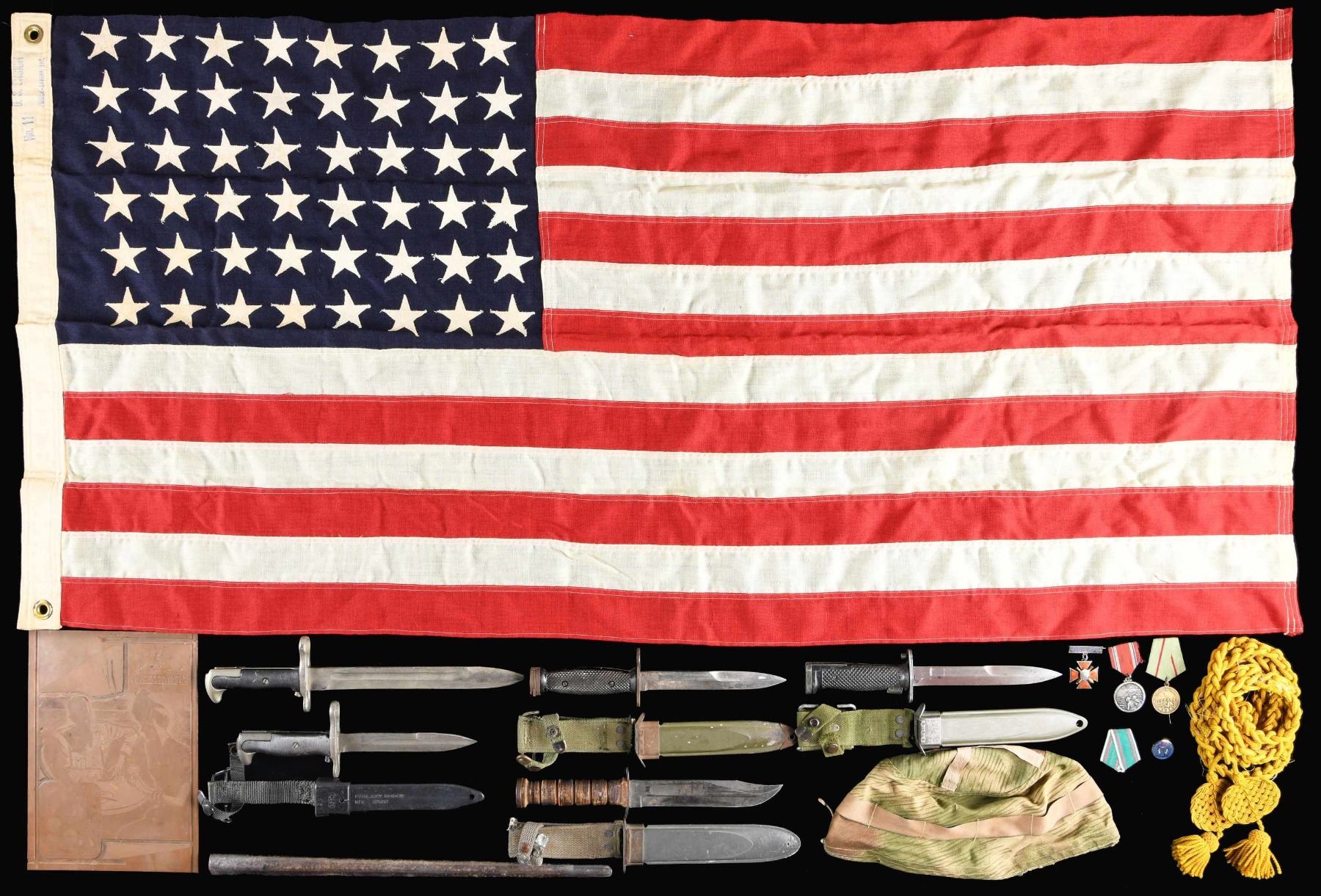 This lot consists of 1 / US M4 bayonet with an M8A1 scabbard. 1 / US M5A1 bayonet with a M8A1 scabbard. 1 / US M1 bayonet in a M10 plastic scabbard. 1 USN MK2 fighting knife with a MK2 scabbard. 1 / Nickel plated M1 bayonet without scabbard. 1 / US 48 star flag measuring approx 29' x 58". 1 / Copper plate printing block likely from a newspaper showing a soldier with his wife/girlfriend having a drink with the caption "A Toast TO THE MEN IN UNIFORM.. OUR AMERICAN SOLDIERS". 1 / US 45-70 bayonet scabbard with missing belt loop. 1 / Late 1900s Providence Marine Corps of Artillery commemorative medal. 3 / Russian medals/pins. 1/ North Korean medal with the incorrect ribbon. 1 / European camouflage helmet cover. 1 / Partial Indian Wars Cavalry aigulette.CONDITION: all items show light to moderate wear. (02-24500-4/BF). $300-500.
