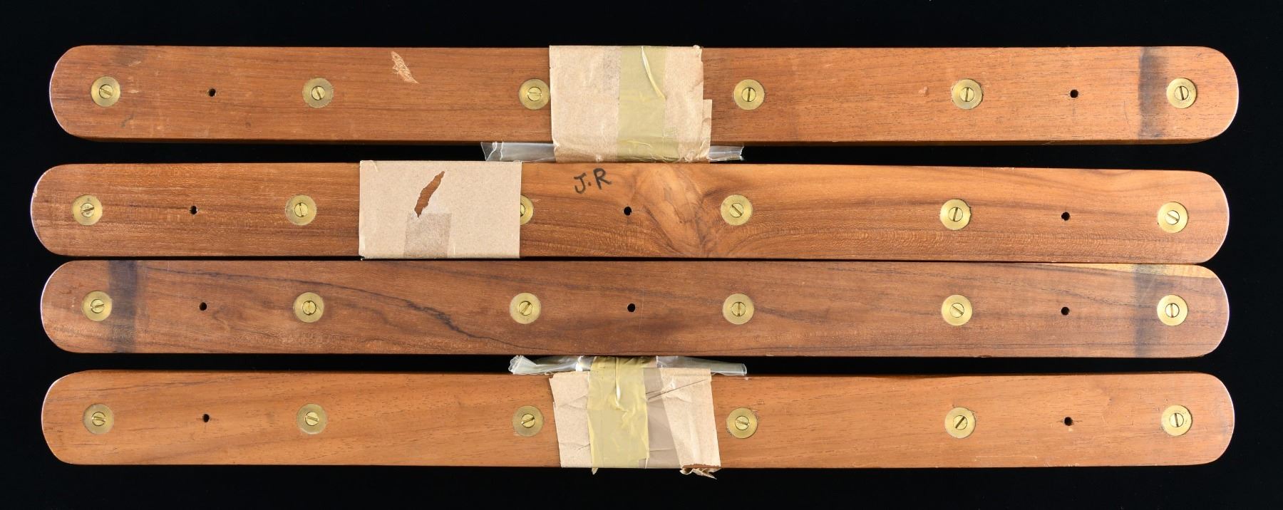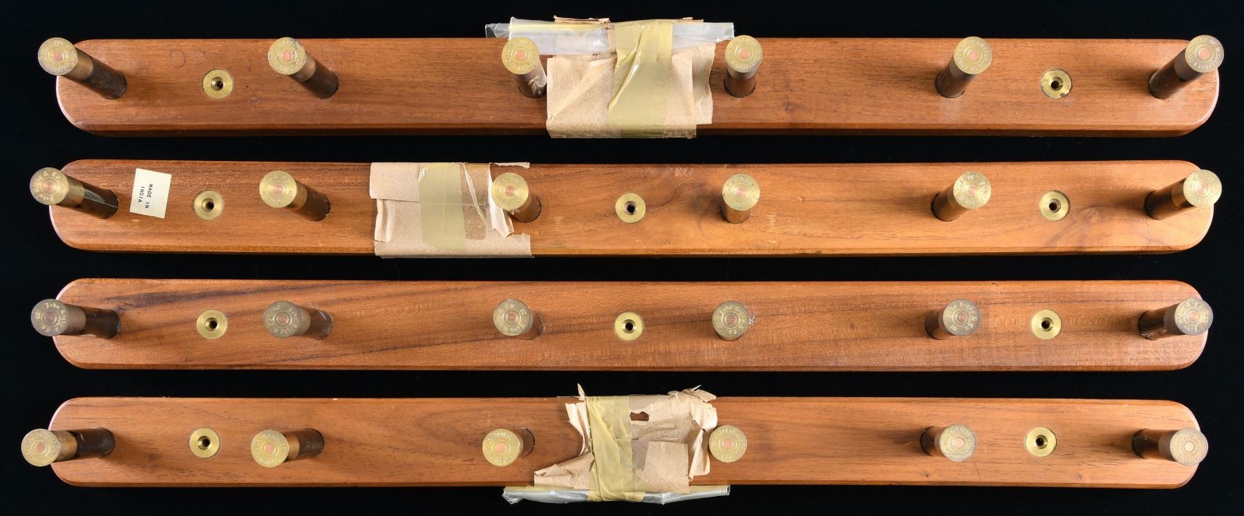 These pegboards would be ideal for a trophy room, gun room, or man cave. They are made of fine teakwood and measure approx. 26" in length and 2" in height. Each peg protrudes 2 1/2" from the board and is made of finely crafted buffalo horn with a brass cap resembling the base of a shotgun shell. Each board has 6 evenly spaced pegs. CONDITION: these pegboards are unused but do show storage wear. PROVENANCE: from the renowned collection of quality sporting arms from Lewis Drake together with inventory of Lewis Drake Associates. (02-23565-22/BF). $150-350.