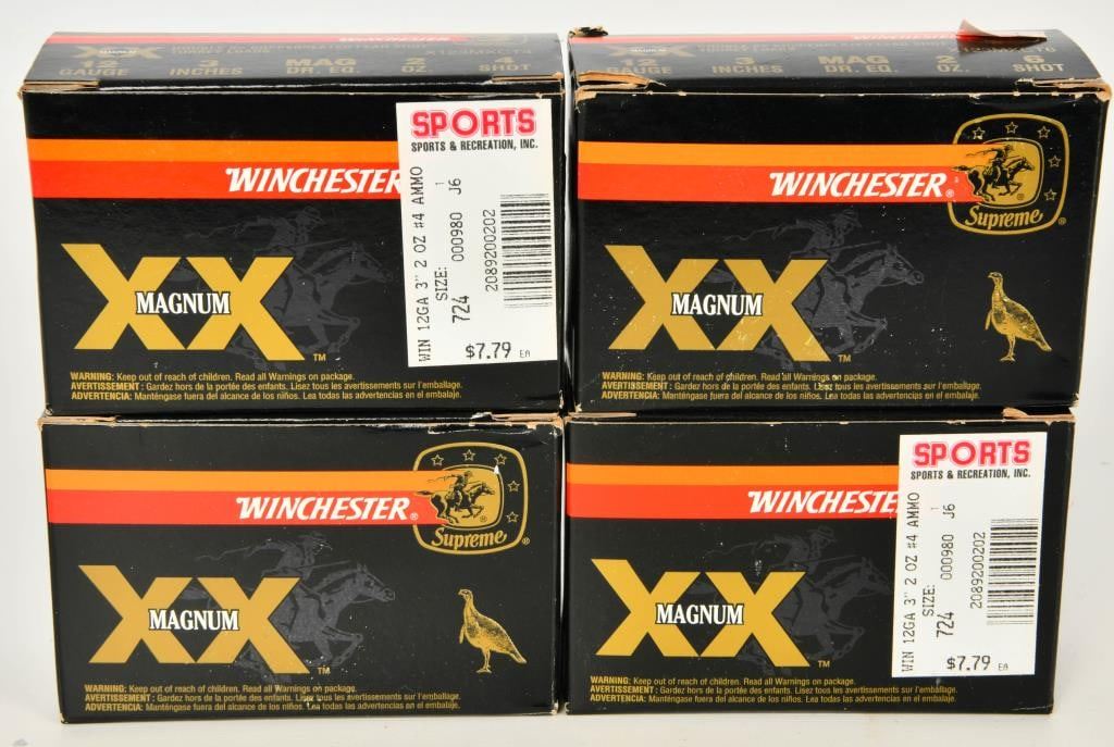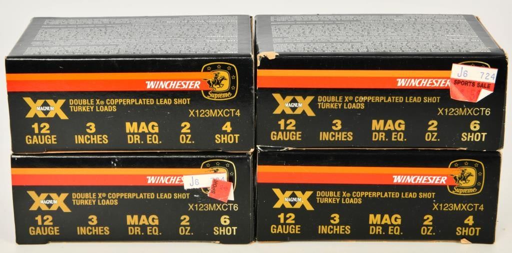 lot contains 4 boxes or 40 rounds of the Winchester Double X Copperplated Lead shot Turkey loads- 12 gauge 3 inches MAG DR EQ and 2 oz 4 shot, the double x is apparently the MAGNUM load, Winchester is showing this box as SUPREME, so lets say SUPREME MAGNUM turkey load?? happy bidding guys!
