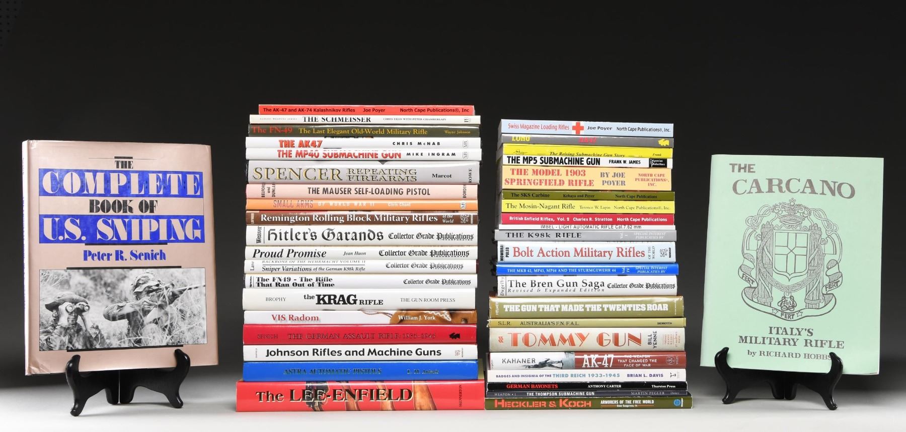 BOOKS. 1) The German Assault Rifle: 1935-1945 by Peter Senich. 2) VIS Radom by William York. 3) The Krag Rifle by William Brophy. 4) The FN-49 by Blake Stevens; Collector Grade Publications. 5) Backbone of the Wehrmacht Volume II: Sniper Variations of the German K98K Rifle by Richar Law; Collector Grade Publications. 6) Proud Promise by Jean Huon; Collector Grade Publications. 7) Remington Rolling Block Military Rifles of the World by George Layman. 8) Small Arms of World War II by Chris Chant. 9) Johnson Rifles and Machine Guns by Bruce Canfield. 10) The SKS Carbine by Joe Poyer. 11) The Model 1903 Springfield Rifle and its Variation by Joe Poyer; fair condition with water damage. 12) Swiss Magazine Loading Rifles by Joe Poyer. 13) Propaganda Series Vol. I: The K98K rifle. 14) Propaganda Series Vol. IV: The MKb 42, MP43, MP44 and the Sturmgewehr 44. 15) The Mosin-Nagant Rifle by Terence Lapin 4th Edition. 16) AK 47 by Duncan Long. 17) German Bayonets by Anthony Carter. 18) Badges and Insignia of the Third Reich 1933-1945 by Brian L Davis. 19) AK-47 by Larry Kahaner. 20) Light Automatic Rifle Cal. 7.62mm by Imbel. 21) British Enfield Rifles Volume 2, 2nd Edition by Charles Stratton. 22) The Schmeisser Submachine Gun by Chris Ellis. 23) The Carcano by Richard Hobbs. 24) The Ak-47 and AK-74 Kalashnikov Rifles and their Variations by Joe Poyer. 25) Heckler & Koch by Gene Gangarosa, JR. 26) S.L.R. Australia's FN FAL by Ian Skennerton. 27) The Reisin Submachine Gun Story by Frank Iannamico 28) Bolt Action Military Rifles of the World by Stuart Mowbray. 29) Heckler & Koch's MP5 Submachine Gun by Frank James. 30) The BREN Gun Saga, Revised & Expanded by Dugelby; Collector Grade Publications. 31) Tommy Gun by Bill Yenne. 32) The Thompson Submachine Gun by Martin Pegler. 33) The Gun that made the Twenties Roar by William Helmer. 34) Hitler's Garands by Darrin Weaver; Collector Grade Publications. 35) The AK47 by Chris McNab. 36) The MP40 Submachine Gun by Mike Ingram. 37) The Complete Book of U.S. Sniping by Peter Senich. 38) The FN-49 by Wayne Johnson. 39) Spencer Repeating Firearms by Roy M. Marcot. 40) The Mauser Self-Loading Pistol by James Belford. 41) Astra Automatic Pistols by Leonardo Antaris; no dust cover. 42) The Lee-Enfield by Ian Skennerton. CONDITION: unless stated above, books appear in generally good intact condition showing light reading wear. (02-24543/MD). $300-500