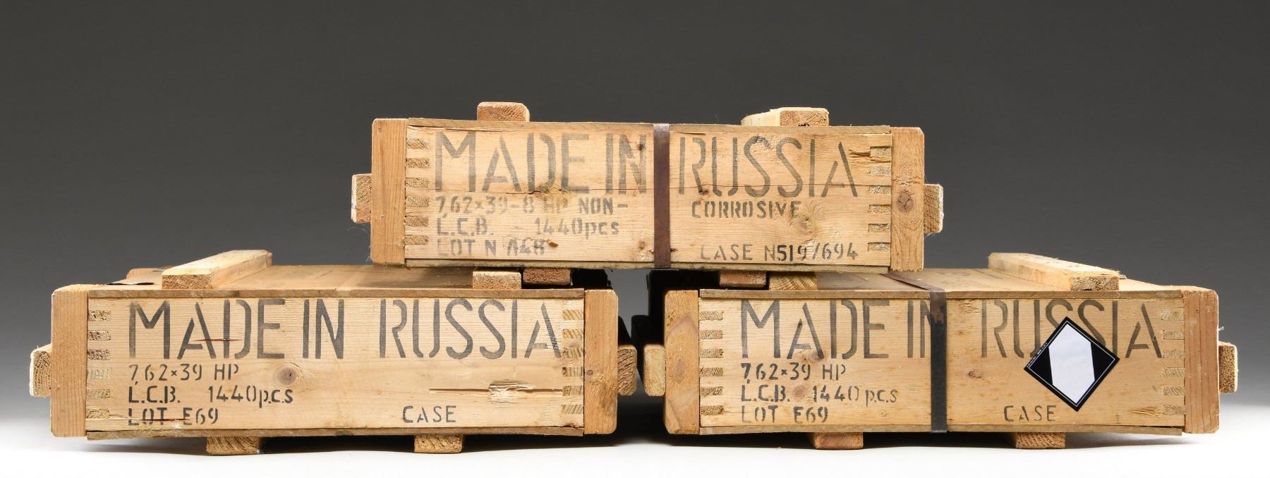 HUNTING AMMUNITION. Lot contains hollow points. Ammunition in 20 rd. white paper boxes is contained in 3 wooden cases. One case has been opened the other two are sealed. The cartridges are steel cased and loaded with corrosive primers and lead core hollow point bullets. Box labels state the ammo is "Made to hunting specifications". CONDITION: crates,boxes and ammunition in very good condition. (02-24270-3/RW). AMMO. $800-1,200.