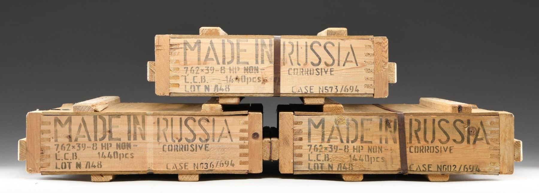 Lot contains hollow points. Ammunition in 20 rd. white paper boxes is contained in 3 wooden cases. One case has been opened the other two are sealed. The cartridges are steel cased and loaded with corrosive primers and lead core hollow point bullets. Box labels state the ammo is "Made to hunting specifications". CONDITION: crates,boxes and ammunition in very good condition. (02-24270-2/RW). AMMO. $800-1,200.