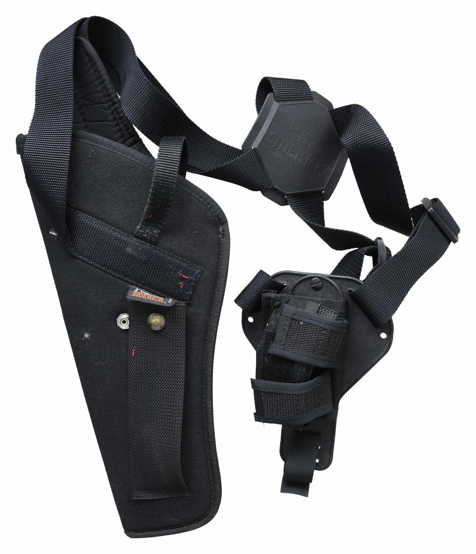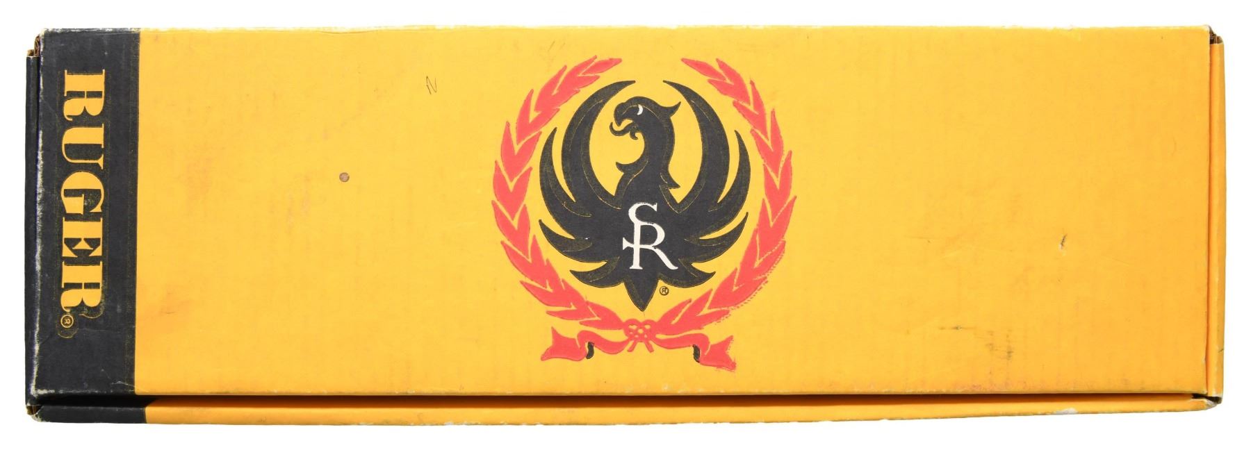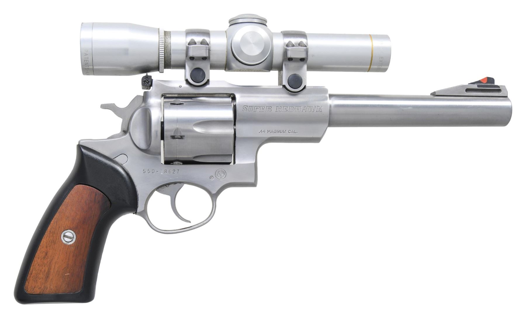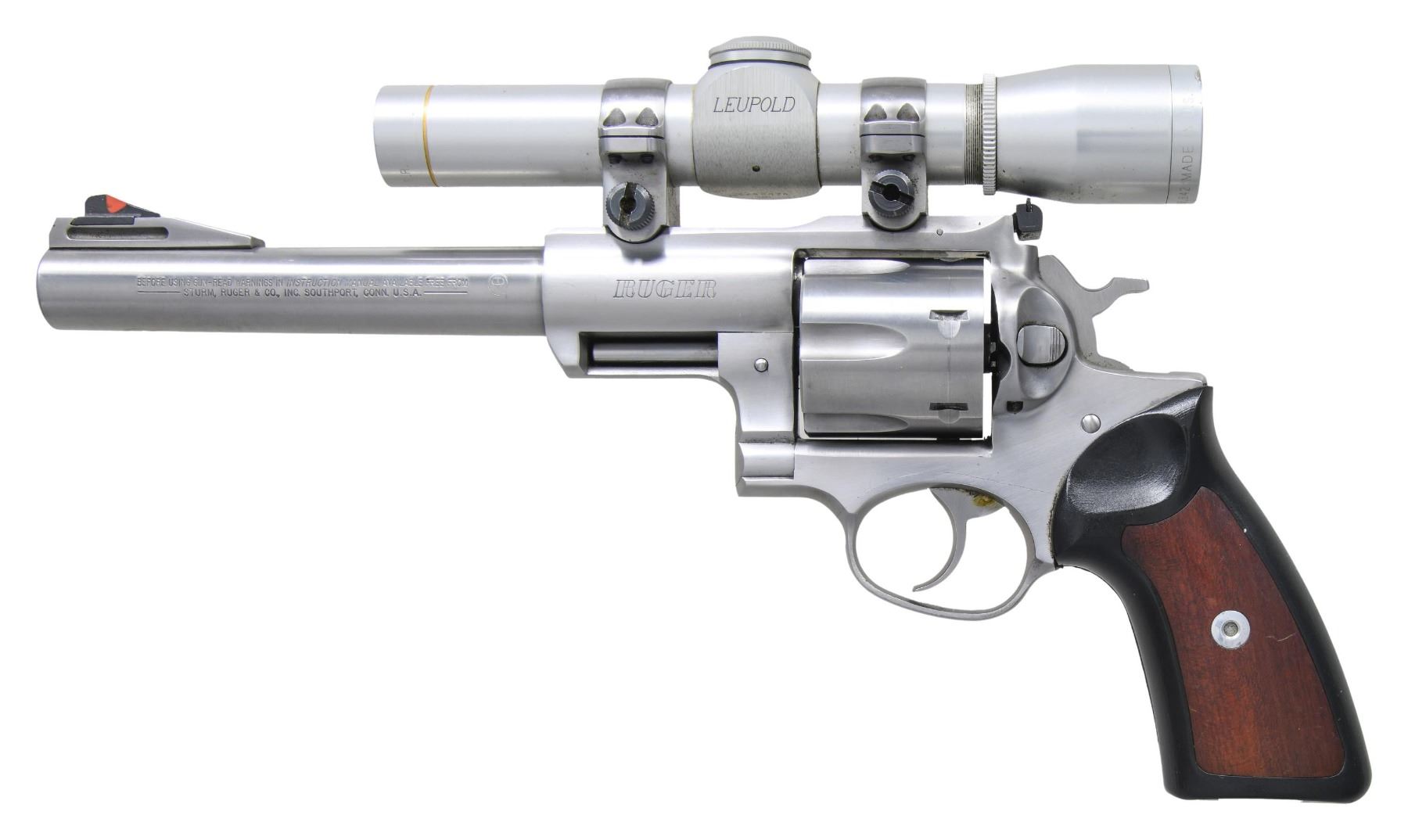 LEUPOLD SCOPE, FACTORY BOX & HUNTING HOLSTER. Cal. 44 Mag. S# 550-18627. Mfg. 1988 as Catalog No. KSRH-7; Model 05501. Bbl. 7.5". Orange insert ramp dovetailed front sight & adj. rear sight. Satin stainless finish w/ integral bases for Ruger rings. Leupold silver M8 2x EER scope with duplex reticle on Ruger rings. Fluted 6 shot cyl. Rubber Monogrip with walnut panels. UNATTACHED ACCESSORIES: appropriate yellow & black factory box with paperwork. Uncle Mike's Sidekick black nylon rig includes pouch for 2 speed-loaders & holster. CONDITION: revolver has very good to near excellent overall appearance showing light handling marks. Bright bore with strong rifling. (25-1669/MD). MODERN. $500-800.