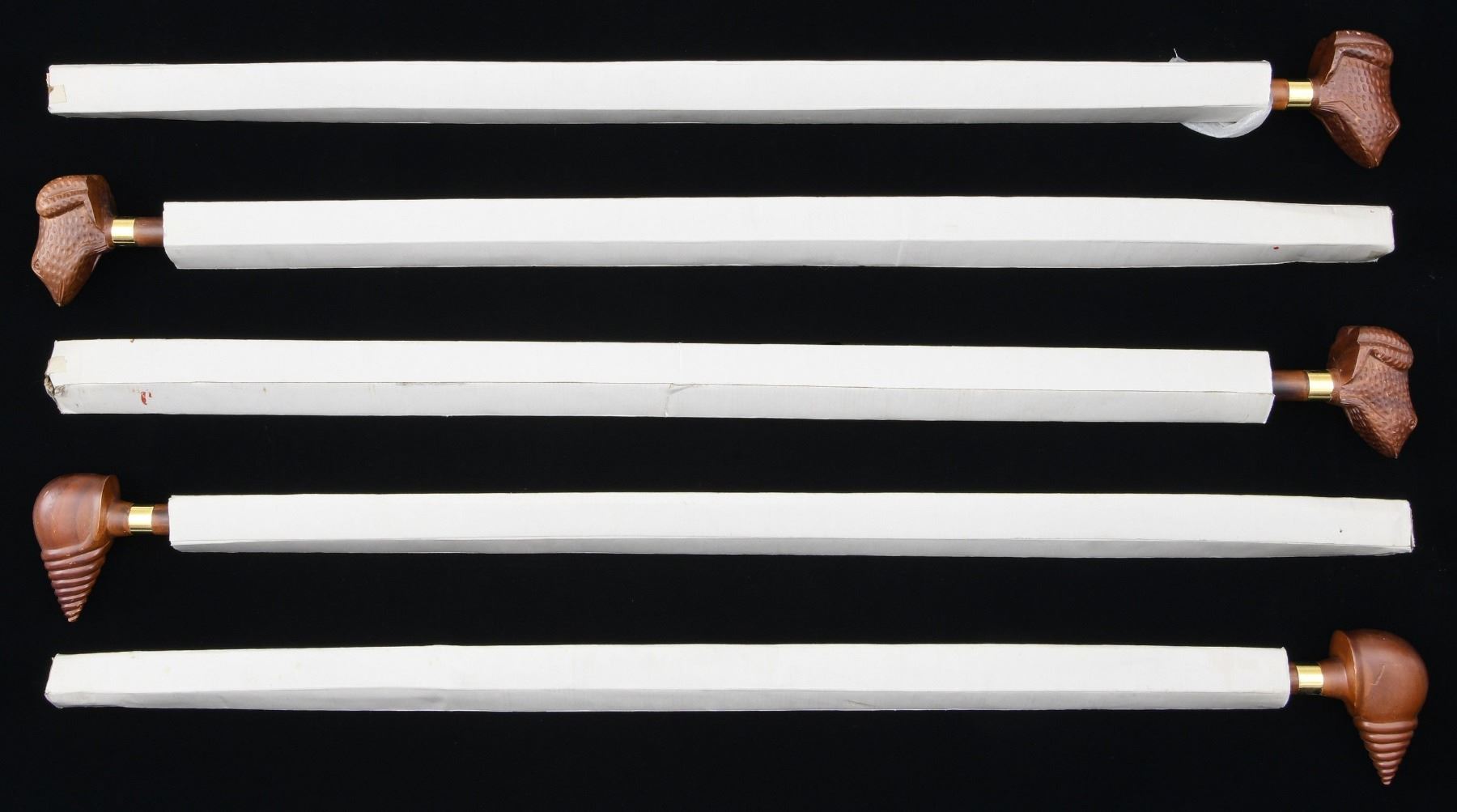 DRAKE. These carved wooden walking sticks average 36" in length and have a rubber tip at the base. The heads are carved to represent a frog (3) and a sea shell (2). Below the hand piece is a 5/8" gilded ferrule. CONDITION: items are new but show some scuffs and scrapes from storage wear. PROVENANCE: from the renowned collection of quality sporting arms from Lewis Drake together with inventory of Lewis Drake Associates. (02-23565-14/BF). $150-350.