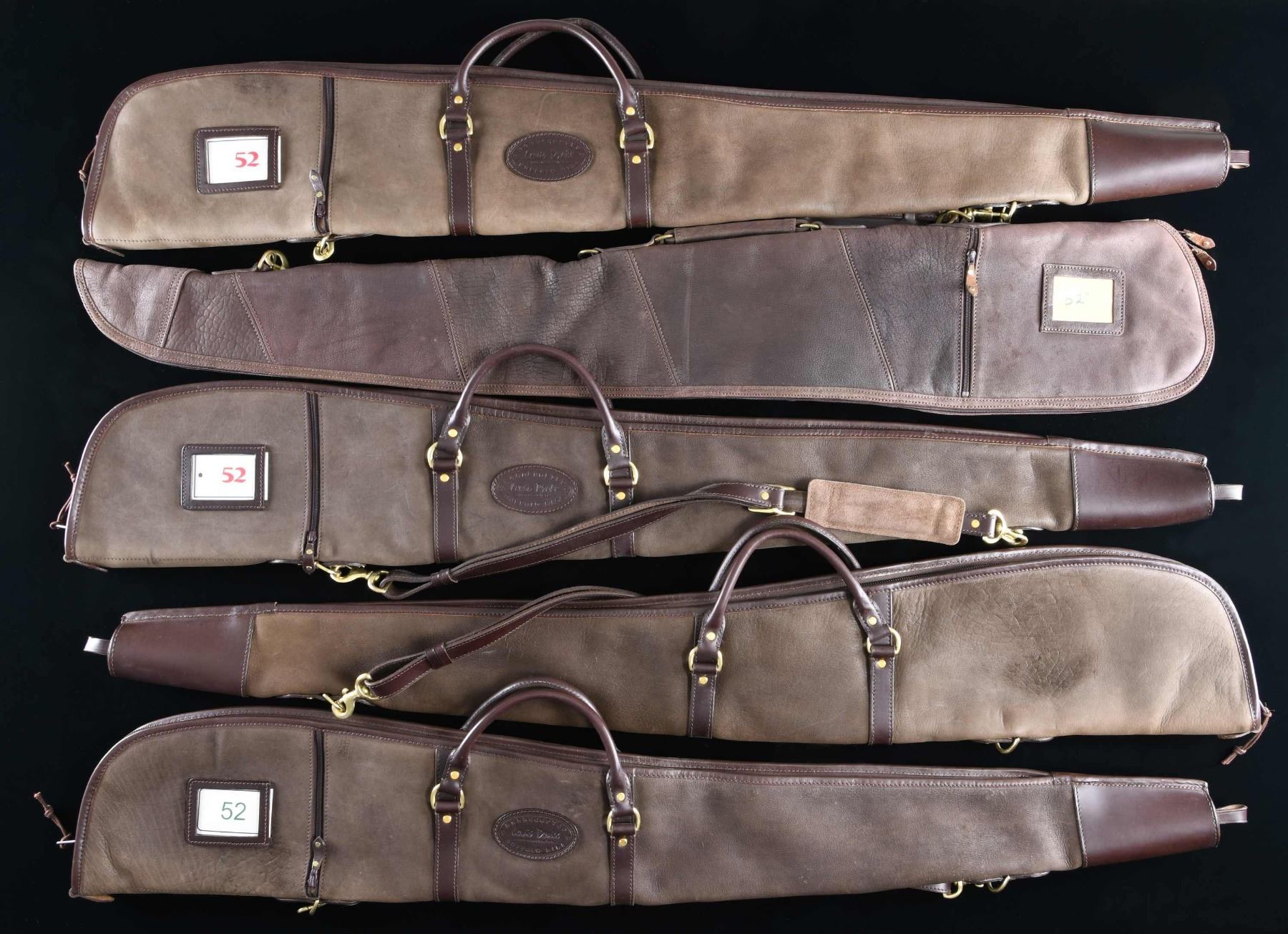 These 52" gun cases are made of water buffalo hide and have two looped handles in the center for carrying and a shoulder sling with heavy brass D-rings and spring catches. The interior of each case is lined with fleece to protect your most valued shotguns and rifles. A large impressed oval label on the front reads "HAND CRAFTED Lewis Drake AND ASSOCIATES BUFFALO HIDE". These cases are some of the finest quality gun cases ever produced and worthy of the finest weapons. CONDITION: these cases are new but do show some very slight storage wear. PROVENANCE: from the renowned collection of quality sporting arms from Lewis Drake together with inventory of Lewis Drake Associates. (02-23565-24/BF). $300-600.