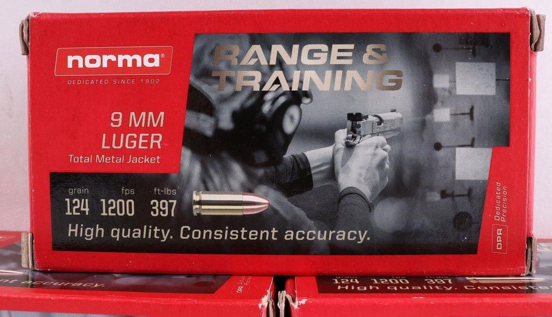 Ten boxes containing 50 rounds each of Norma, Range and Training, 9mm Luger, 124 grain, Total Metal Jacket ammunition. This lot has a reserve.