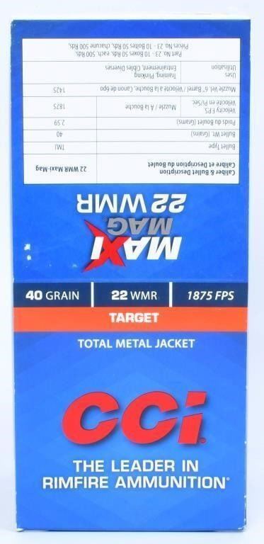 22 Winchester Magnum Rimfire (WMR) 40 Grain Total Metal Jacket has been loading rimfire ammunition since 1962 and is known in the shooting sports as a one of the leaders in rimfire ammunition. CCI has made a reputation for delivering reliable ammunition that delivers exceptional performance time after time. The 40 grain bullet is great for the backyard plinker or competition shooter. This is very accurate, consistent ammunition that are loaded to ideal velocities for best performance.