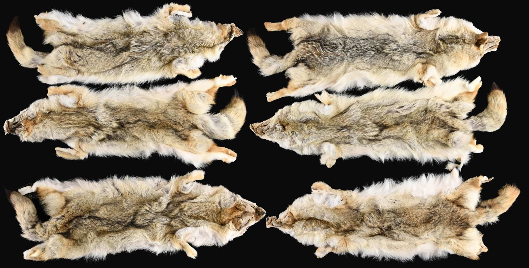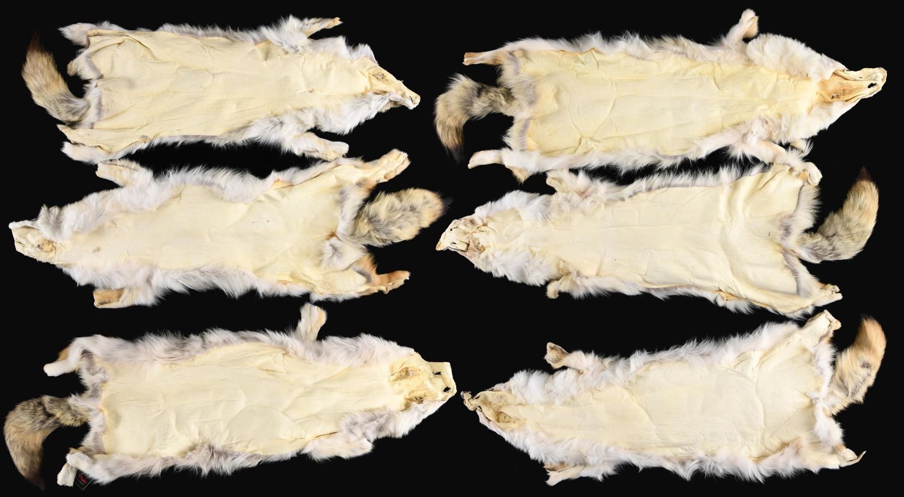 These pelts measure approx. 56" from nose to tail. The fur is grayish white with black and brown streaks. CONDITION: pelts are clean, fresh, and not shedding. PROVENANCE: from the renowned collection of quality sporting arms from Lewis Drake together with inventory of Lewis Drake Associates. (02-23565-60/BF). $200-350.